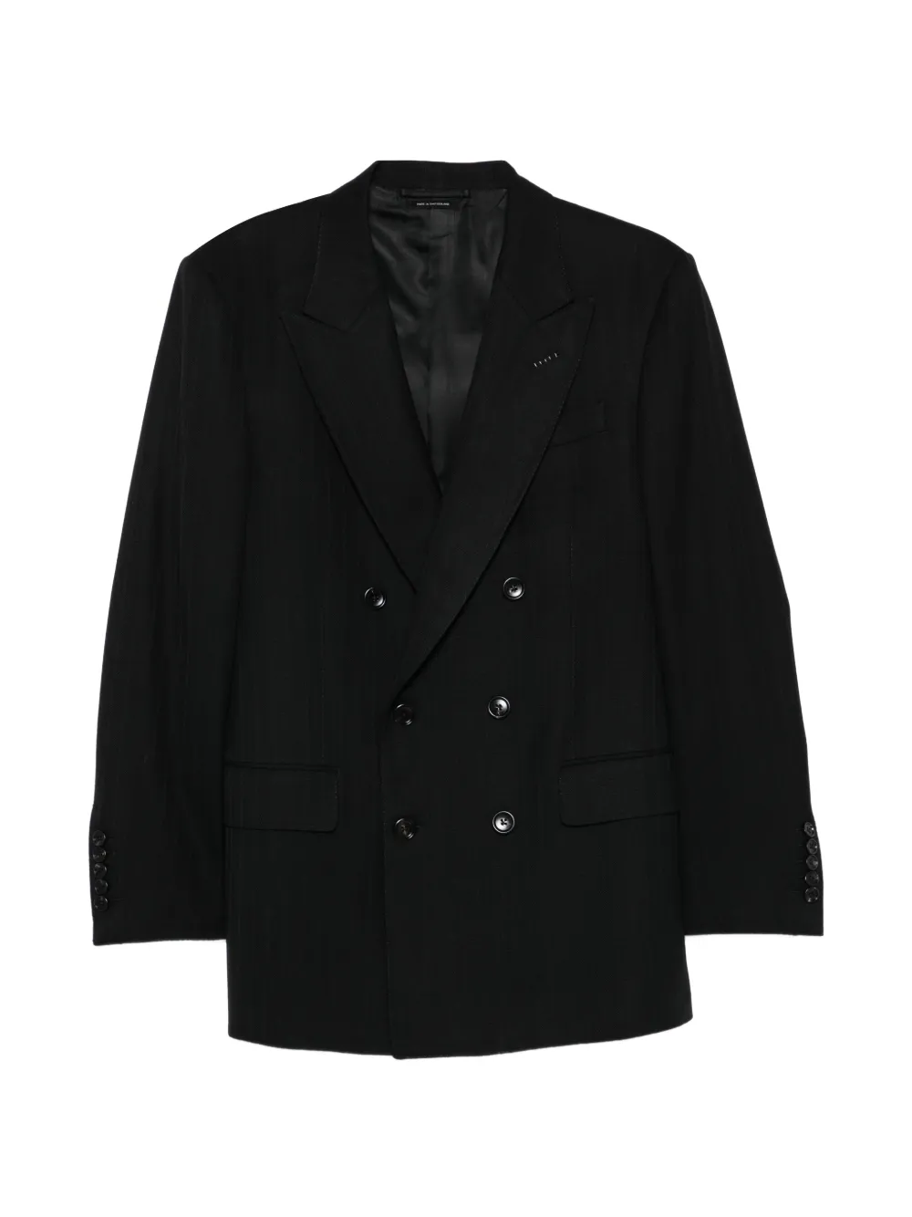 Sacou TOM FORD Double-Breasted Pnstripe negru, realizat din lana, cu rever crestat, inchidere cu nasturi dubli, maneci lungi, buzunar welt la piept si buzunare laterale cu clapeta, grafica Pinstripe in tesatura si tiv drept. Potrivit pentru sezonul primavara/vara. 100% lana; 59% cupro; 41% matase.