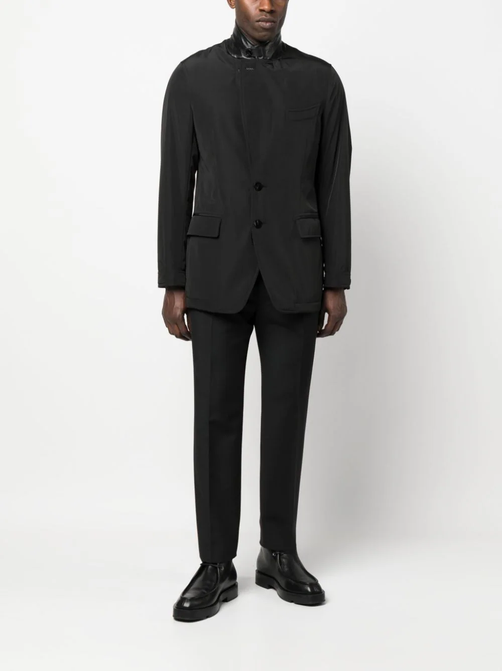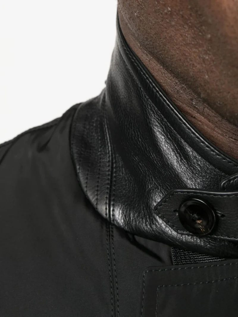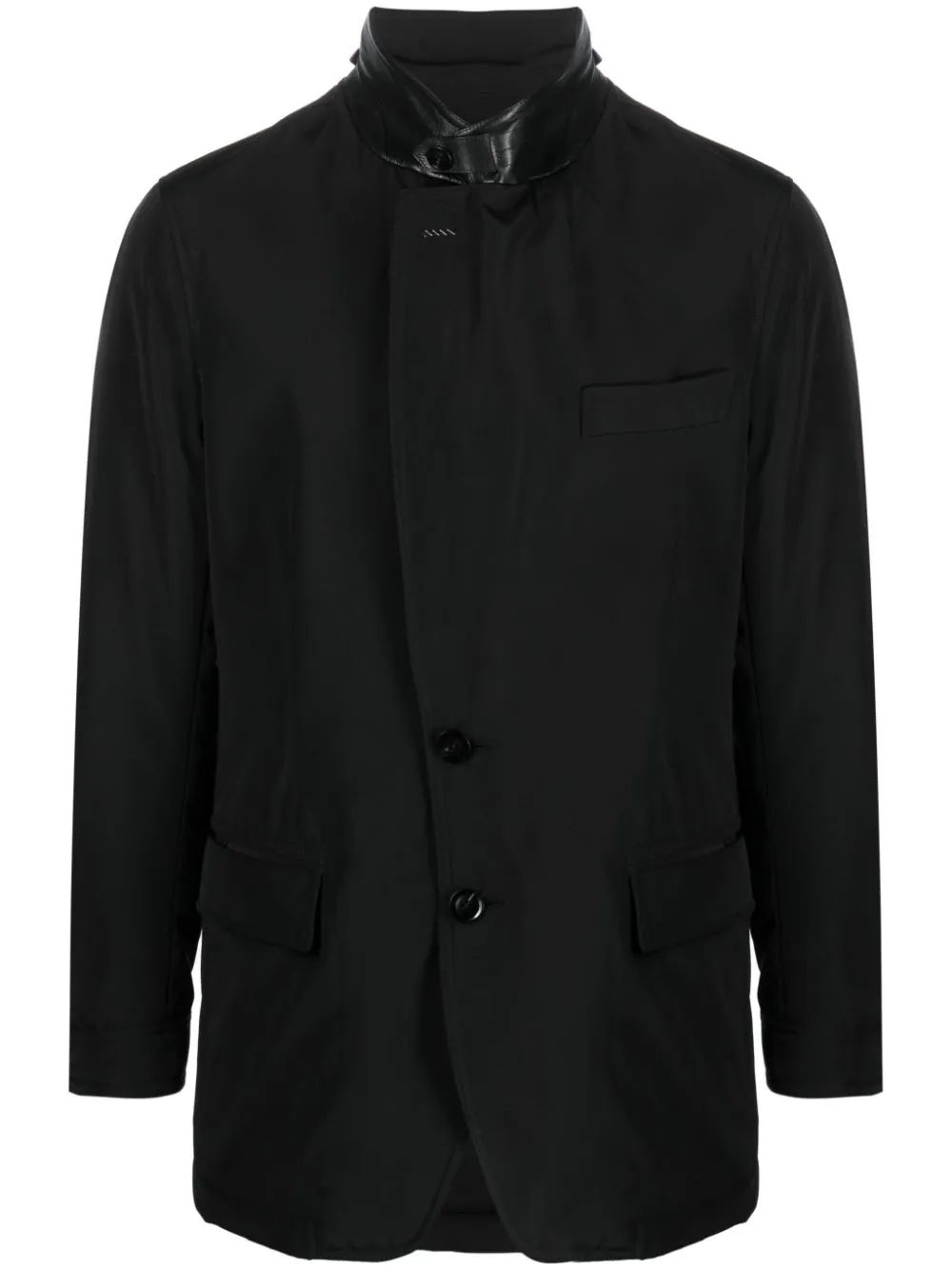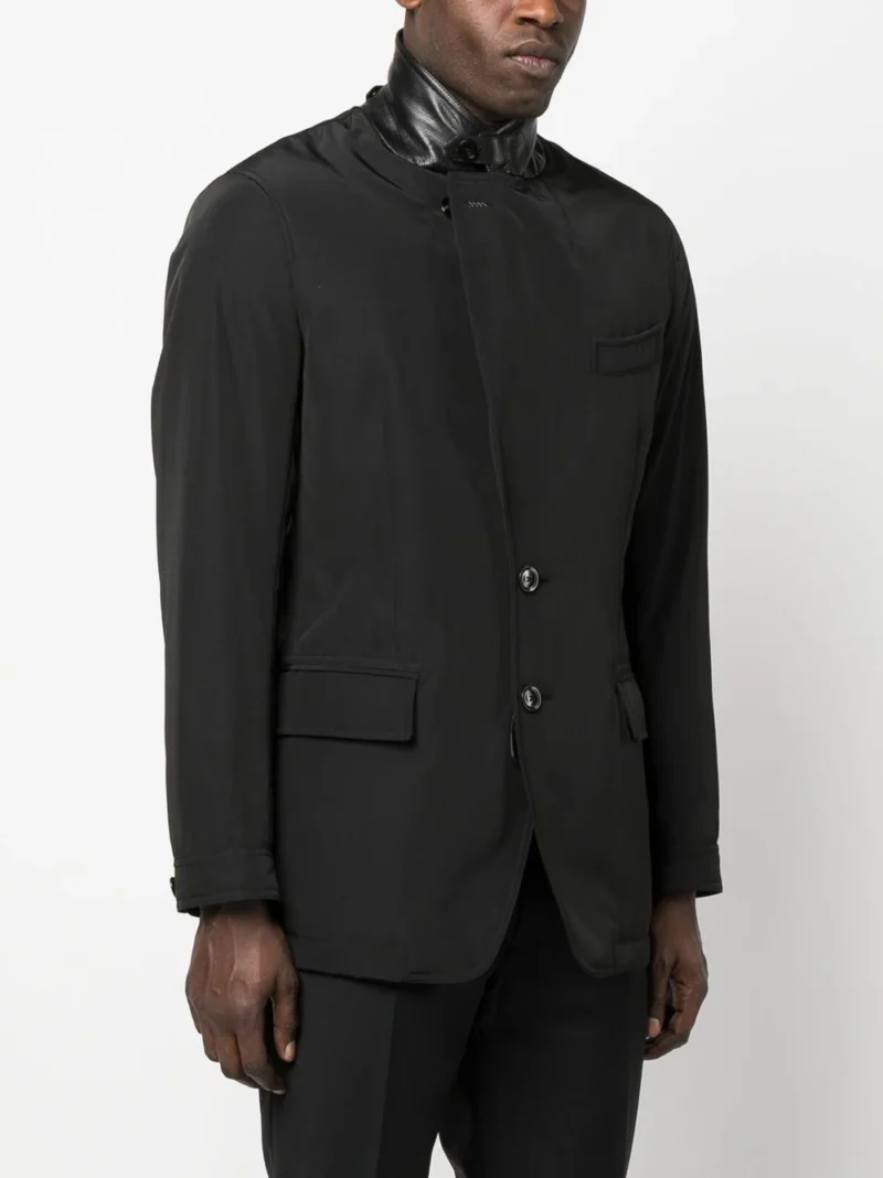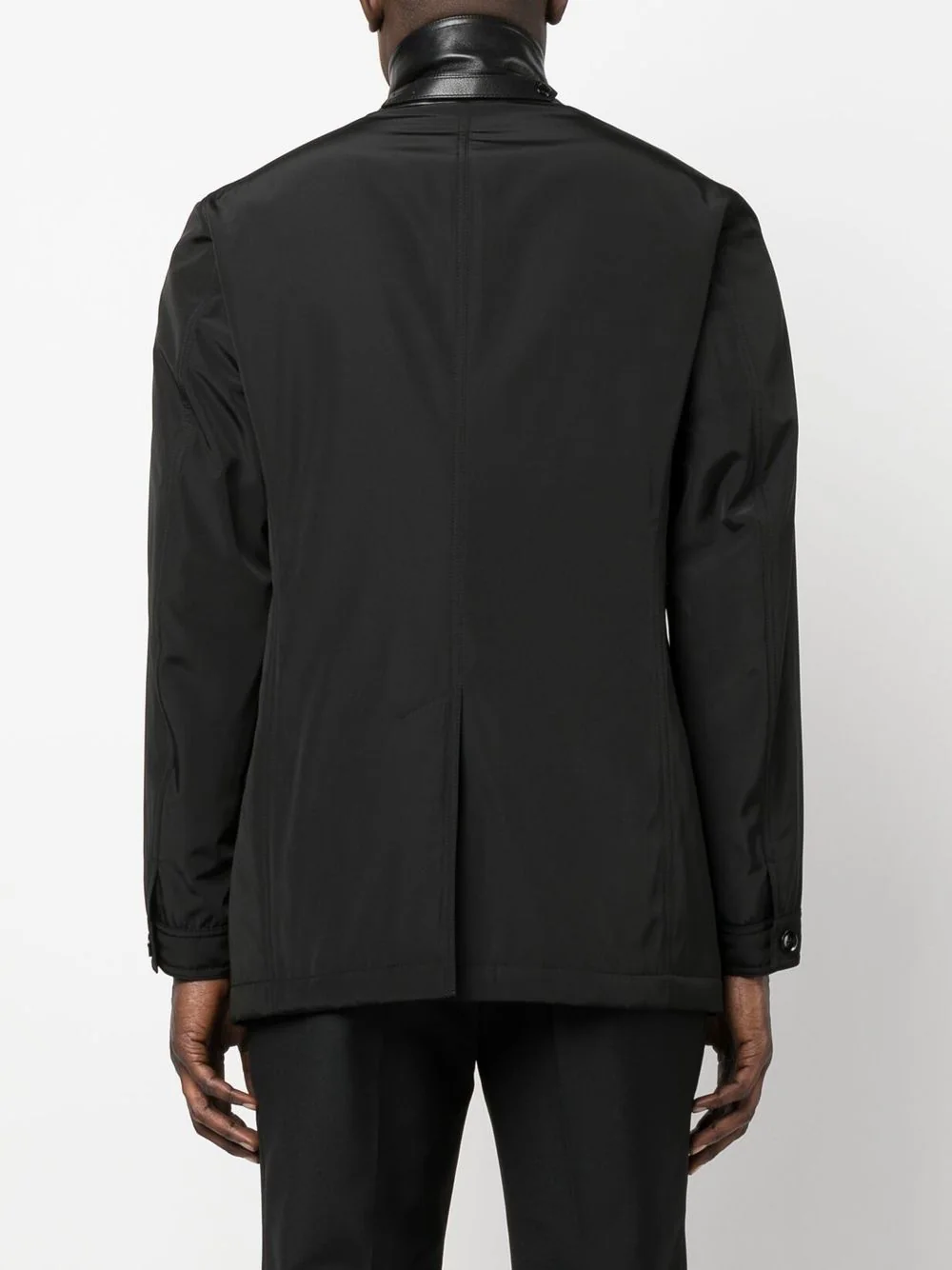 Sacou TOM FORD Leather-Trim Single-Breasted negru, din poliester, decorat cu guler inalt din piele, inchidere cu nasturi, maneci lungi, mansete cu nasturi, buzunare laterale, buzunare tip welt la piept, captuseala din bumbac si ovatta si tiv drept. Potrivit pentru sezonul toamna/iarna. 100% bumbac; 100% cupro; 100% poliester; 100% poliester; 100% piele de vitel.