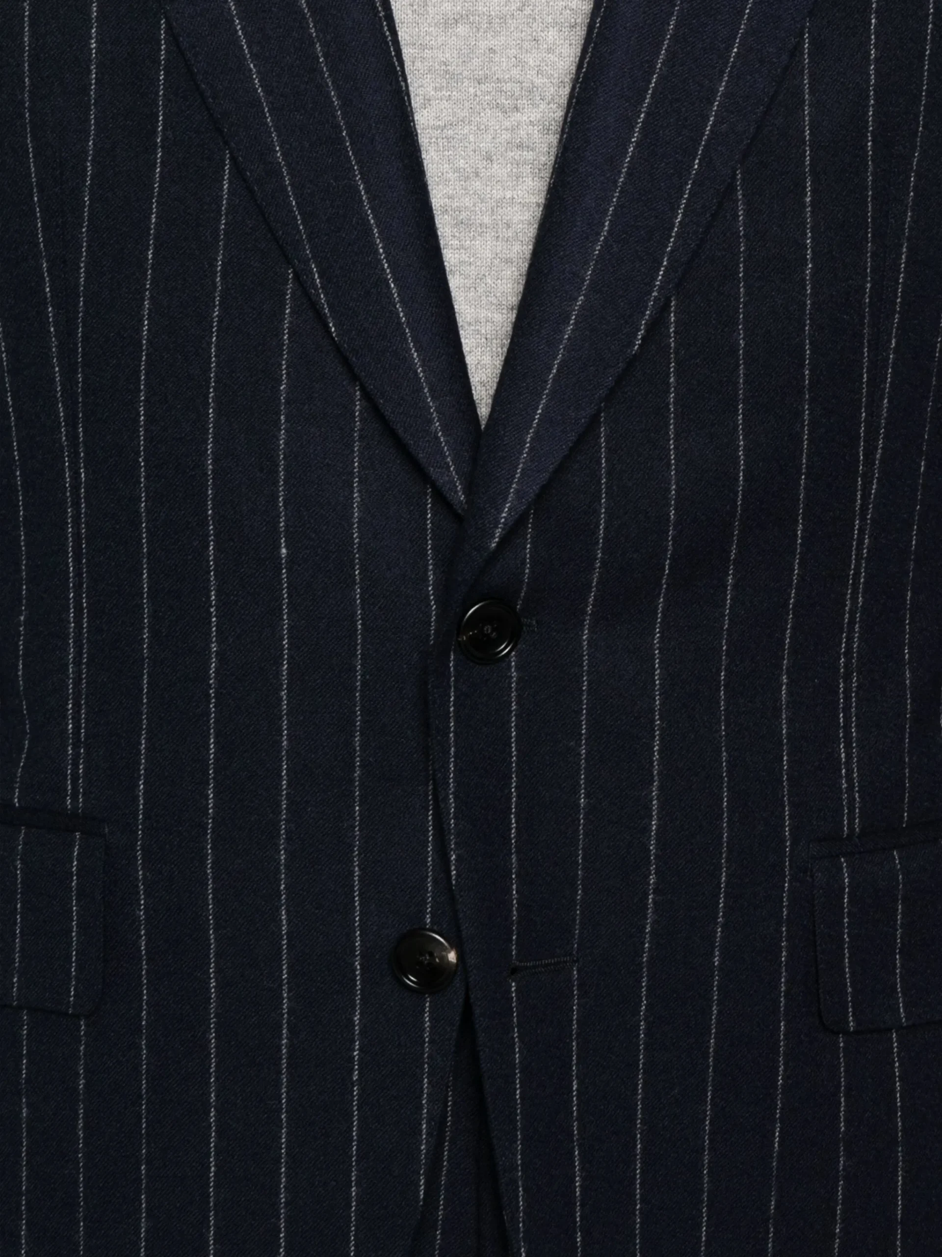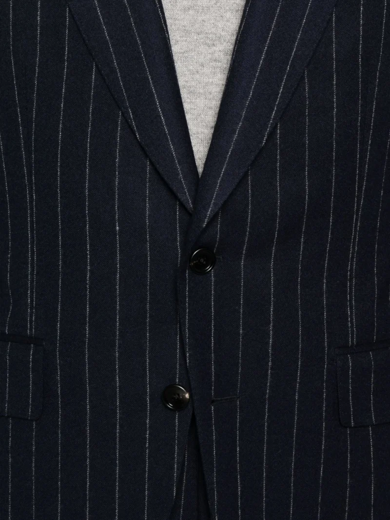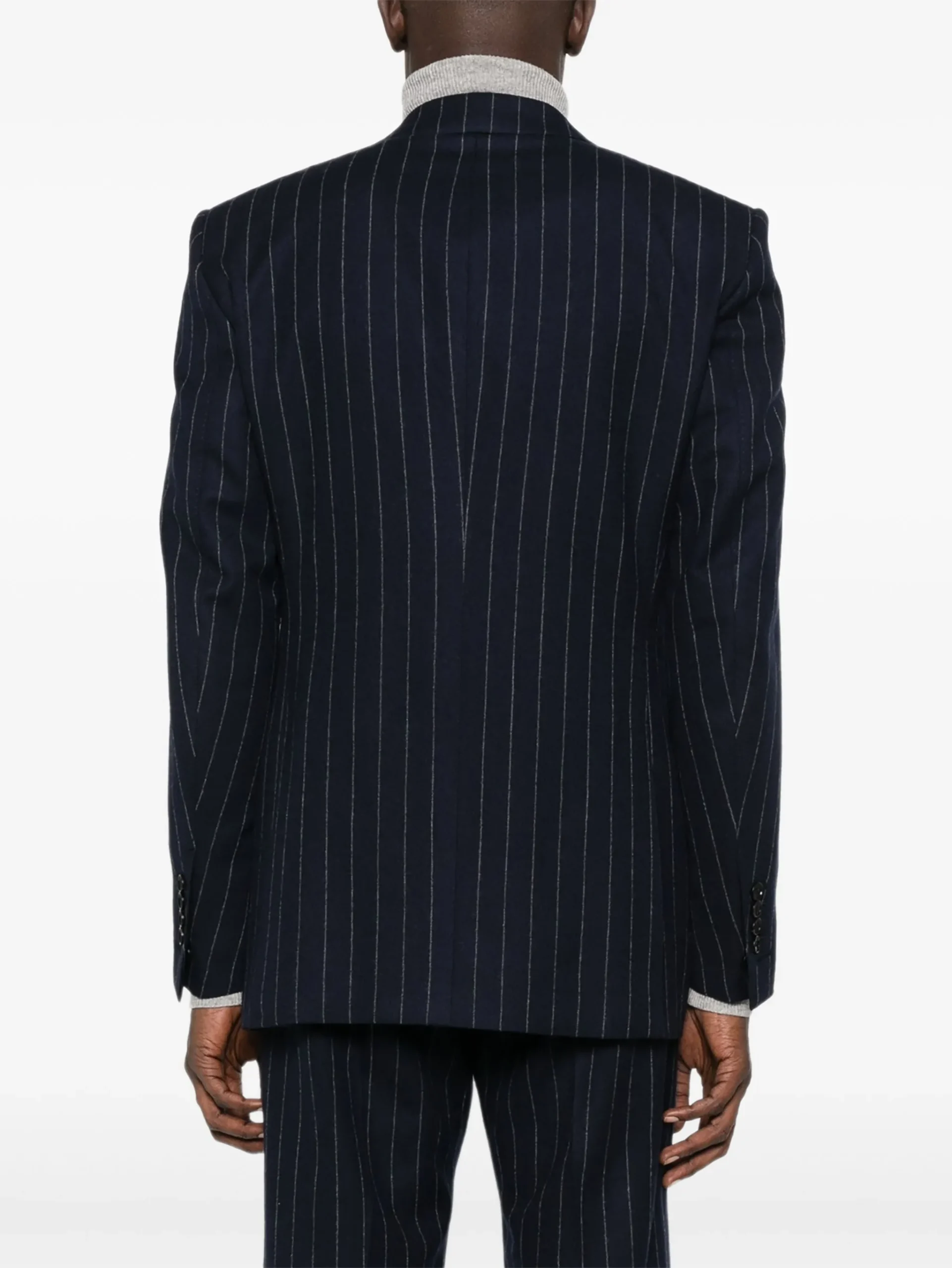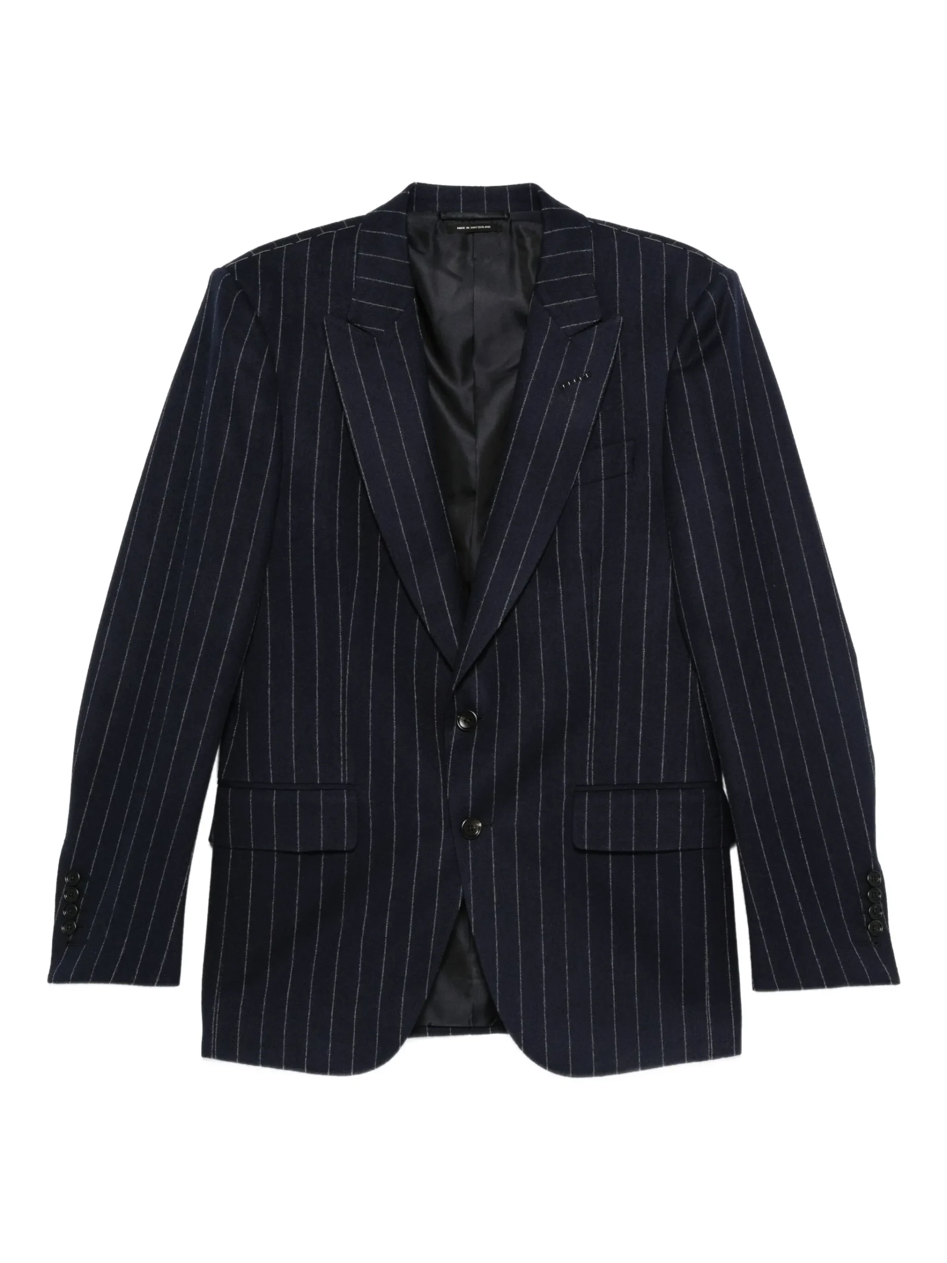 Sacou TOM FORD din lana albastra cu pinstripe, prevazut cu revere notched, inchidere cu doua butoane, buzunare welt si maneci lungi. 100% lana