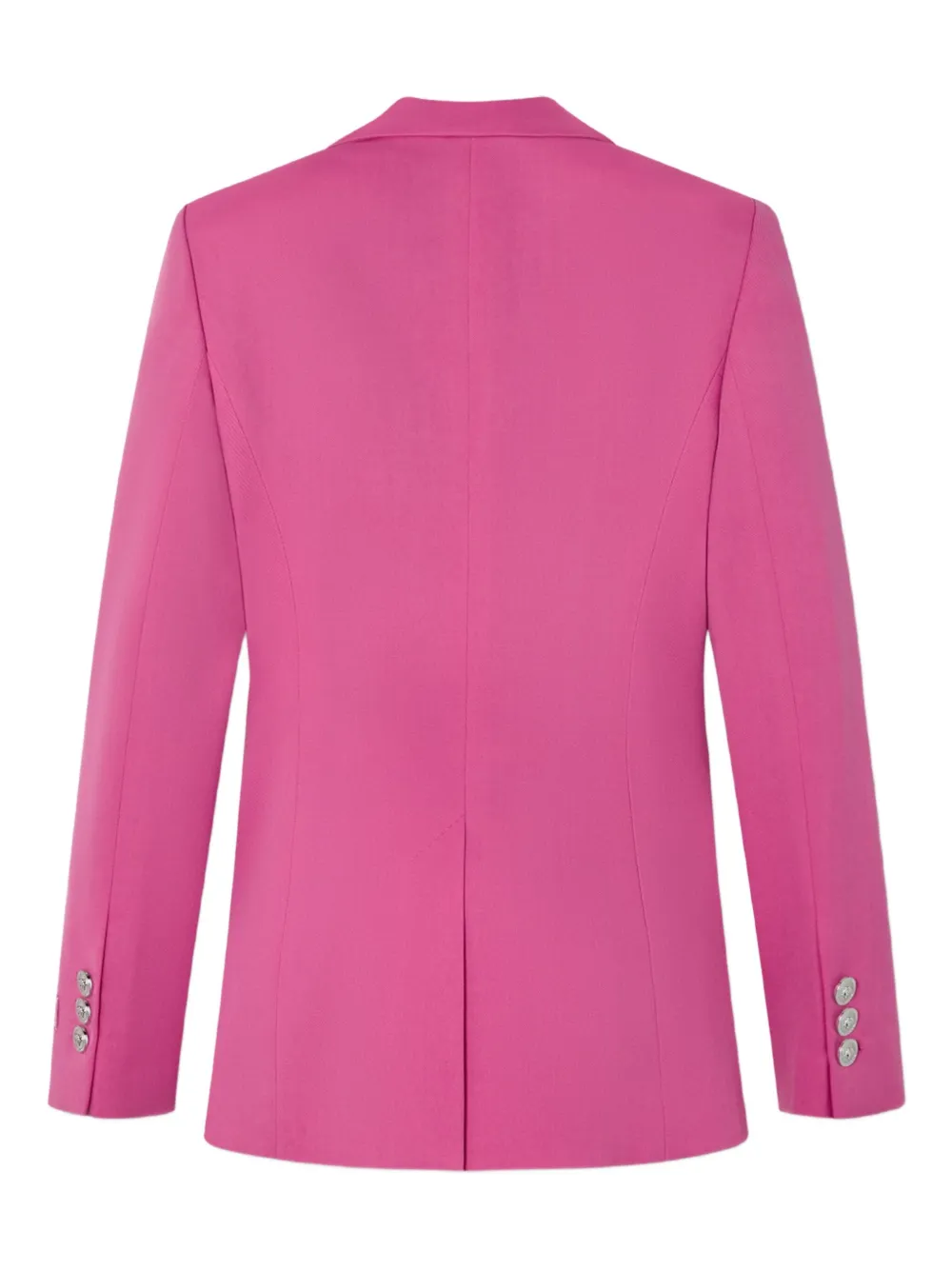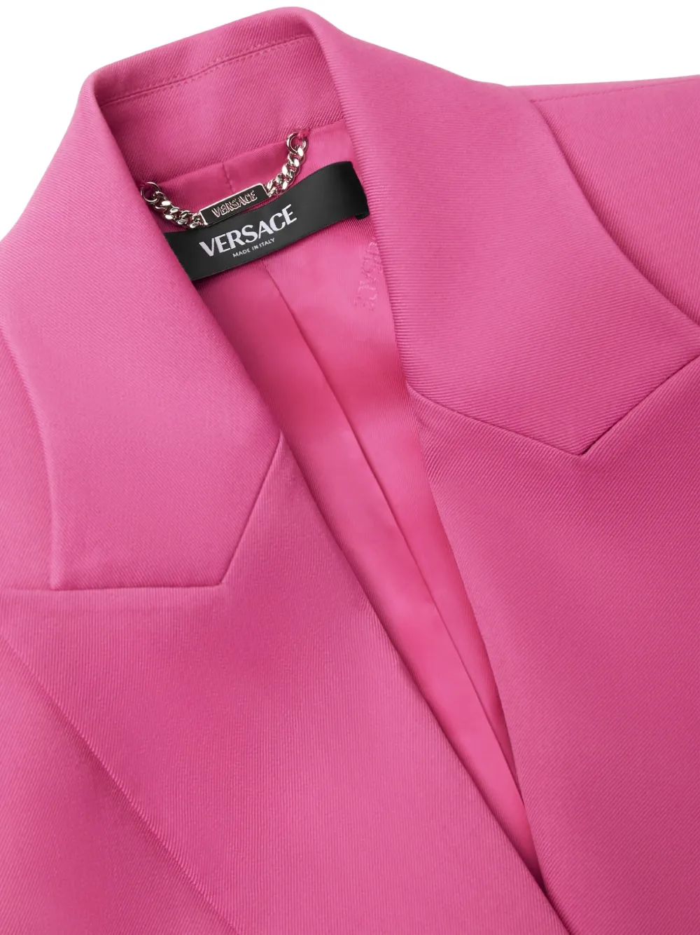 Sacou Versace Tailored roz, din lana, cu rever ascutit, inchidere cu un singur nasture, maneci lungi, captuseala din poliester si tiv drept. Potrivit pentru sezonul primavara/vara. 98% lana; 2% elastan; 100% cupro; 100% poliester.