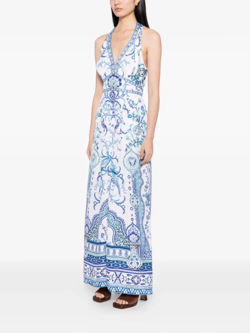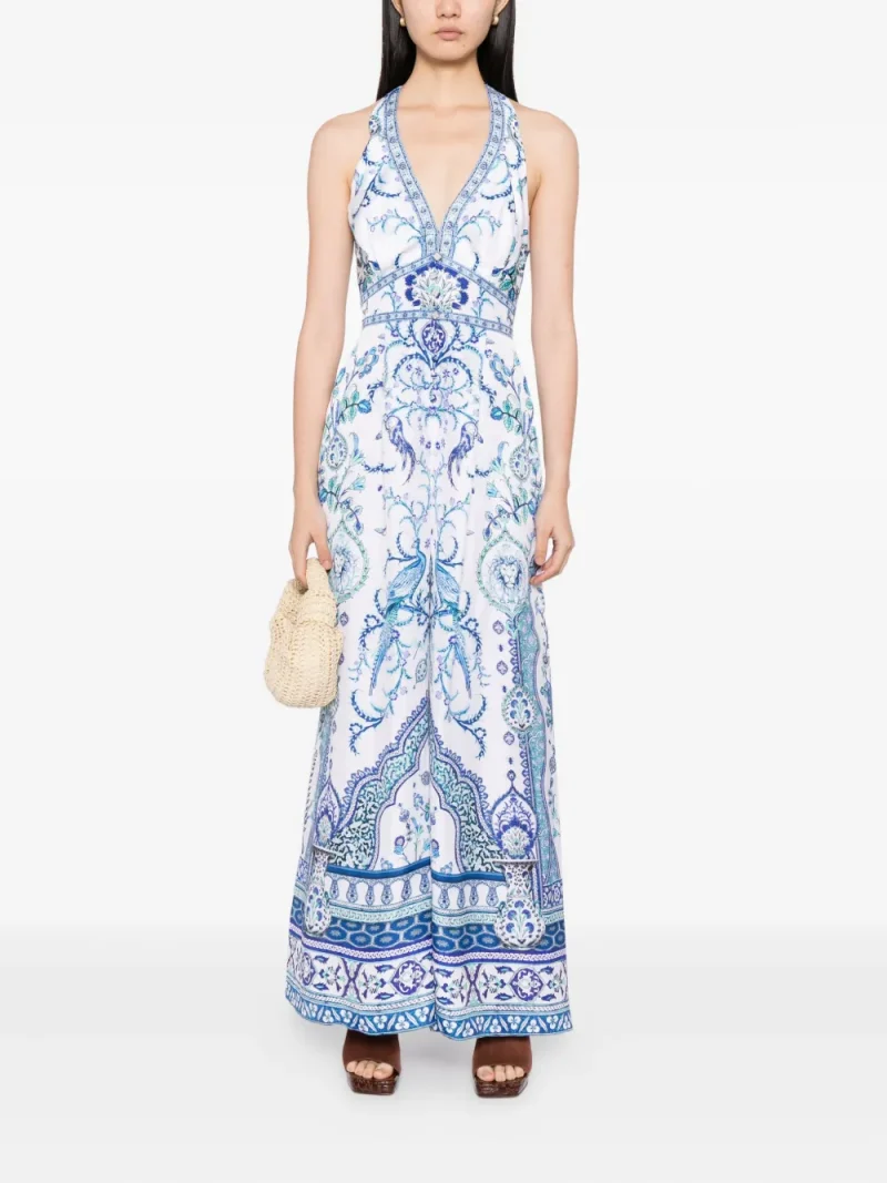 Salopeta Camilla Isnik Lullaby albastru, din matase, cu decolteu in V si inchidere halterneck, spatele gol, grafica „Isnik Lullaby” imrpimata, croiala wide fit si tiv drept. Potrivita pentry sezonul toamna/iarna. 100% matase.