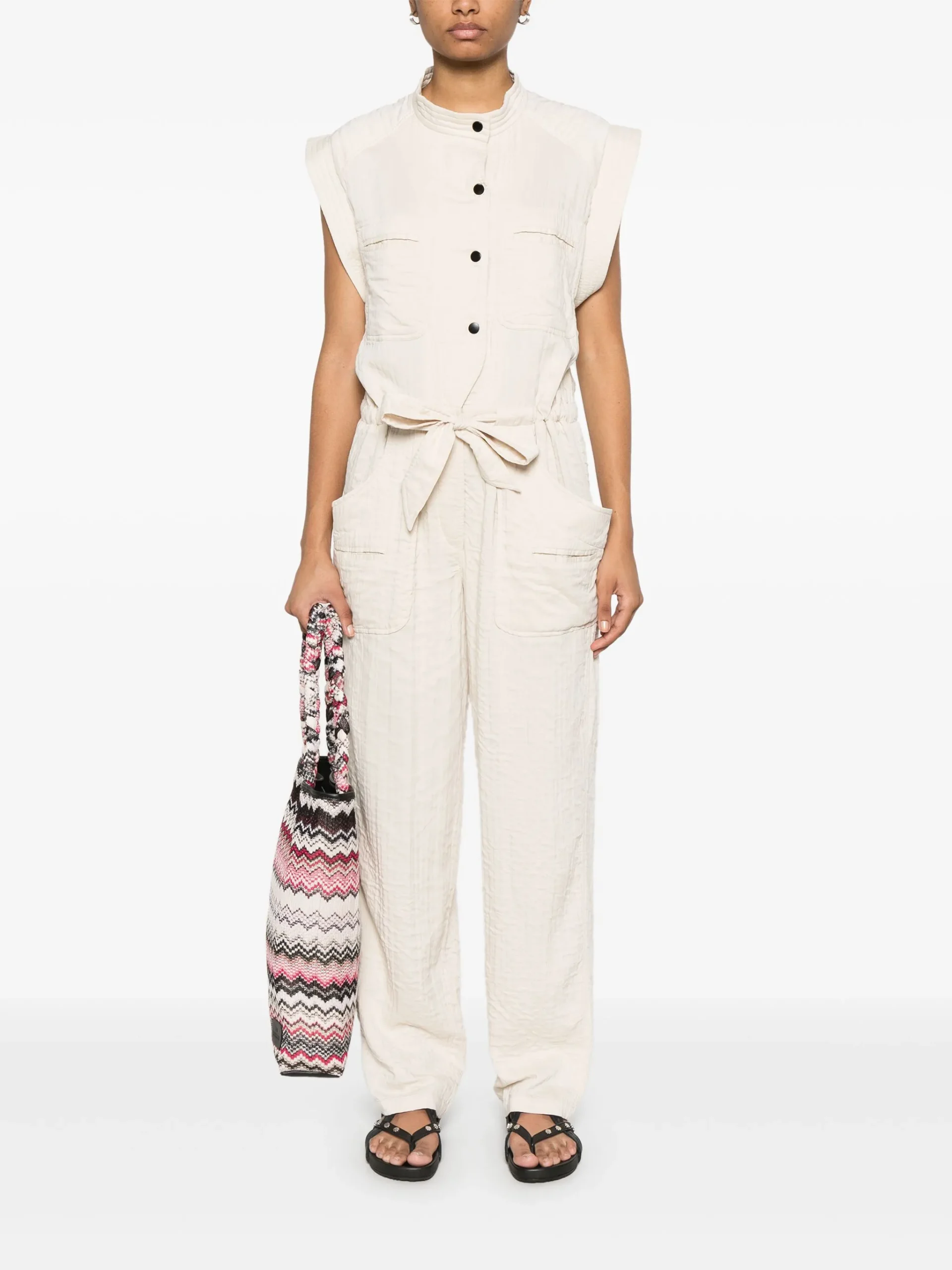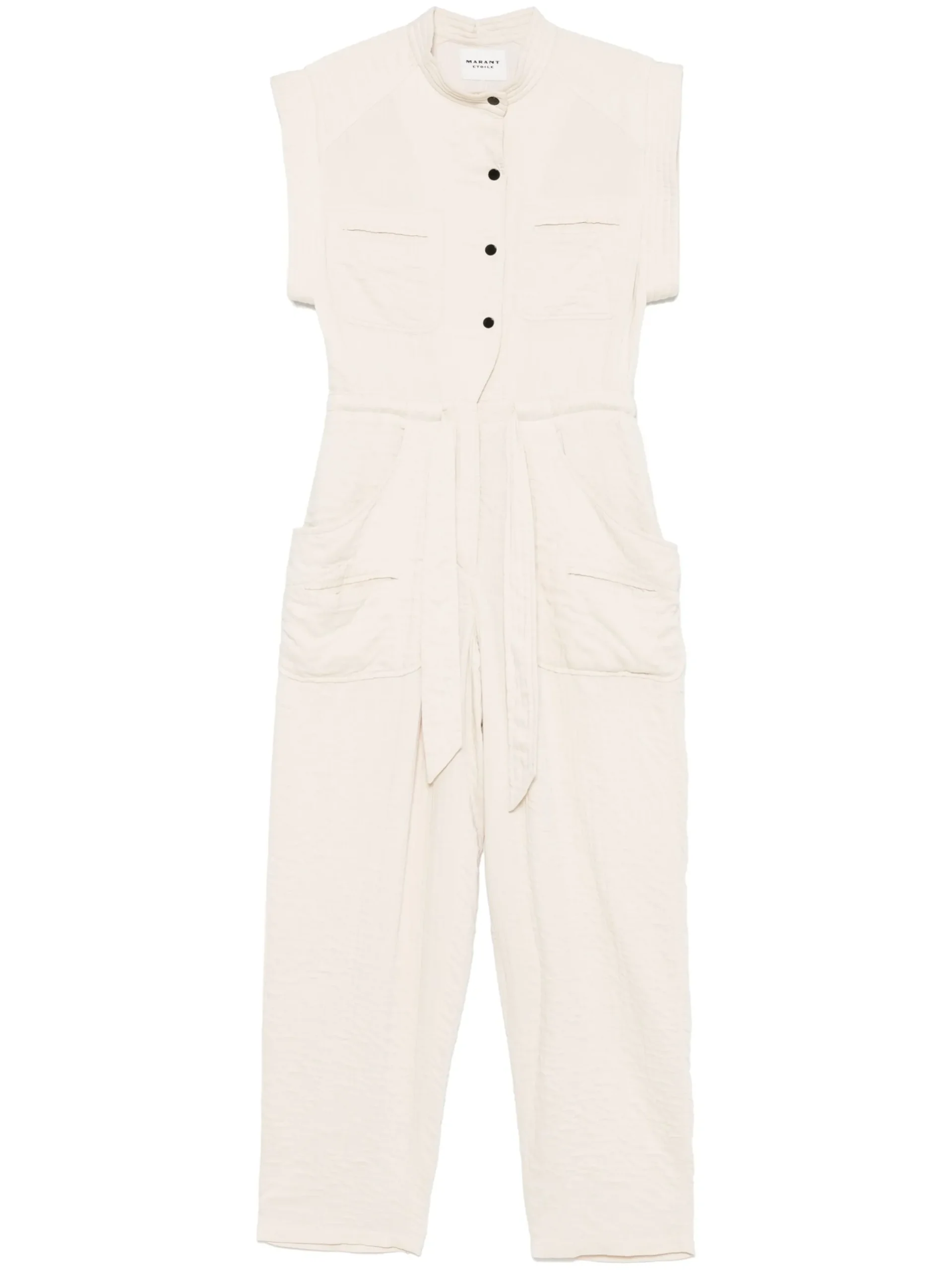 Salopeta Marant Etoile Suzie bej, inchidere frontala cu capse, fara maneci, cordon in talie, patru buzunare si tiv drept. Potrivita pentru sezonul primavara/vara. 48% vascoza 29% bumbac 23% nylon
