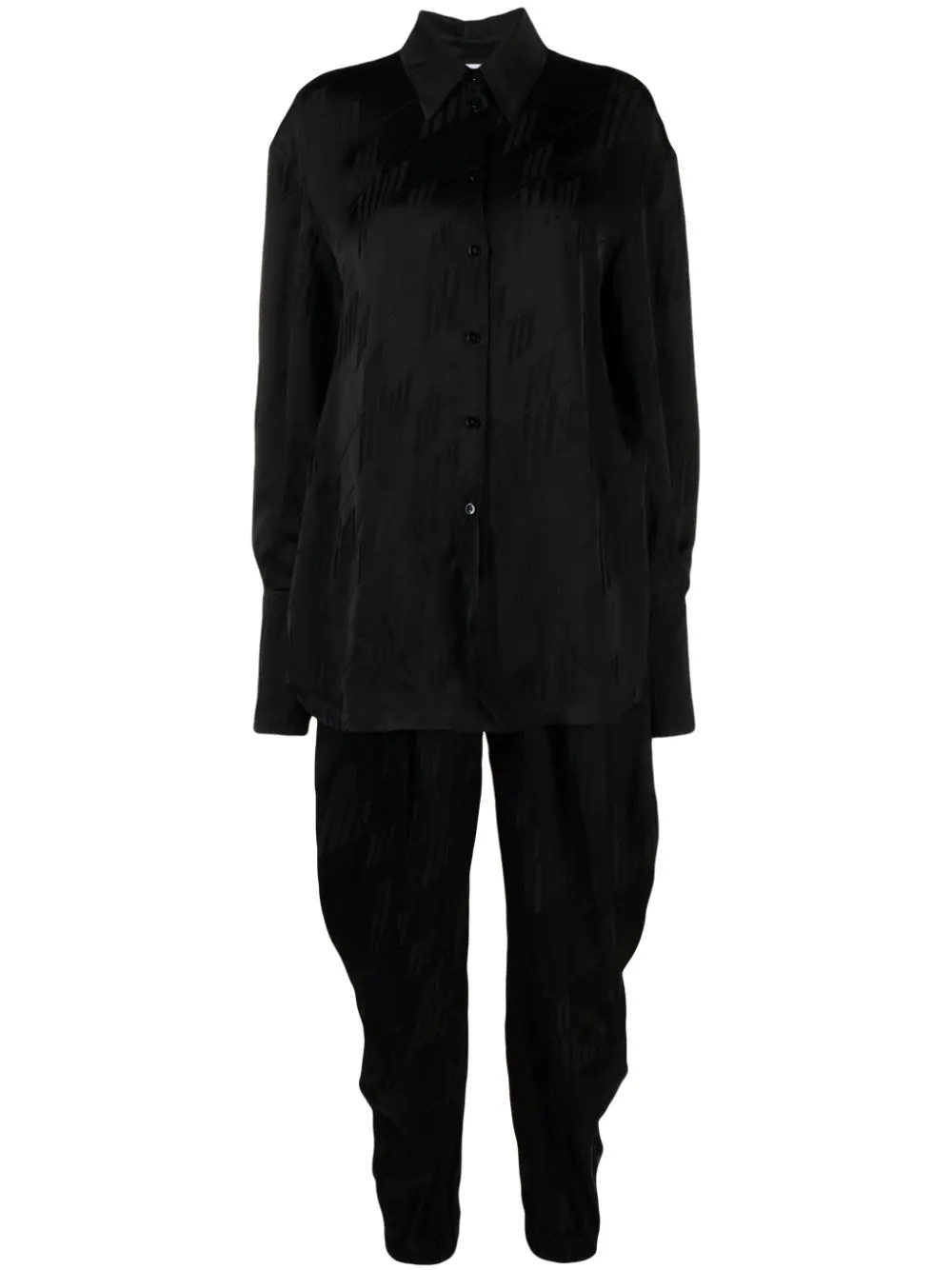 Salopeta neagra din viscoza, cu guler clasic, inchidere cu nasturi, maneci lungi, mansete late cu nasturi, logo The Attico in tesatura pe toata suprafata, betelie in jurul taliei si pantaloni conici cu tiv drept. Potrivita pentru sezonul primvara/vara. 100% viscoza.