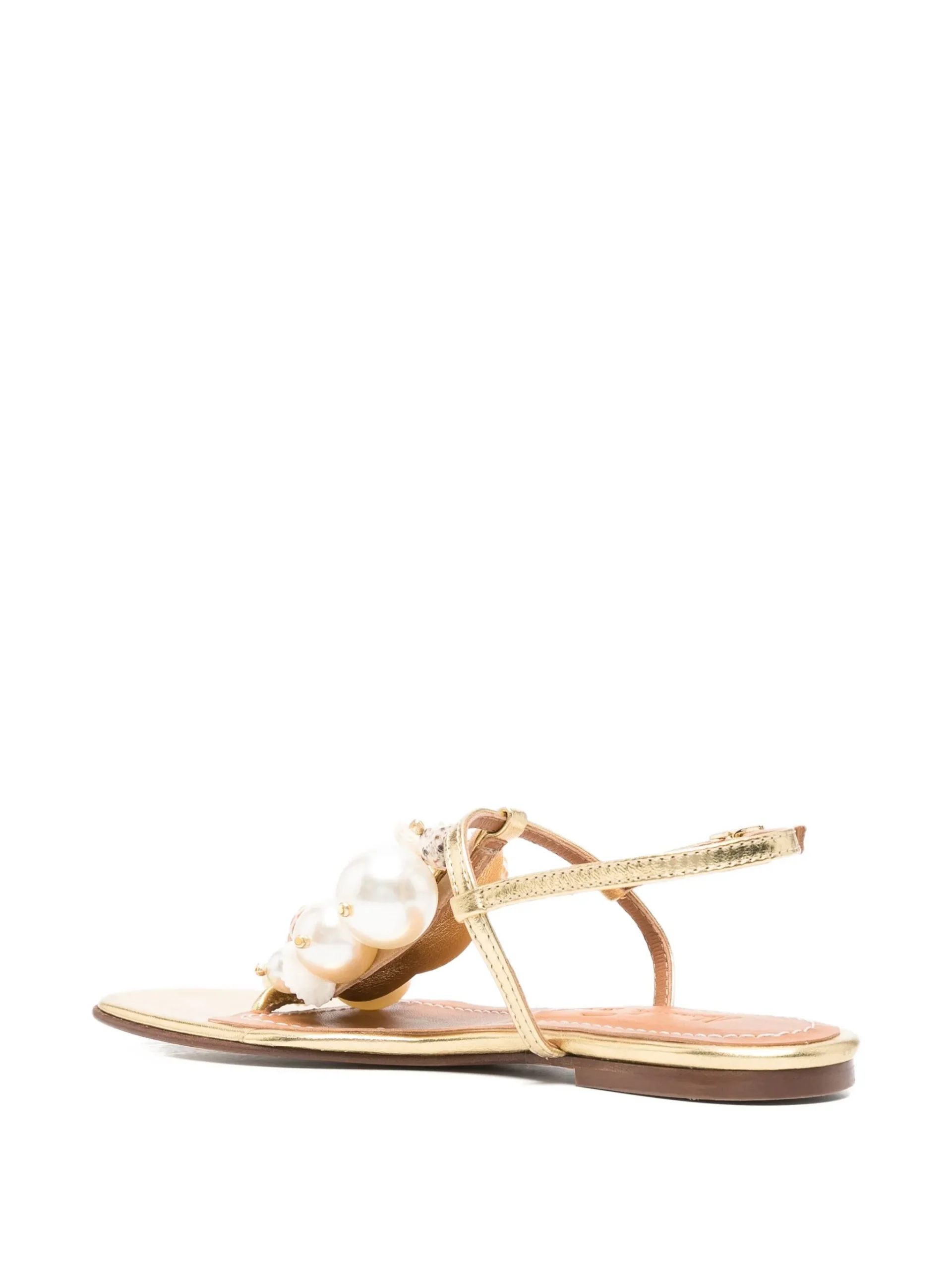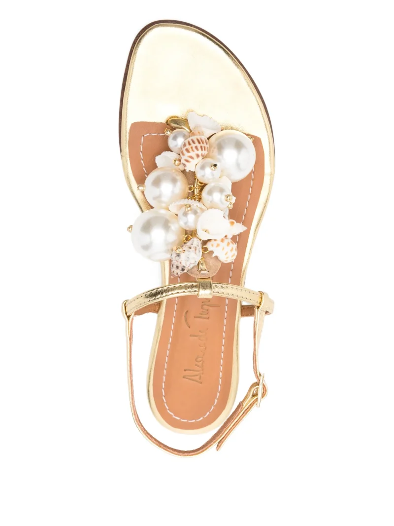 Sandale Alameda Turqesa Belize auriu, decoratiuni cu model cu scoici, curea slingback, decoratiuni cu perle artificiale, talpa plata, inchidere cu catarama.100% piele