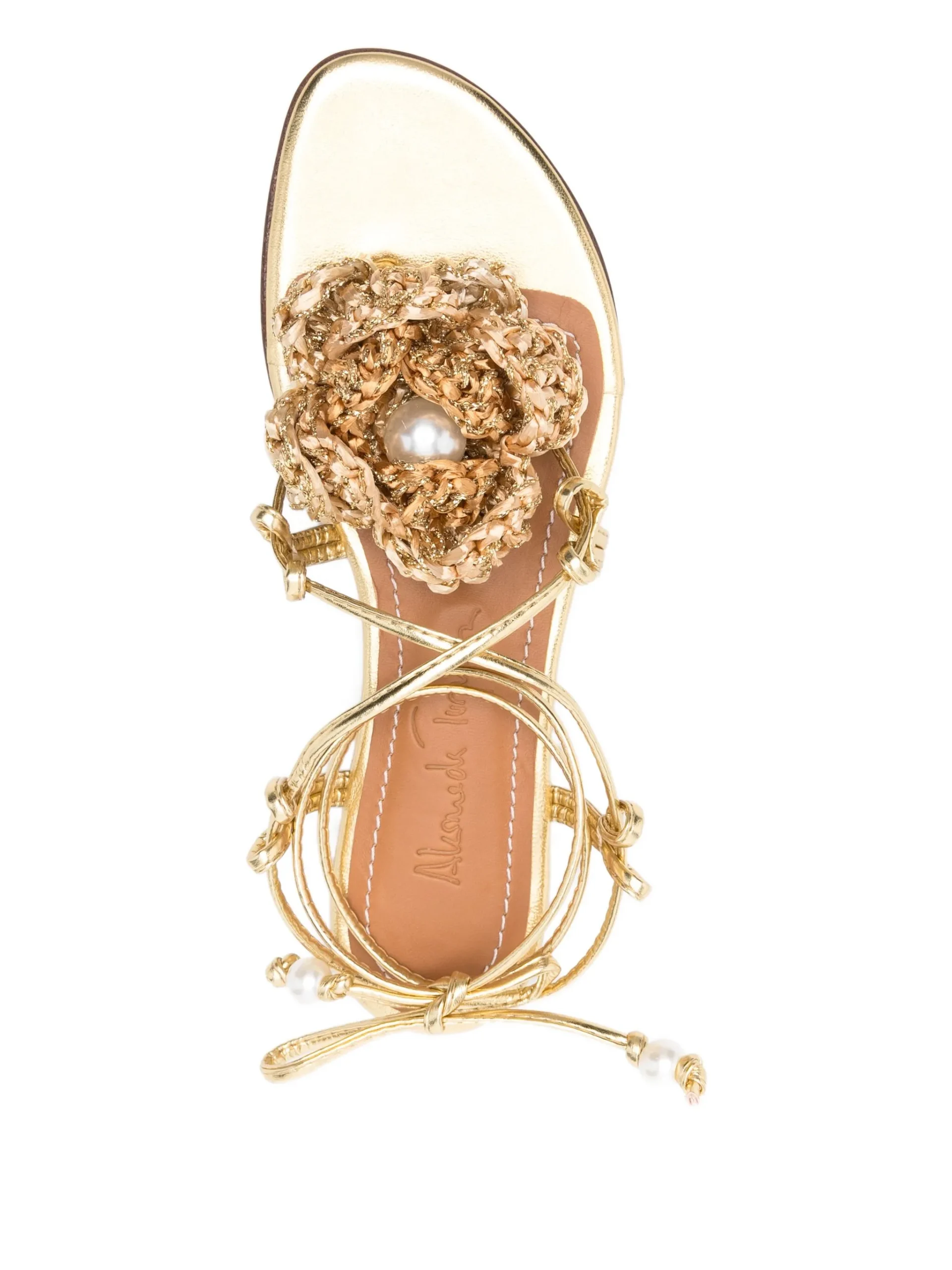 Sandale Alameda Turquesa Meredith auriu, ornament floral, inchidere cu sireturi la glezna, talpa plata, perle artificiale, finisaj metalic.100% piele