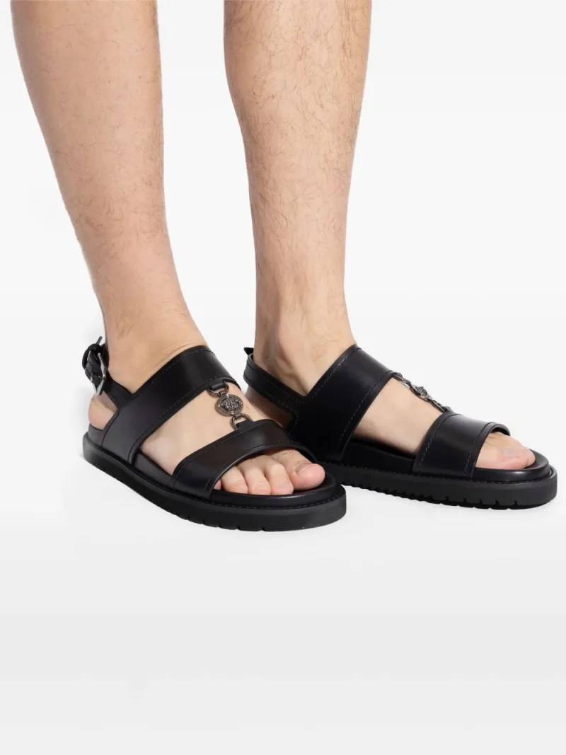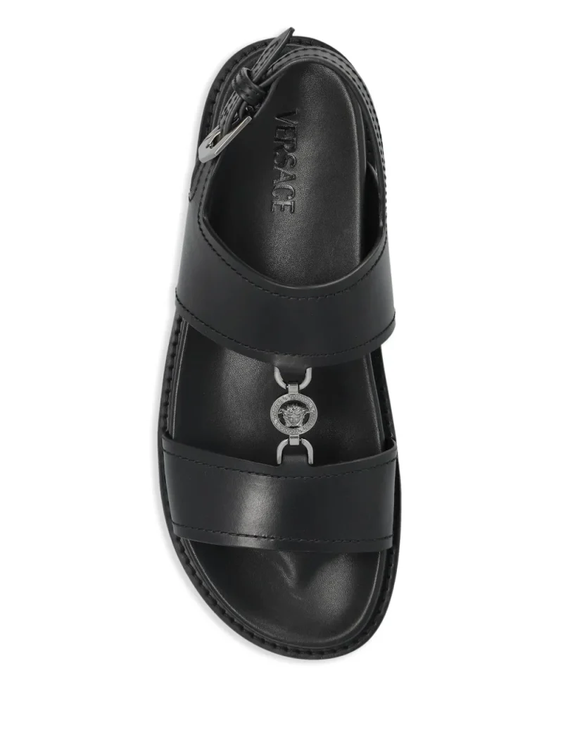 Sandale Versace Medusa Leather negru, cu profil jos, inchidere curea si catarama, barete interconectate de logo metalic Medusa, logo imprimat si talpa dreapta din cauciuc profilat. 100% piele de vitel; 100% cauciuc; 100% piele de vitel.