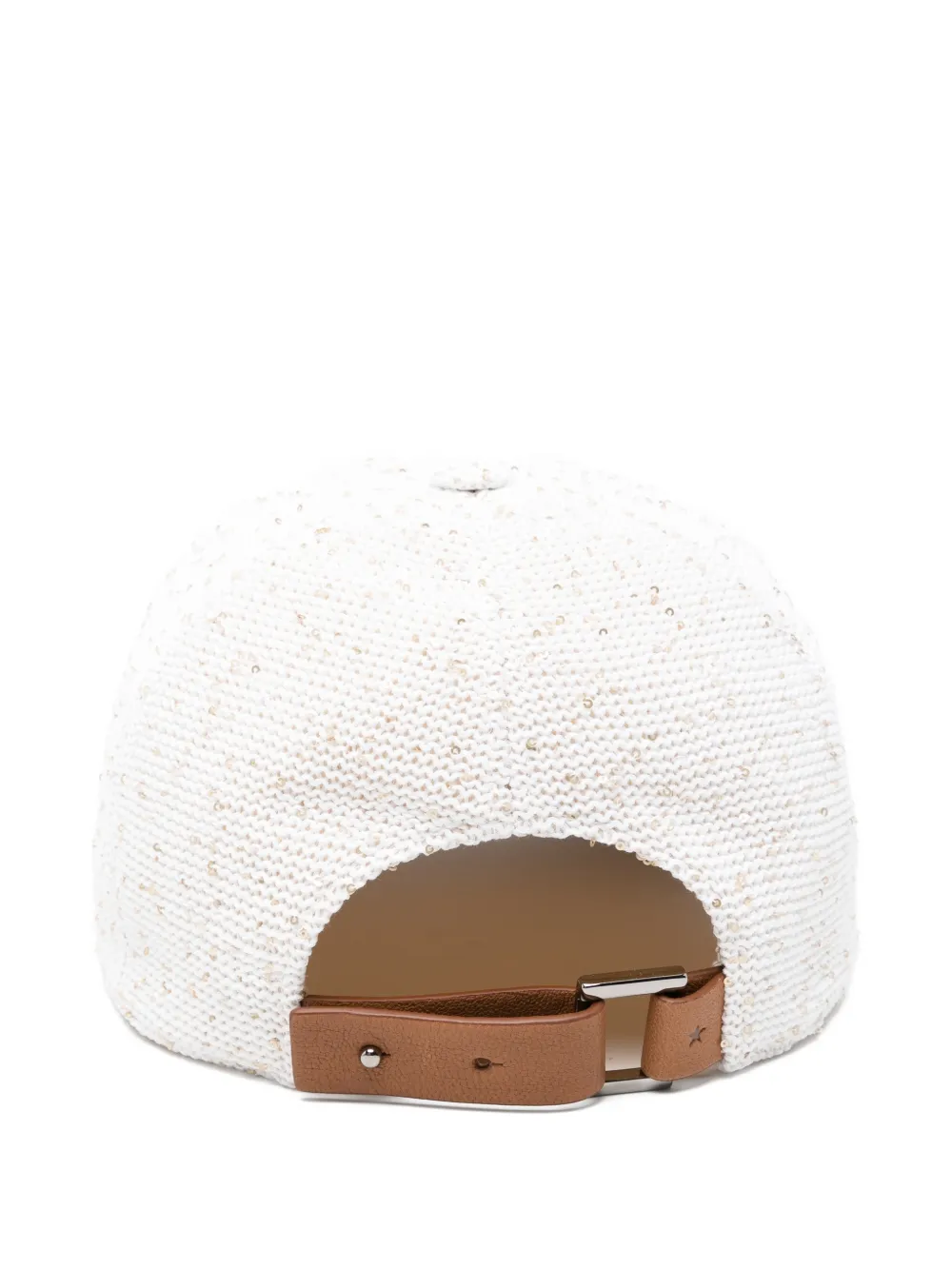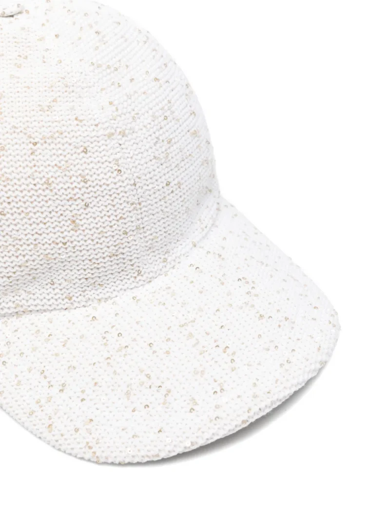 Sapca Lorena Antoniazzi Cotton Embellished alb, realizata din bumbac tricot, decorata cu paiete sclipitoare, inchidere ajustabila si cozoroc curbat. 81% bumbac; 12% piele; 5% nylon; 2% poliester.
