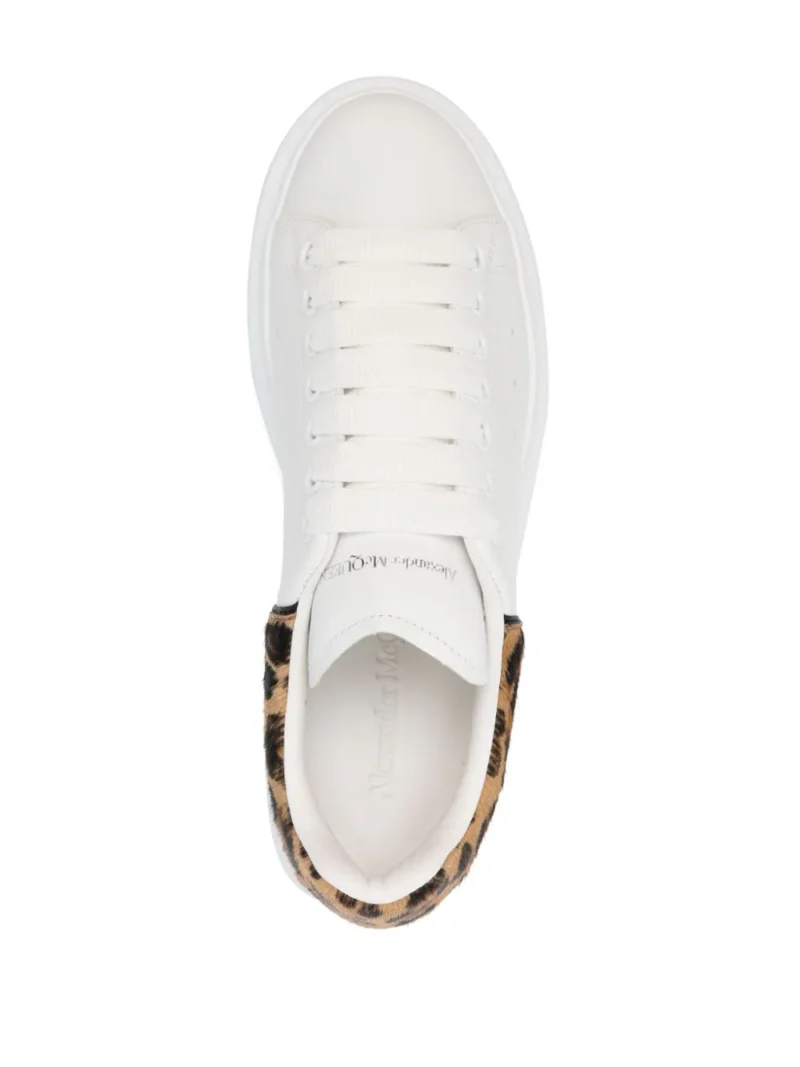 Pantofi albi din piele de vitel, sport, cu profil jos, inchidere cu sireturi, logo AMQ imprimat pe limba, captuseala din piele, petic din blana cu imprimeu leopard si logo AMQ, bot rotund si talpa supradimensionata din cauciuc. 100% piele de vitel; 100% piele de vitel; 100% cauciuc. Detalii: Inaltime talpa 3 cm. Pantofii sport vin cu un set suplimentar de sireturi. Pentru a reduce impactul asupra mediului si pentru a reduce consumul de bumbac, acesti pantofi sport nu mai contin saculeti de praf in cutie.