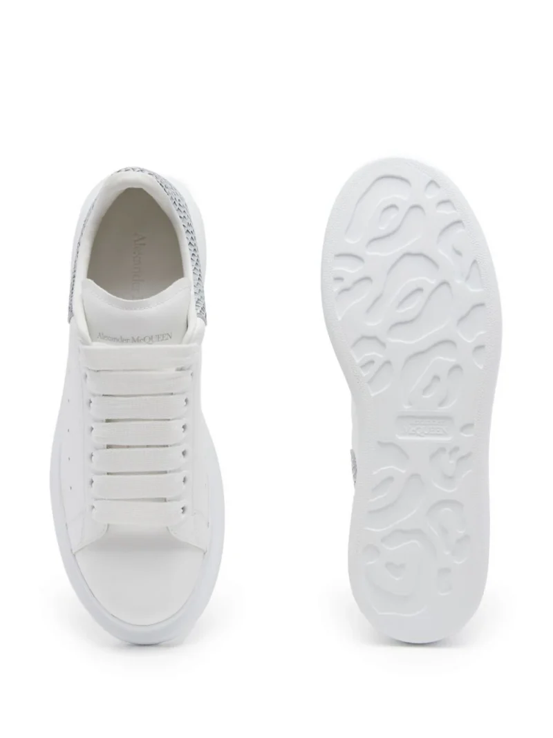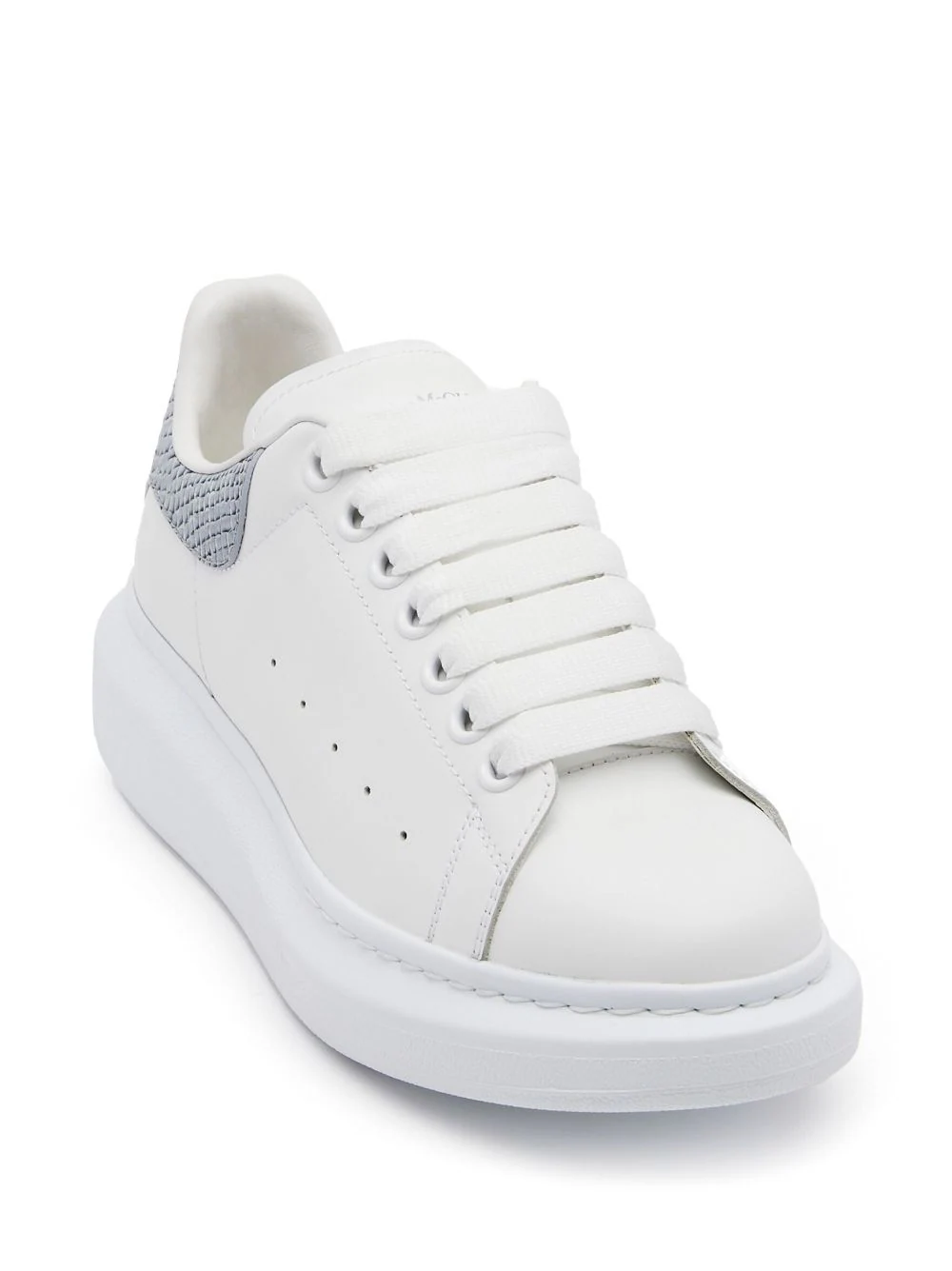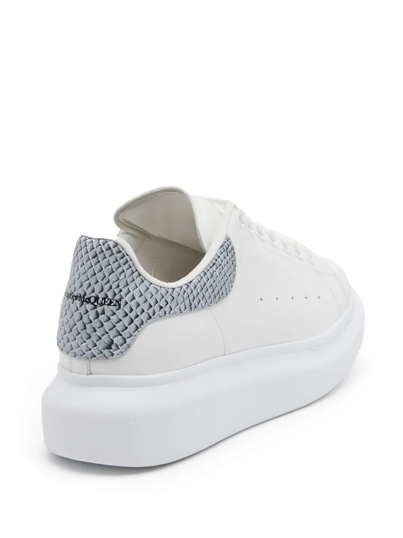 Pantofi albi din piele naturala, sport, cu profil jos si inchidere cu sireturi, petic din piele cu efect Lizard si logo AMQ imprimate la spate, captuseala din piele, bot rotund si talpa suprainaltata din cauciuc. Detalii: Inaltime calcai- 4.5 cm. 100% piele naturala; 100% piele naturala; 100% cauciuc. Pantofii sport vin cu un set suplimentar de sireturi. Pentru a reduce impactul asupra mediului si pentru a reduce consumul de bumbac, acesti pantofi sport nu mai contin saculeti de praf in cutie.