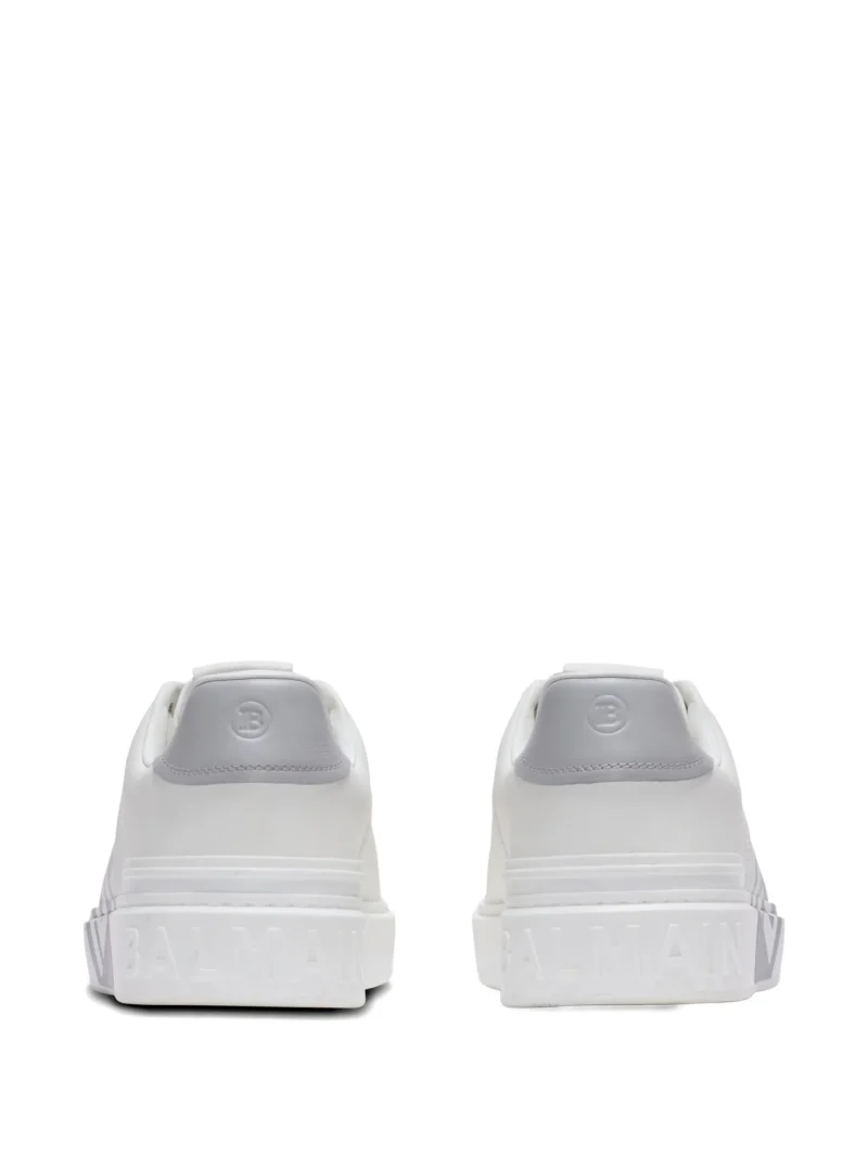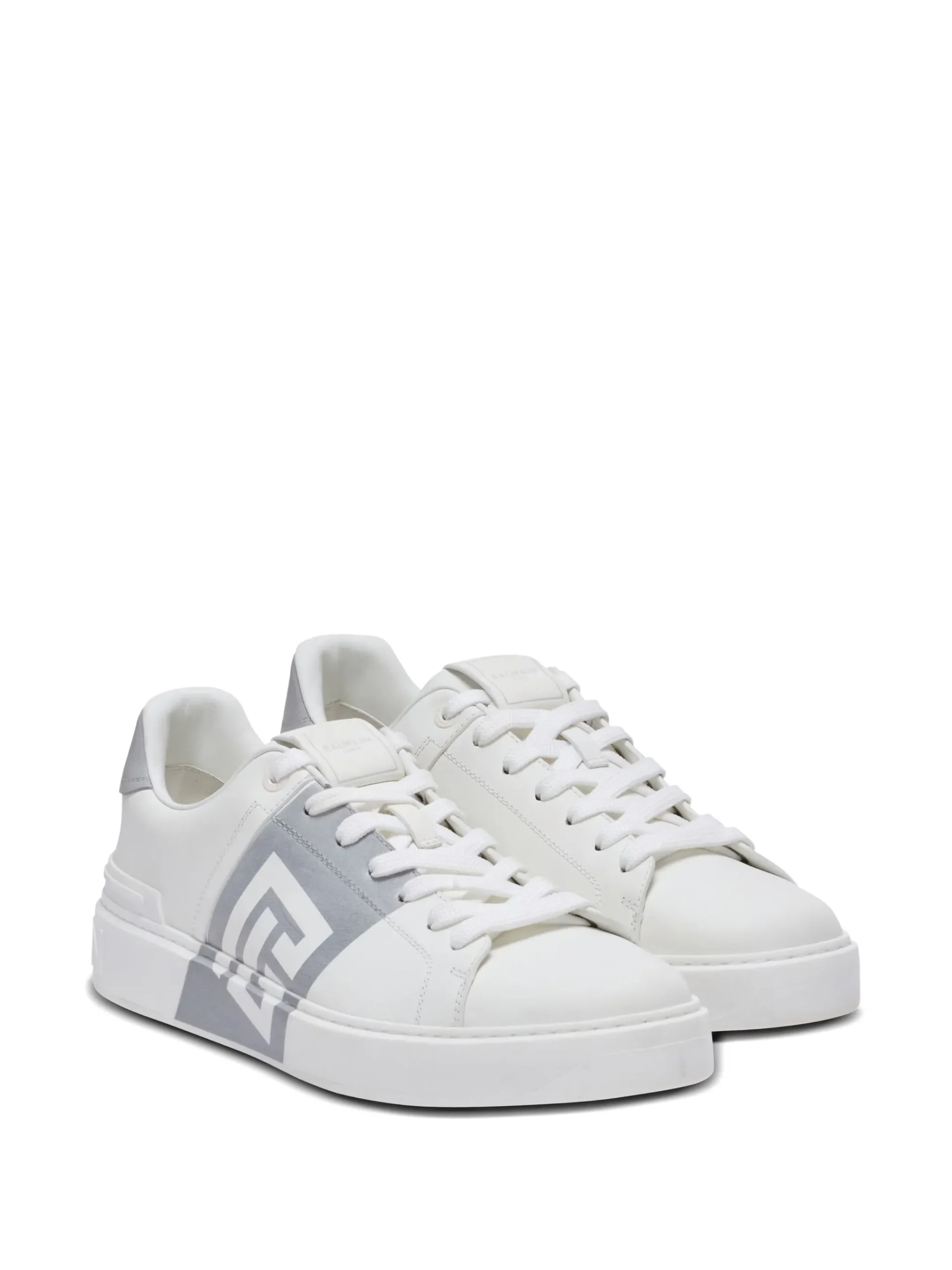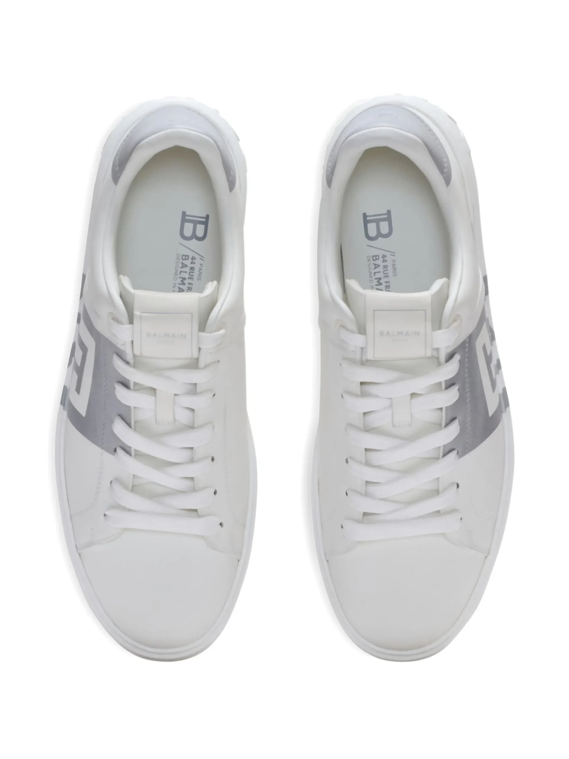 Pantofi sport Balmain B-Court albi, din piele de vitel, cu panou gri cu logo, inchidere cu sireturi, cusaturi ton sur ton si talpa plata. Potriviti pentru sezonul primavara/vara.100% piele