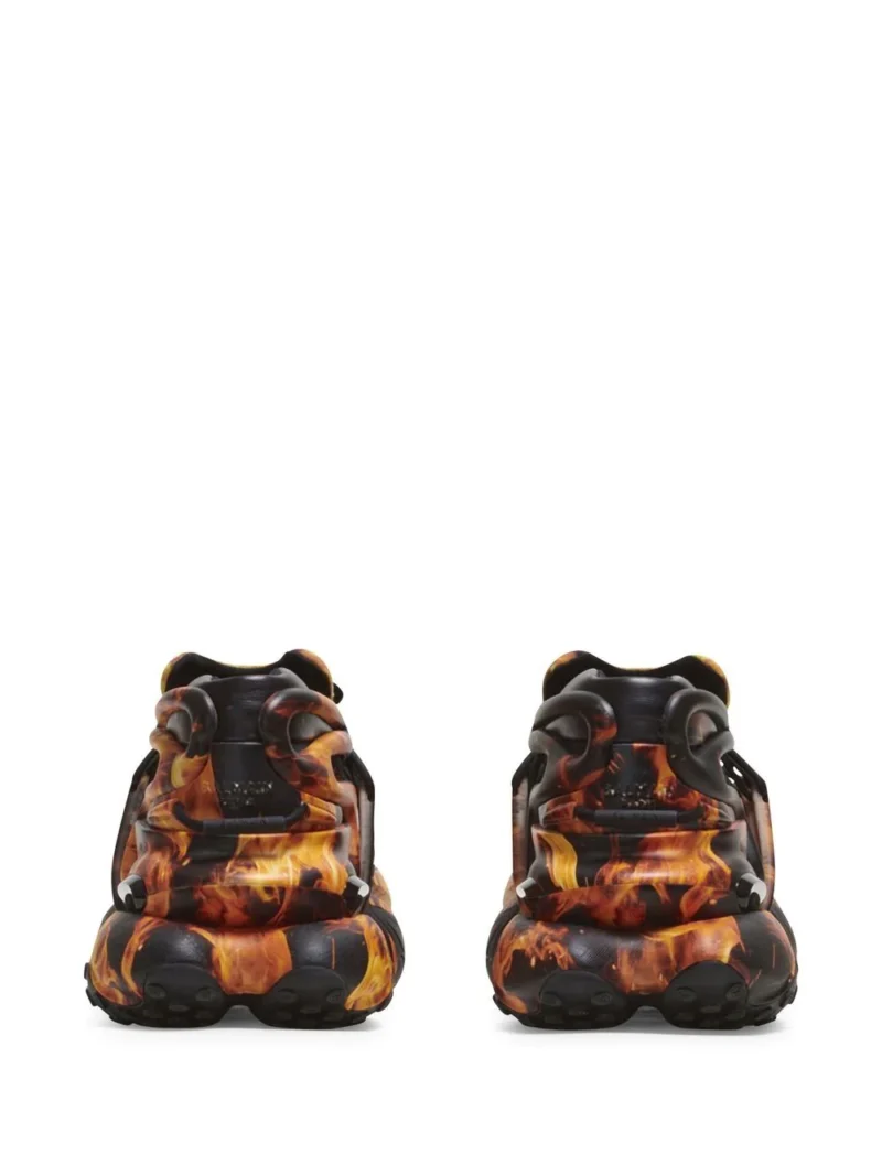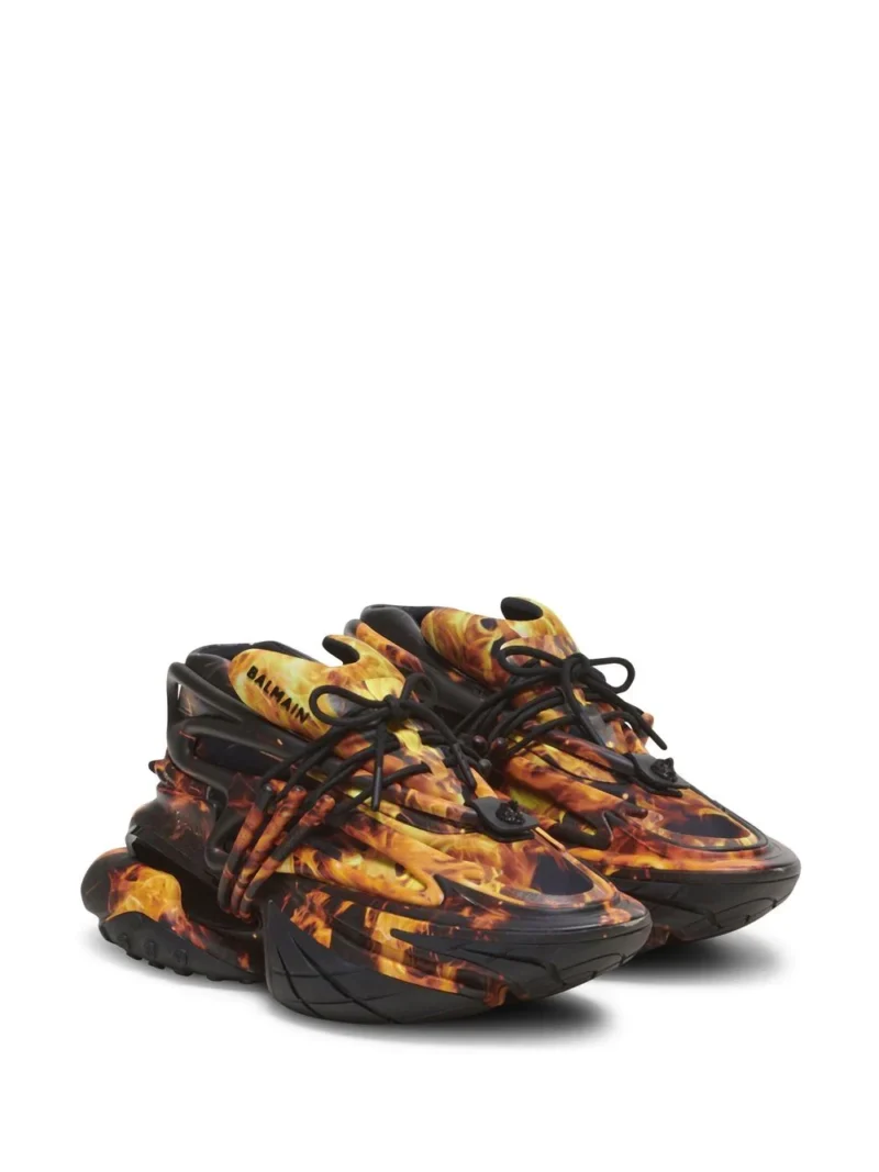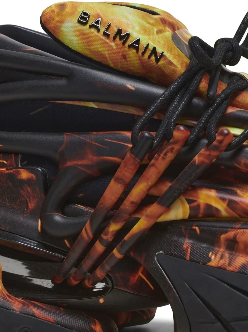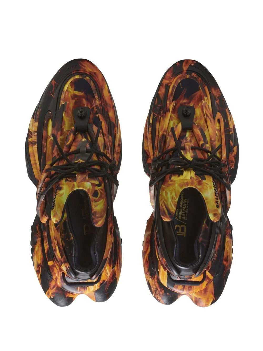 Pantofi multicolor din neopren, sport, cu profil jos, inchidere cu sireturi, logo Balmain aplicat pe limba, grafica Flames imprimata pe toata suprafata, bot rotunjit si talpa supradimensionata cu design atipic. Detalii: Acesti pantofi sunt insotiti de saculeti de praf din bumbac; Inaltime talpa- 4 cm. 82% nailon; 14% elastan; 4% poliuretan termoplastic; 100% cauciuc.