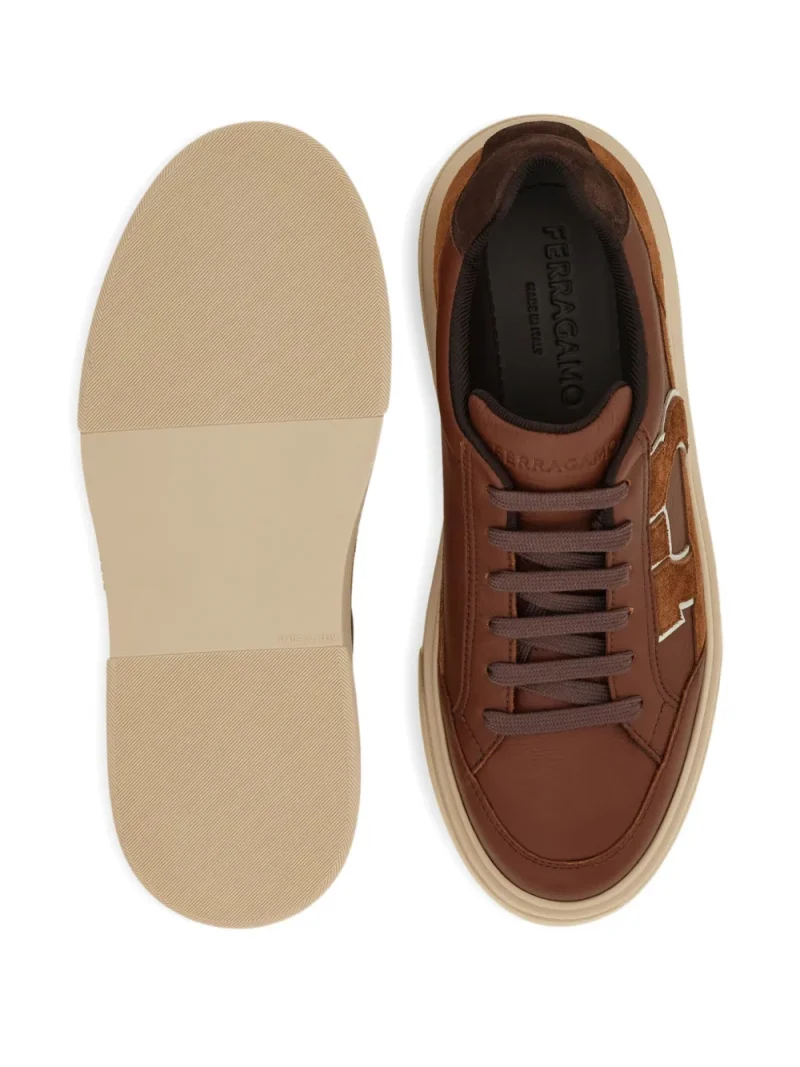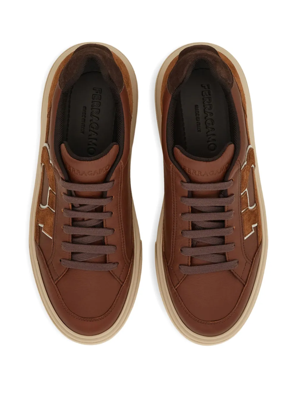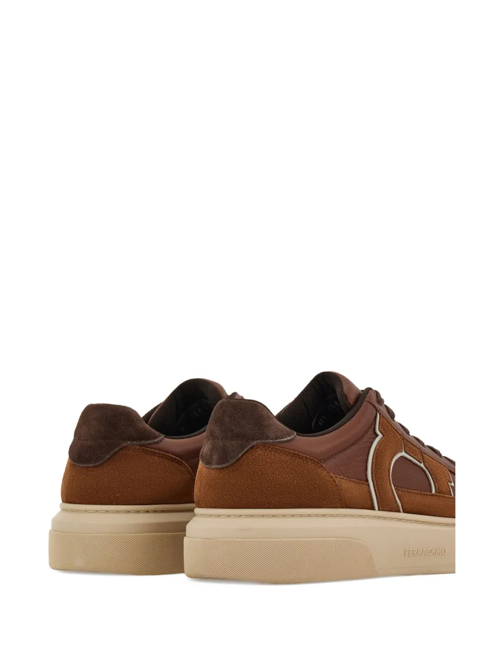 Sneakers Ferragamo Suede Leather maro, din piele naturala, cu profil jos, inchidere cu sireturi, logo FERRAGAMO Gancini aplicat pe laterale, brant din piele intoarsa cu logo gravat, bot rotund si talpa suprainaltata. 90% piele de vitel; 10% piele intoarsa; 100% textil; 100% piele de vitel; 100% cauciuc.