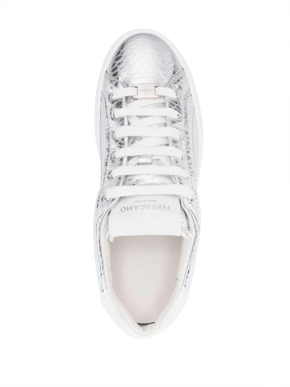 Pantofi argintii din piele naturala, cu profil jos, aspect metalizat si efect piele de sarpe, inchidere cu sireturi, logo FERRAGAMO gravat pe limba, brant si in relief pe calcai, bot rotund si talpa plata din cauciuc. 100% piele de vitel; 100% piele de vitel; 100% cauciuc.