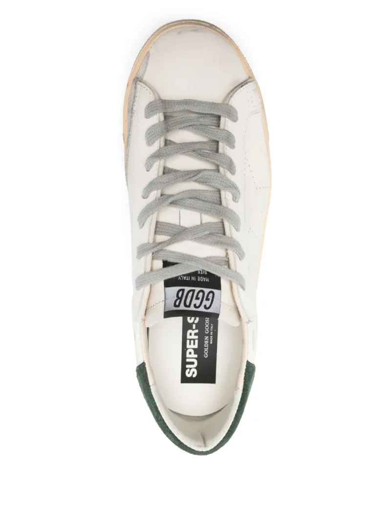 Sneakers Golden Goose Super-Star alb, sport, cu profil jos si inchidere cu sireturi, brant din piele intoarsa verde la spate, logo GGDB imprimat la spate, logo Star embosat pe laterale si talpa dreapta din cauciuc. 100% piele de vitel; 100% piele de vitel; 100% cauciuc; 100% textil.