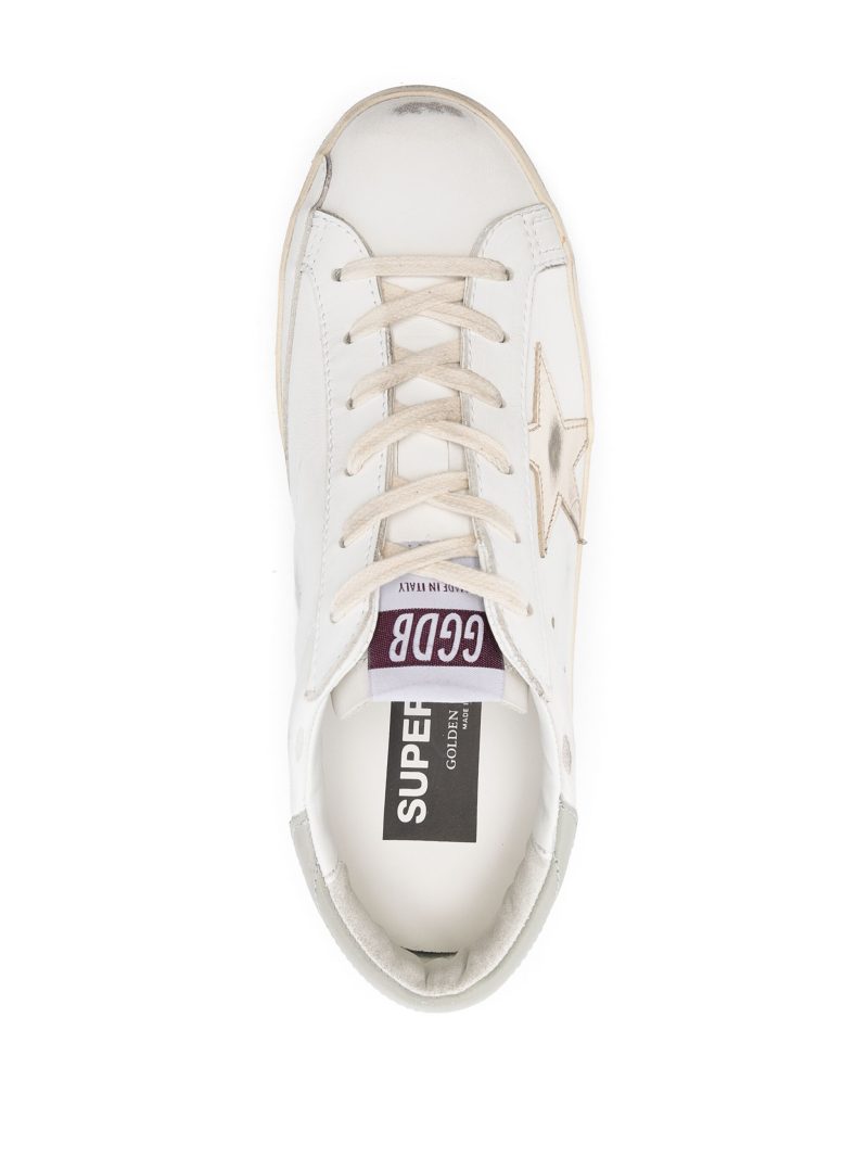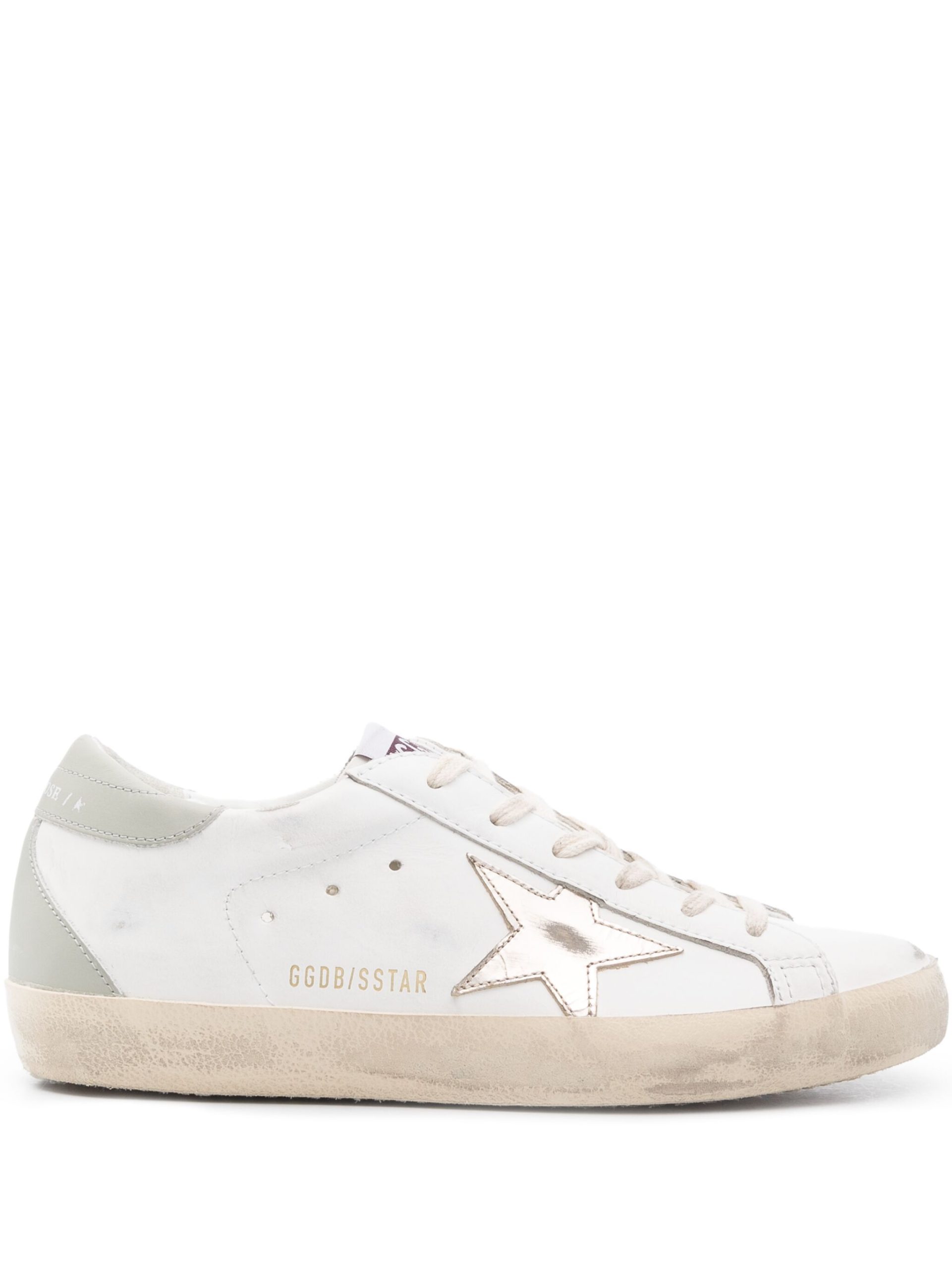 Sneakers Golden Goose Super Star gri, din piele, sport, cu profil jos, inchidere cu sireturi, logo GGDB Star imprimat pe o parte, insertie logo Star argintie, captuseala din piele, brant din poliuretan gri, talpa dreapta, bot rotund si aspect uzat. 100% piele de vitel; textil; 100% cauciuc sintetic