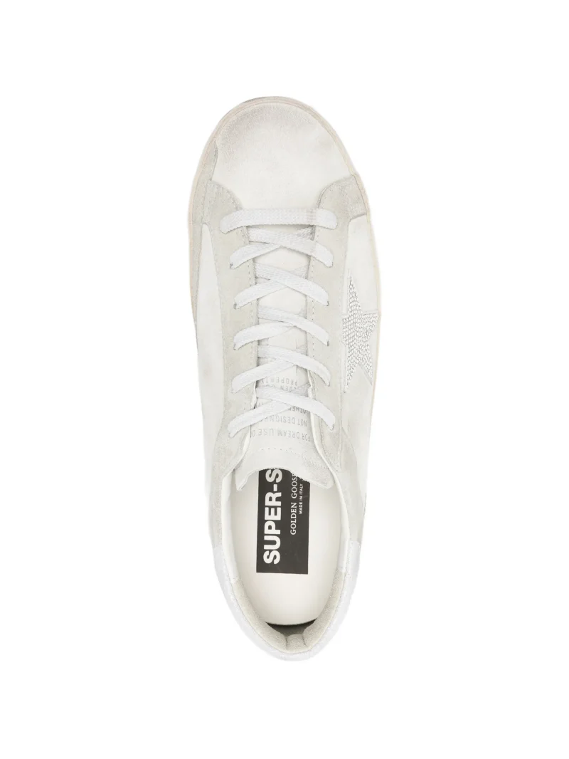 Sneakers Golden Goose Super-Star albi, cu motiv stea, inchidere cu sireturi, varf rotund, talpa plata si efect distressed. 100% piele
