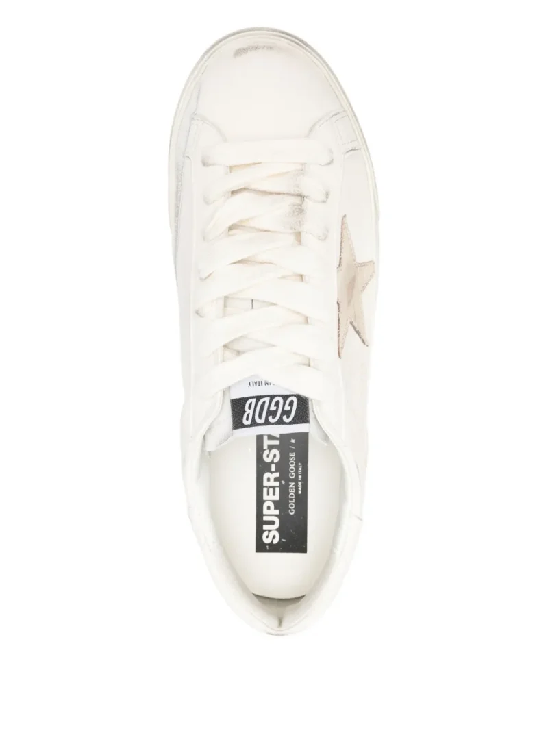 Sneakers Golden Goose Super-Star Leather alb, din piele, sport, cu profil jos, inchidere cu sireturi, logo GGDB Star imprimat pe o parte, insertie logo Star argintie, captuseala din piele, brant din piele, talpa dreapta, bot rotund si aspect uzat. 100% piele de vitel; 100% piele de vitel; 100% textil; 100% cauciuc.