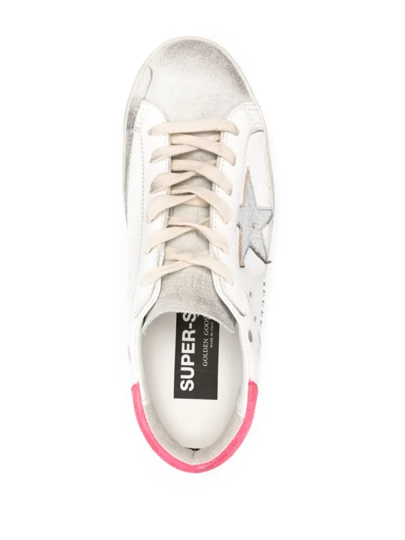 Sneakers Golden Goose Super-Star Leather ecru, din piele, cu profil jos, inchidere cu sireturi, logo GGDB Star imprimat pe o parte, insertie logo Star din piele intoarsa gri, captuseala din piele, brant din piele la spate in contrast, talpa dreapta si bot rotund. 100% bos taurus; 100% piele de vitel; 100% cauciuc.