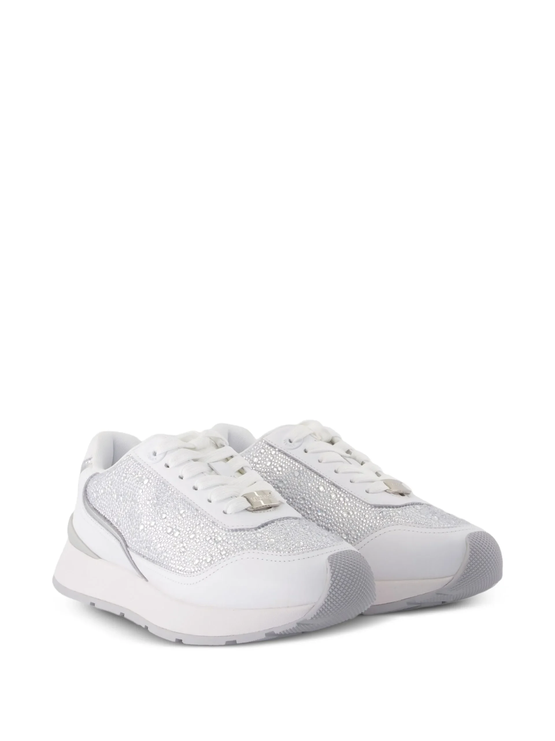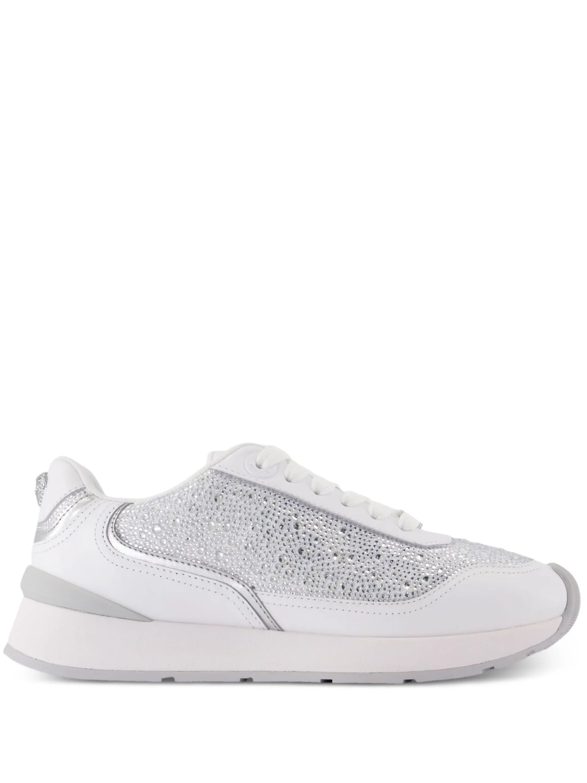 Sneakers Versace crystal-embellished alb din piele de vitel, decoratiuni cu cristale, varf rotund, inchidere cu sireturi si talpa plata. 100% piele