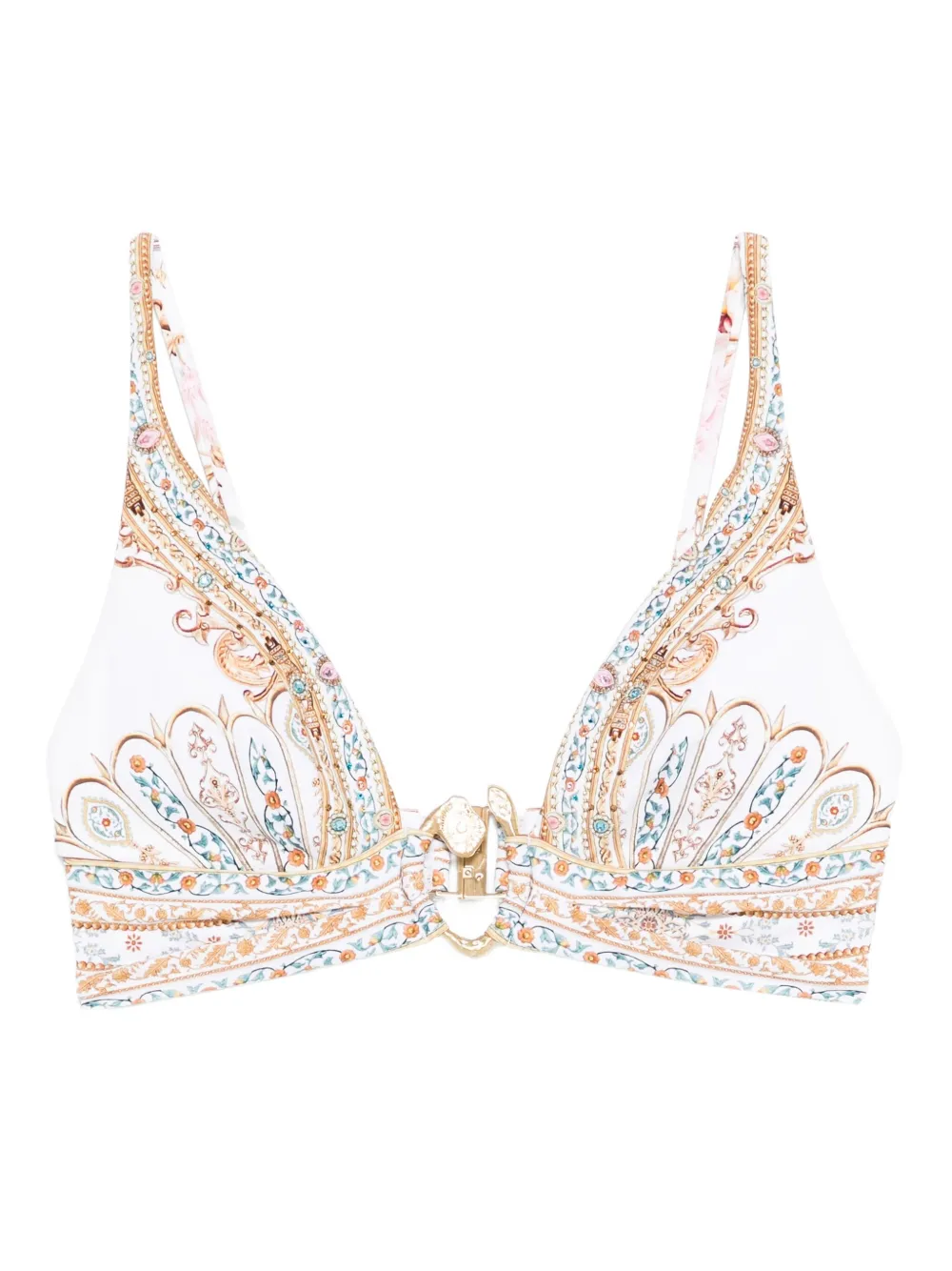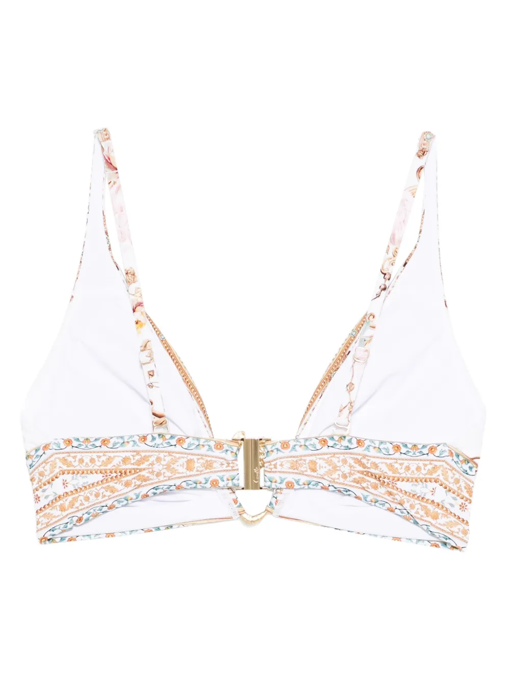 Sutien Bikini Camilla Paisley-Print Buckle Bikini alb, cu decolteu in V, cupe triunghi, grafica imprimata si inchidere clema. Aveti grija sa probati costumele de baie deasupra propriilor articole de imbracaminte. 79% poliamida; 21% elastan.