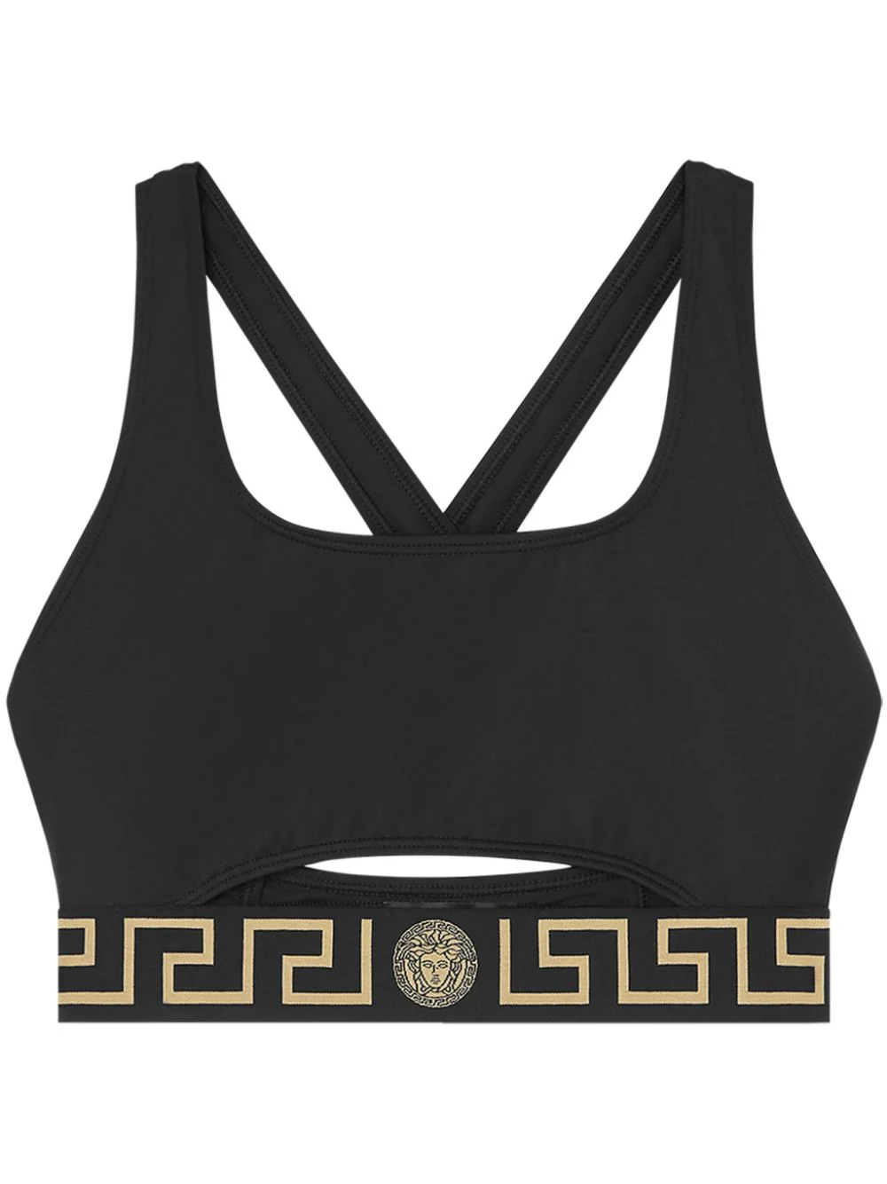 Sutien bikini negru din textil, de plaja, cu decolteu patrat, barete incrucisate la spate, detaliu decupat in partea din fata, design din material stretch si banda elastica cu model Versace Medusa Greca Border in tesatura. 100% textil. Aveti grija sa probati costumele de baie deasupra propriilor articole de imbracaminte.