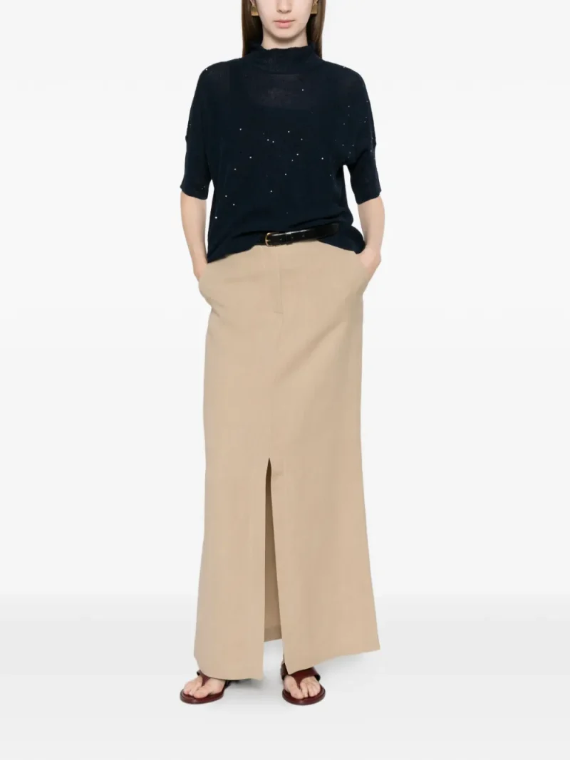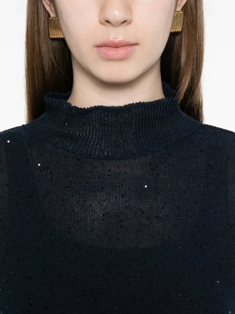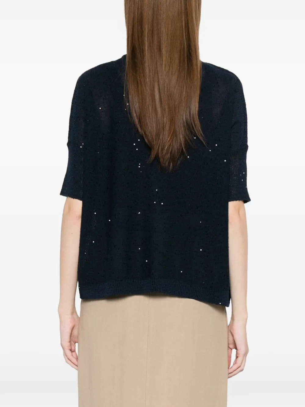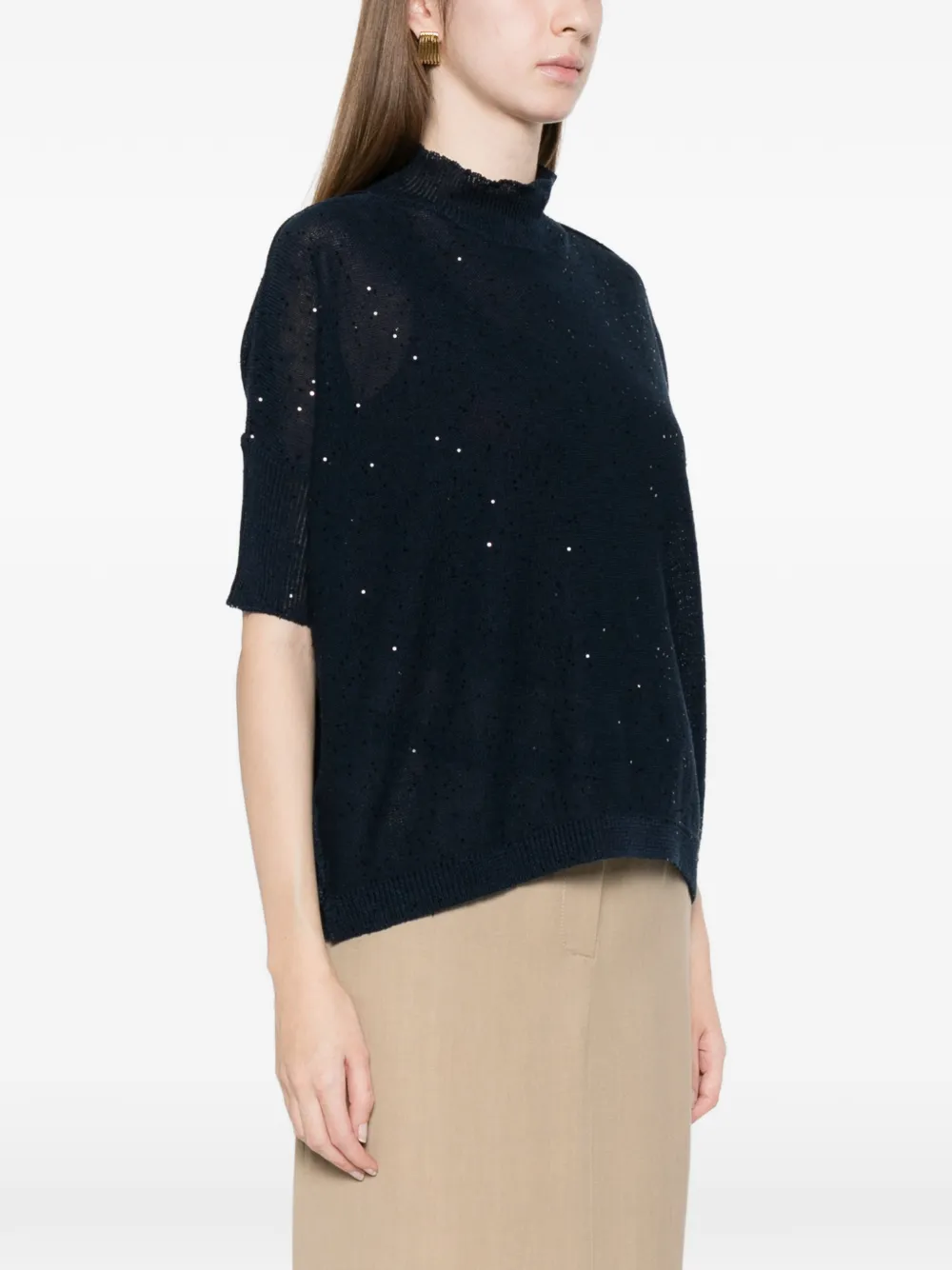 Top Antonelli Agatea Embellished bleumarin, relizat din mix de in si bumbac, cu guler inalt, umeri cazuti, maneci scurte, paiete discrete in tesatura si terminatii ribbed. Potrivit pentru sezonul primavara/vara. 58% in; 37% bumbac; 5% poliester.