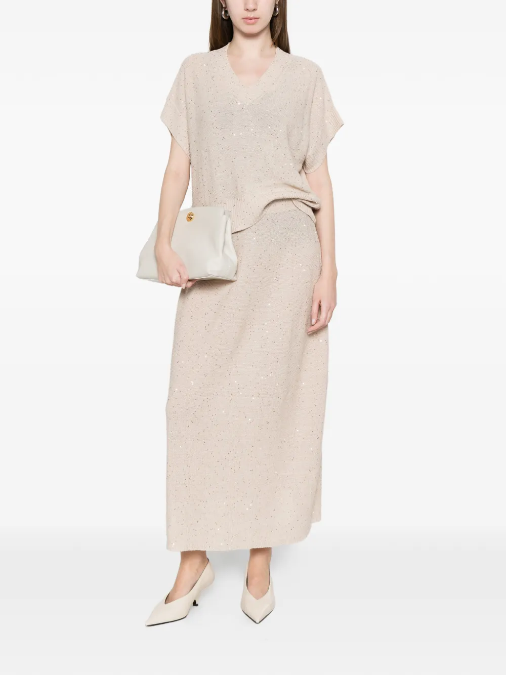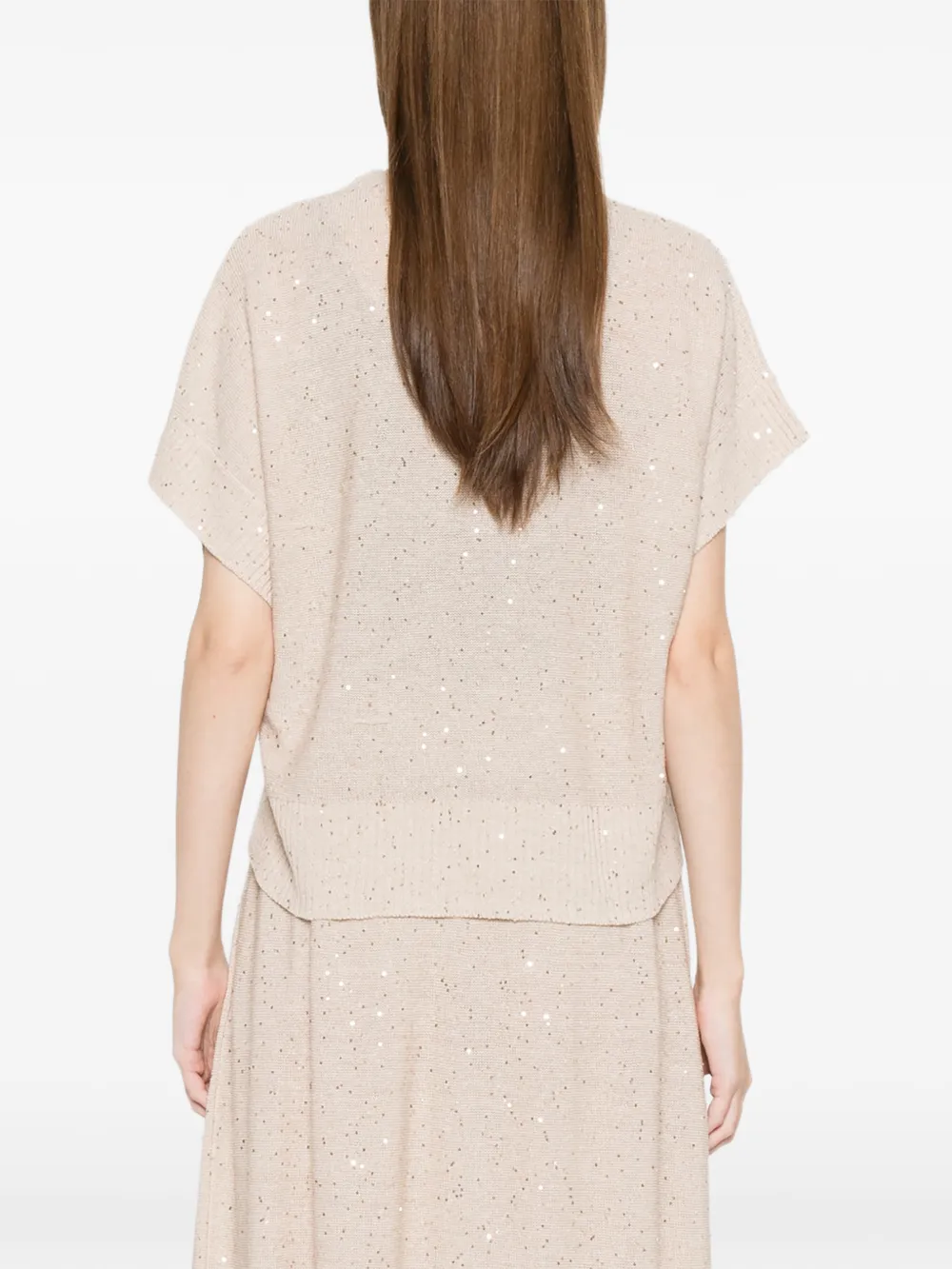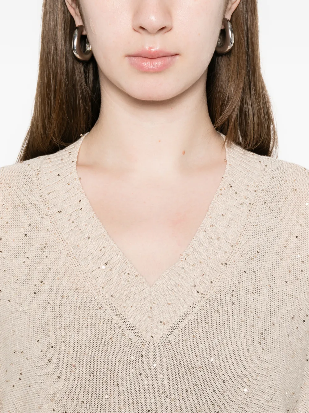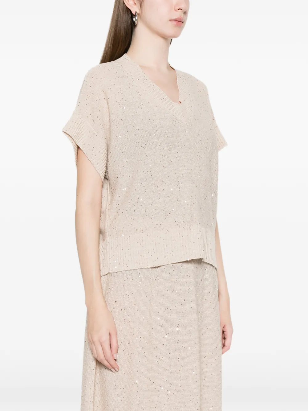 Top Antonelli V-neck bej, realizata din mix de in si bumbac, cu guler in V, maneci scurte, croiala relaxata, paiete discret dispuse pe toata suprafata si terminatii ribbed. Potrivit pentru sezonul primavara/vara. 58% in; 37% bumbac; 5% poliester.