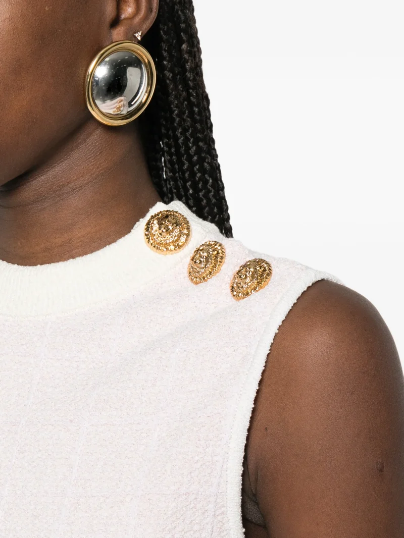 Top Balmain button-embellished alb, tricotat, cu guler rotund si trei nasturi aurii decorativi.44% bumbac 27% vascoza 21% poliamida 6% poliester 1% elastan 1% fibre metalice
