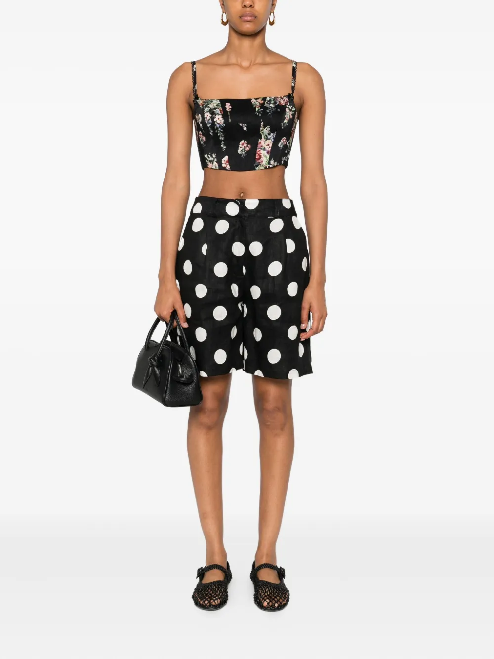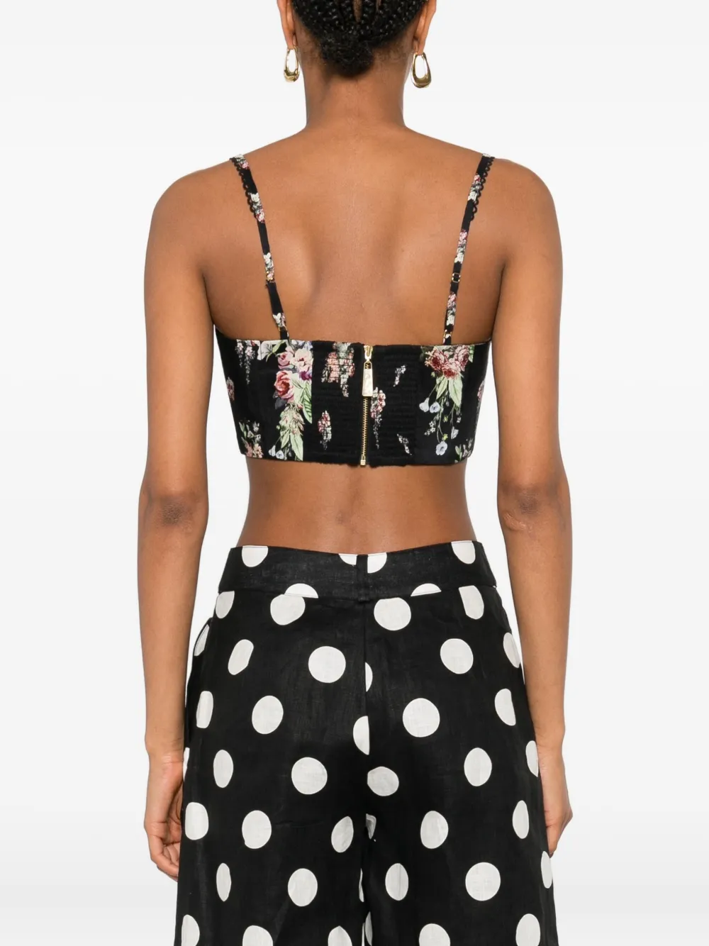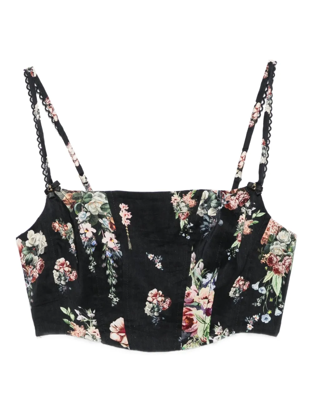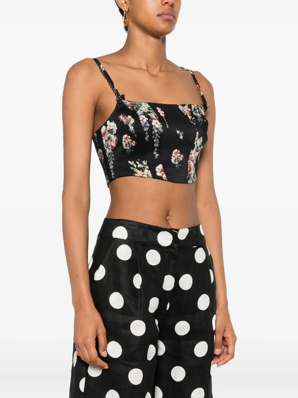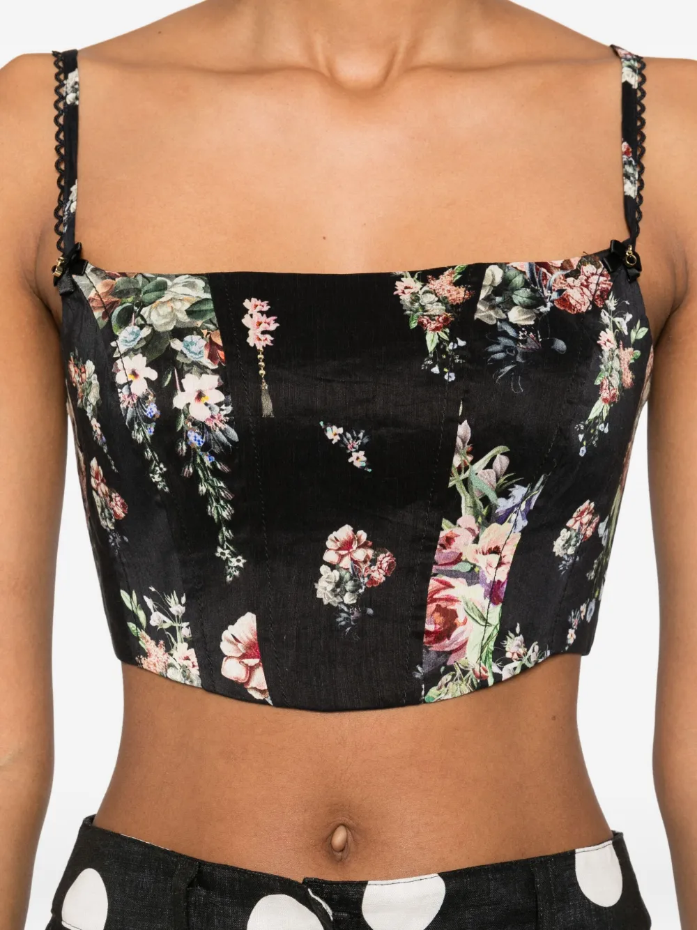 Top Camilla Noble Endeavours negru, cropped, tip corset, din in, cu barete subtiri ajustabile pentru umeri, inchidere cu fermoar la spate, grafica florala si tiv curbat. Potrivit pentru sezonul toamna/iarna. 20% matase; 80% in; 100% bumbac.
