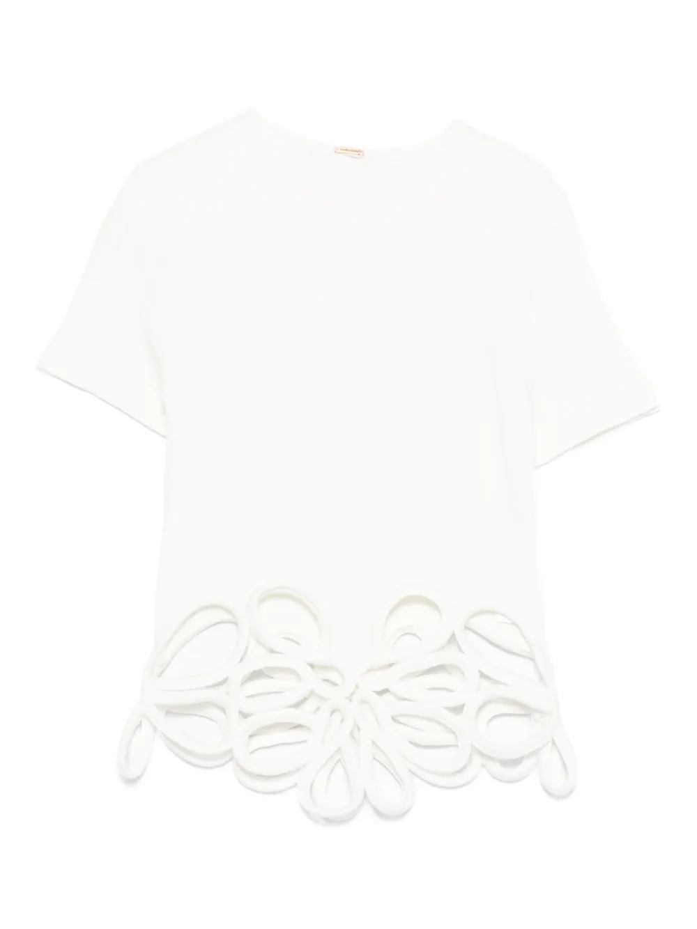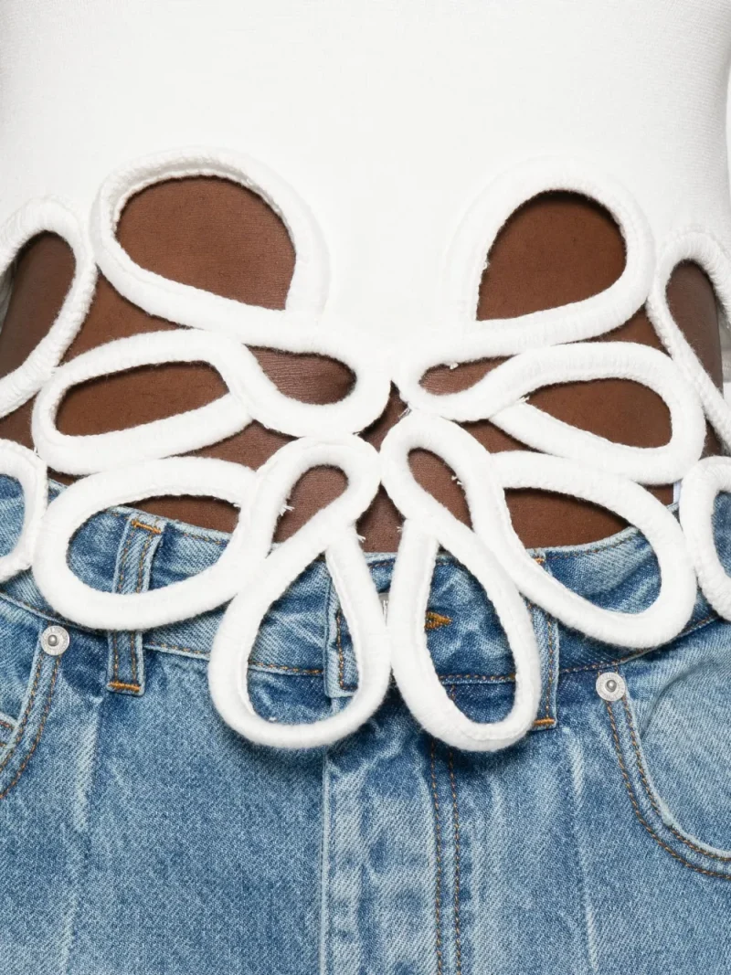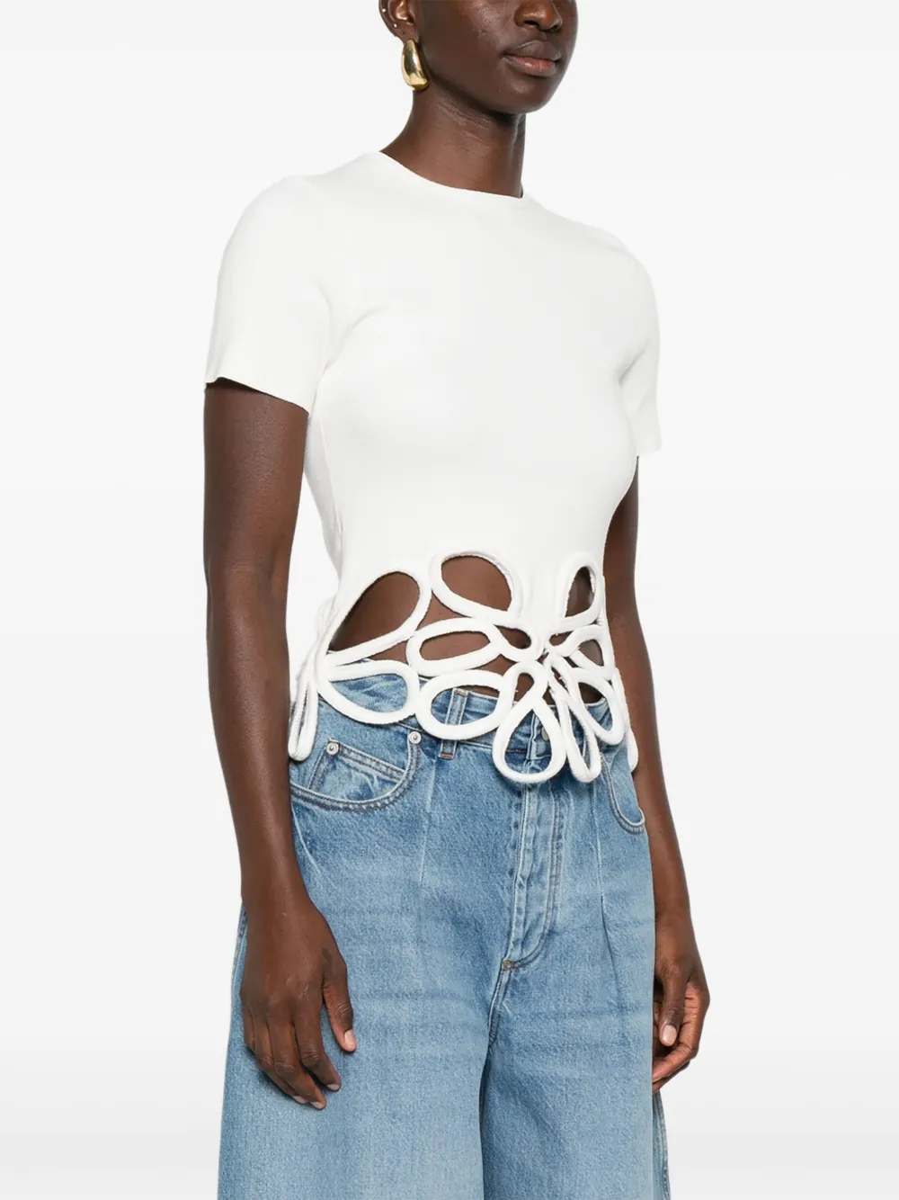 Top Cult Gaia Flower-Cutout alb, cropped, din viscoza, cu guler crewwneck, maneci scurte si decupaje cu broderii decorative. Potrivit pentru sezonul toamna/iarna. 100% viscoza.