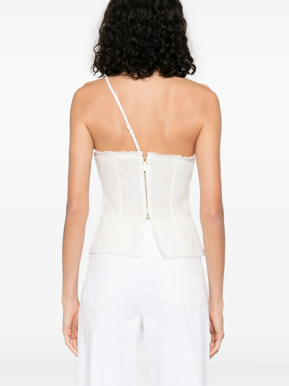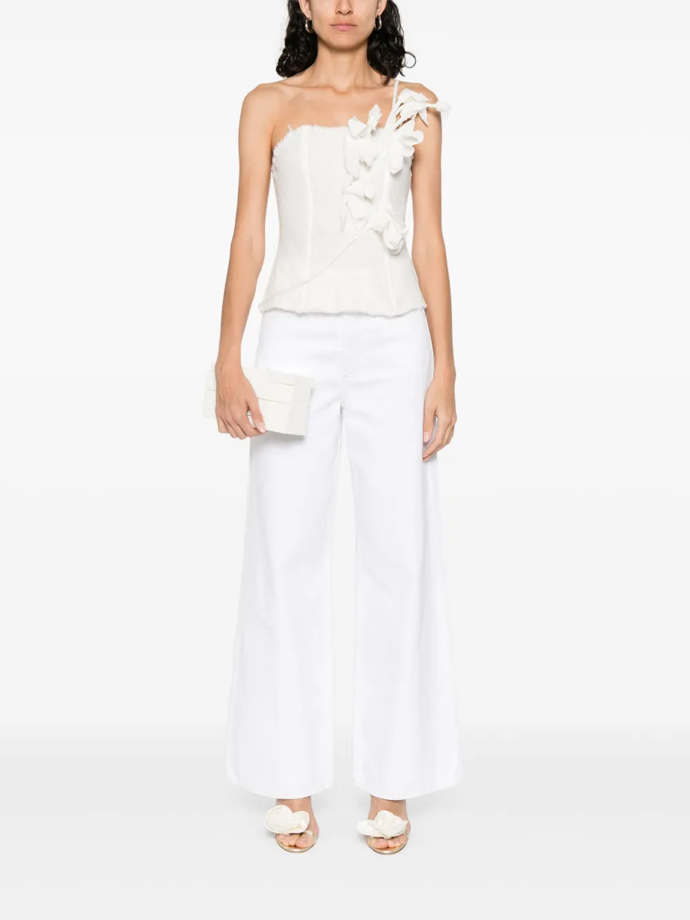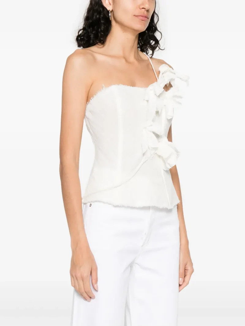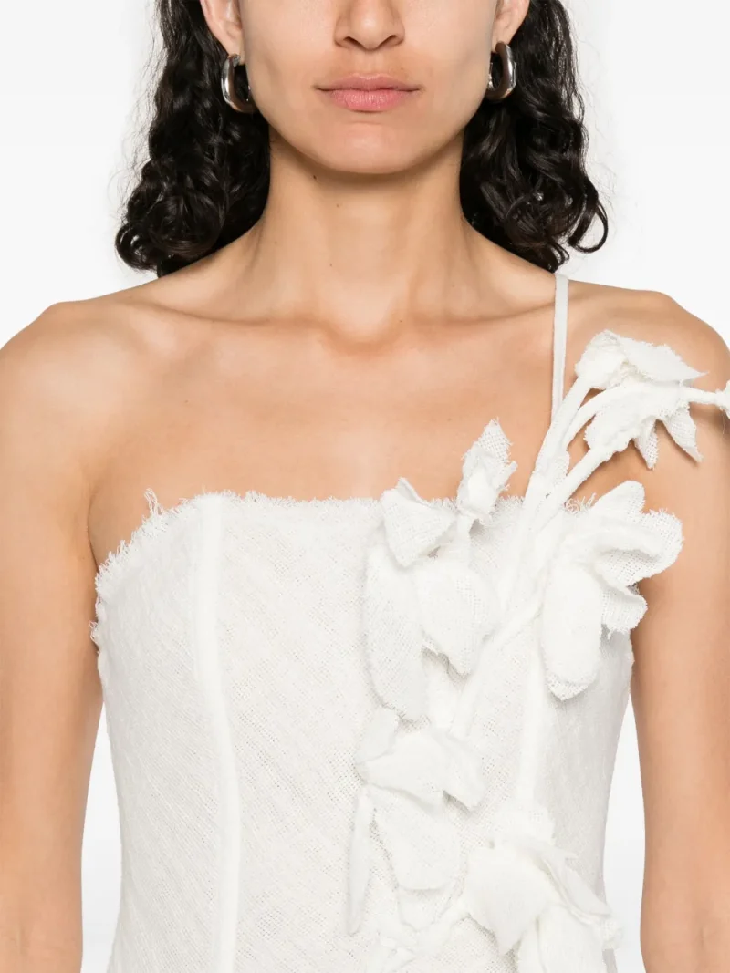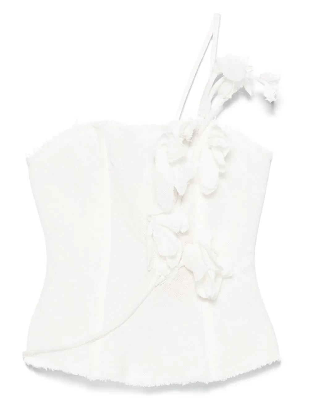 Top Cult Gaia Flower-Detailing alb, din in, tip corset, cu inchidere fermoar la spate, bareta de umar cu flori decorative in relief, tesatura texturata si tiv drept. Potrivit pentru sezonul primavara/vara. 5% nailon; 95% in.
