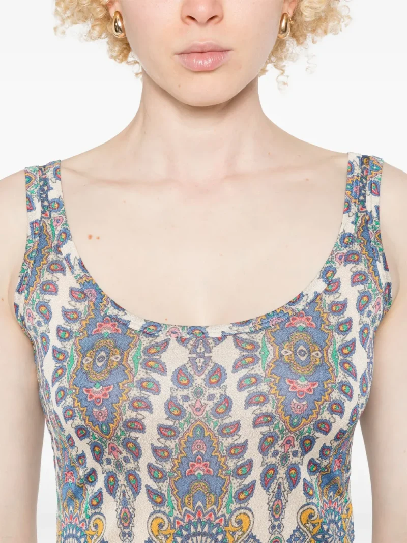 Top ETRO Graphic-Print multicolor, din viscoza, cu barete pentru umeri, decolteu rotund, spatele gol, model floral imprimat pe toata suprafata si tiv drept. Potrivit pentru sezonul primavara/vara. 100% viscoza.