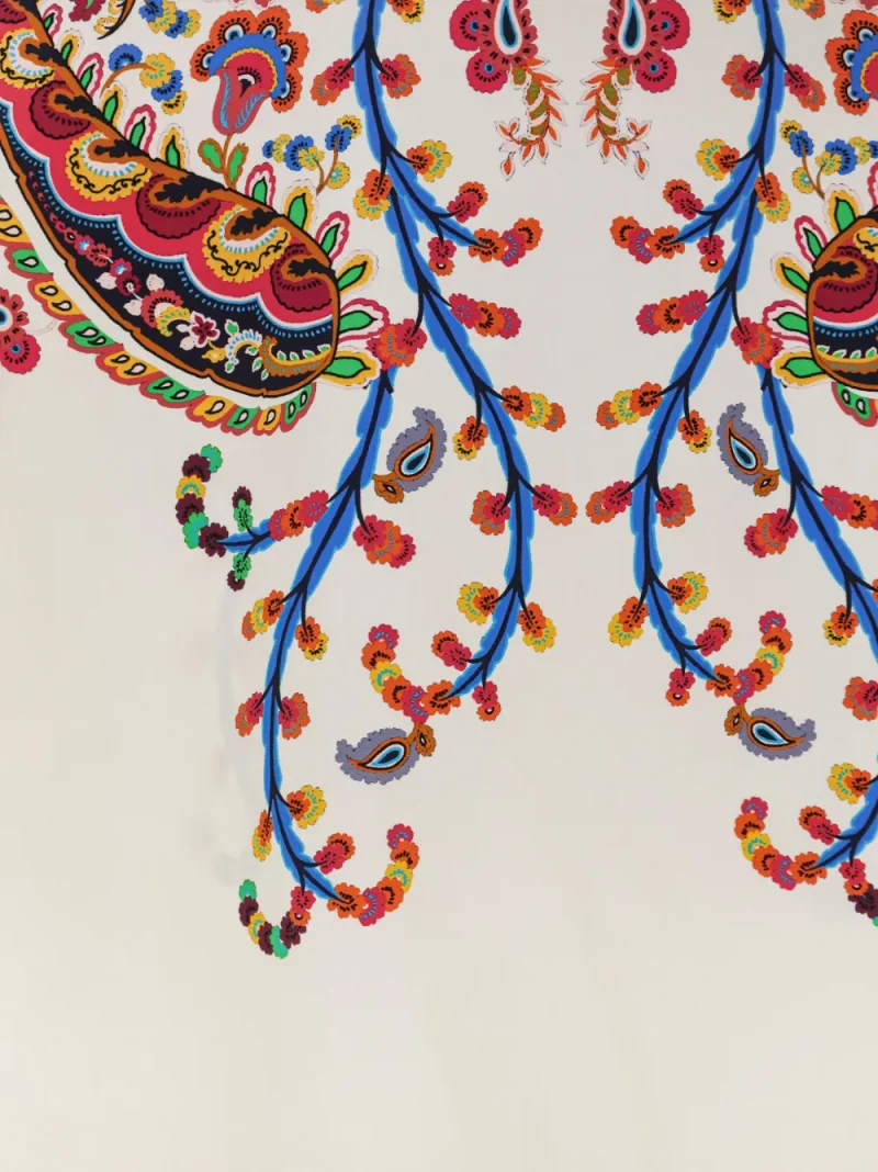 Top ETRO Silk bej, realizat din matase, cu guler rotund, inchidere cu fermoar la spate, maneci scurte, grafica Paisley imprimata in partea superioara si tiv drept. 100% matase.