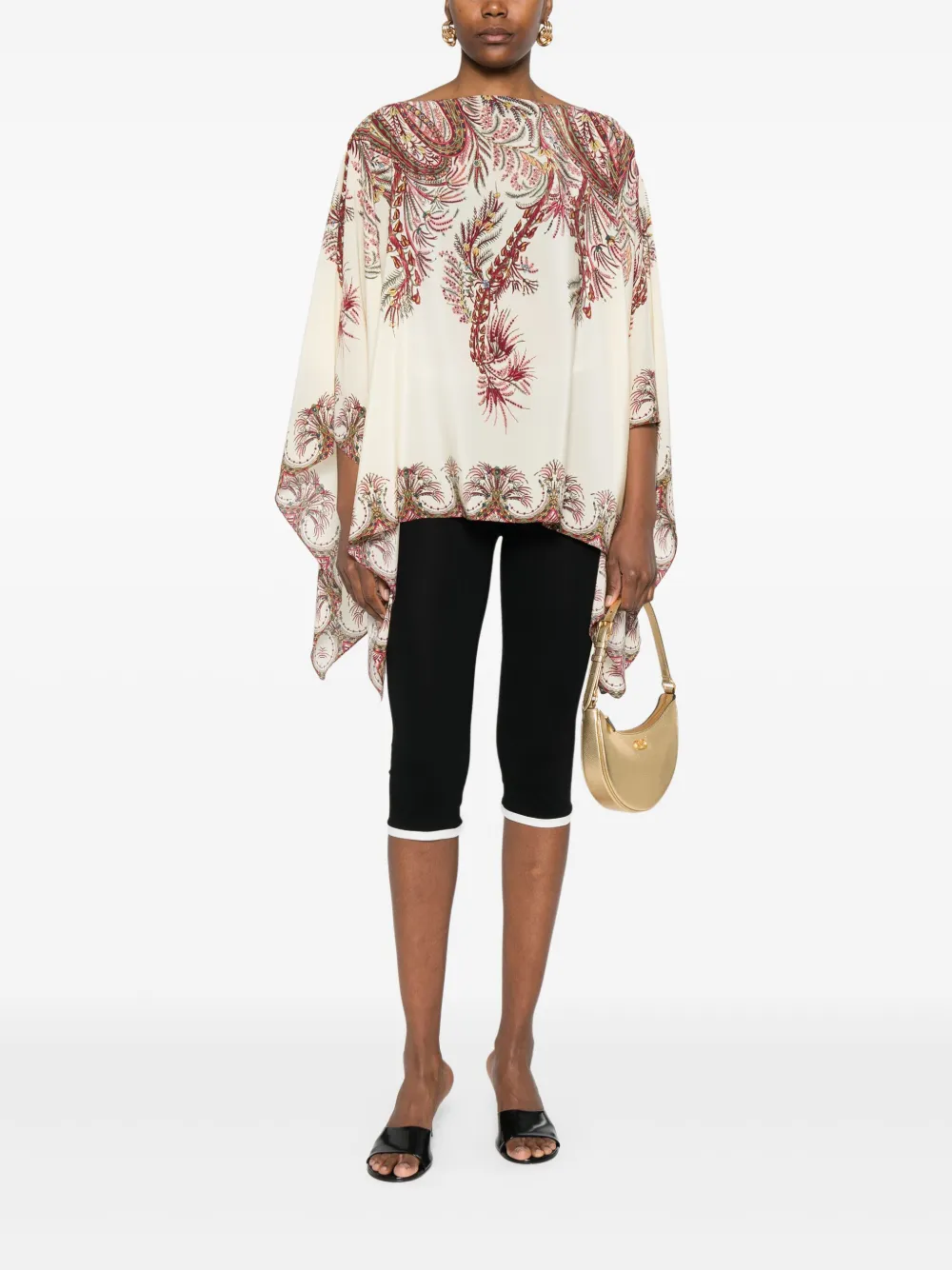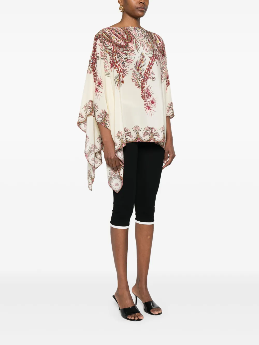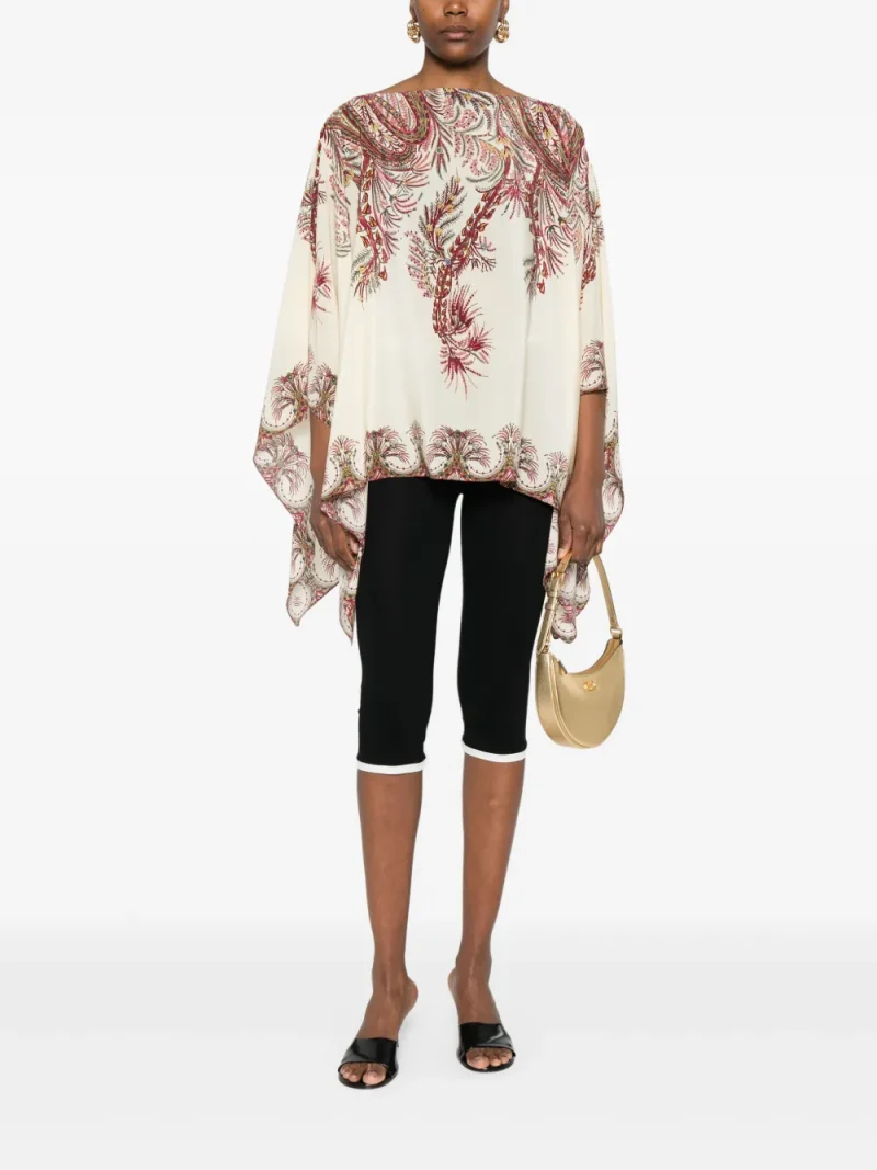 Top ETRO Silk ecru, din matase, cu guler barcuta, maneci batwing, grafica florala imprimata in contrast si tiv drept. Potrivita pentru sezonul toamna/iarna. 100% matase.