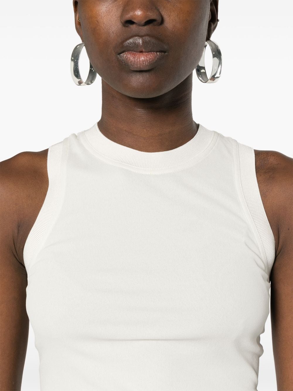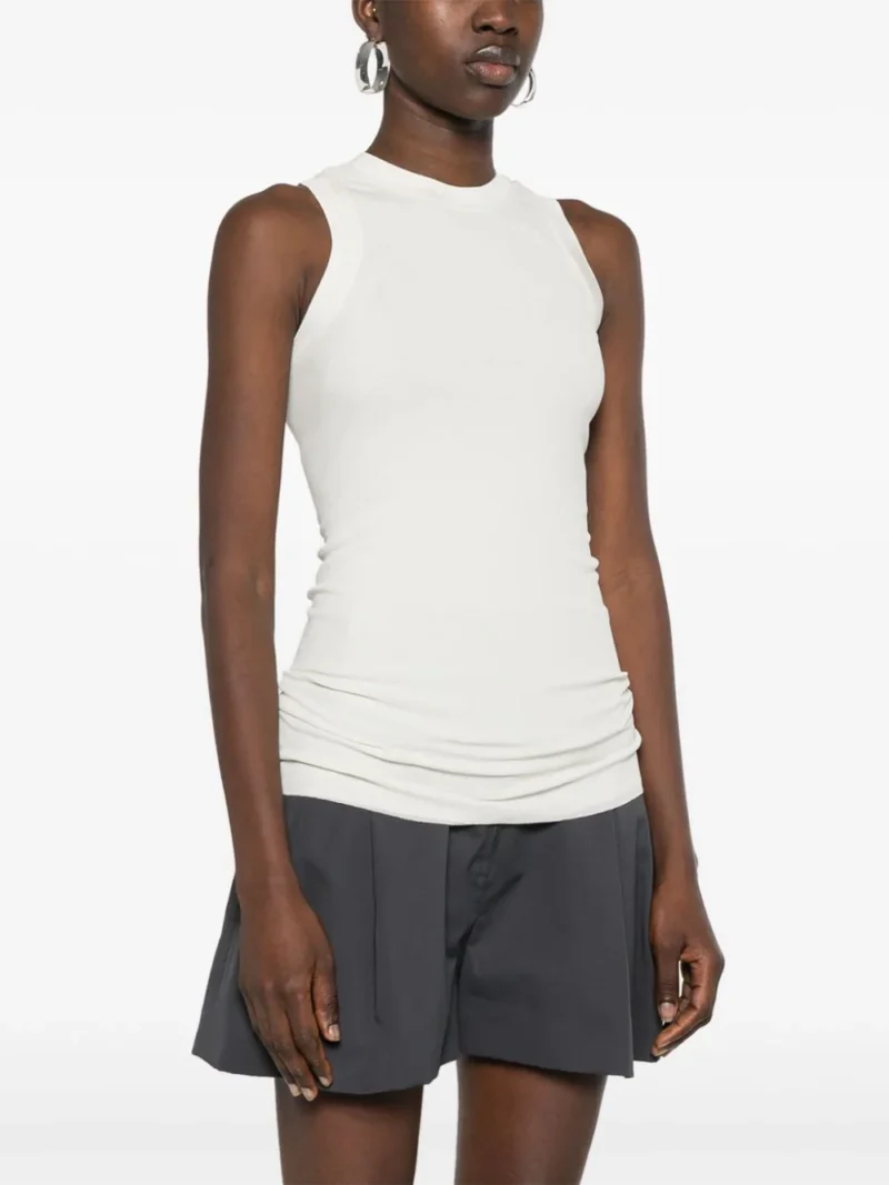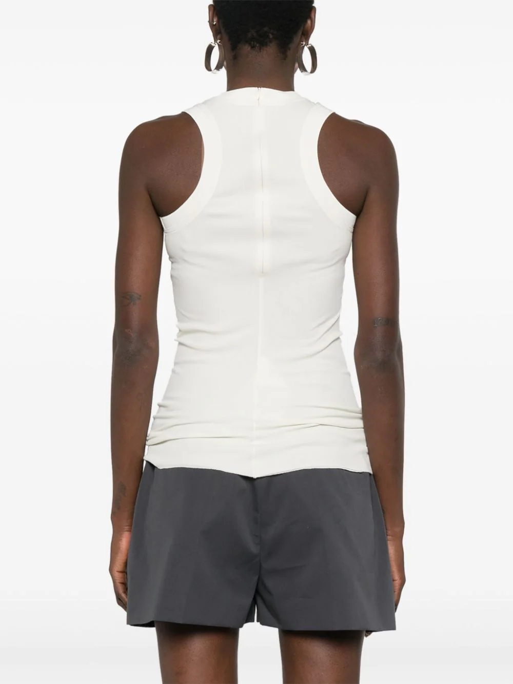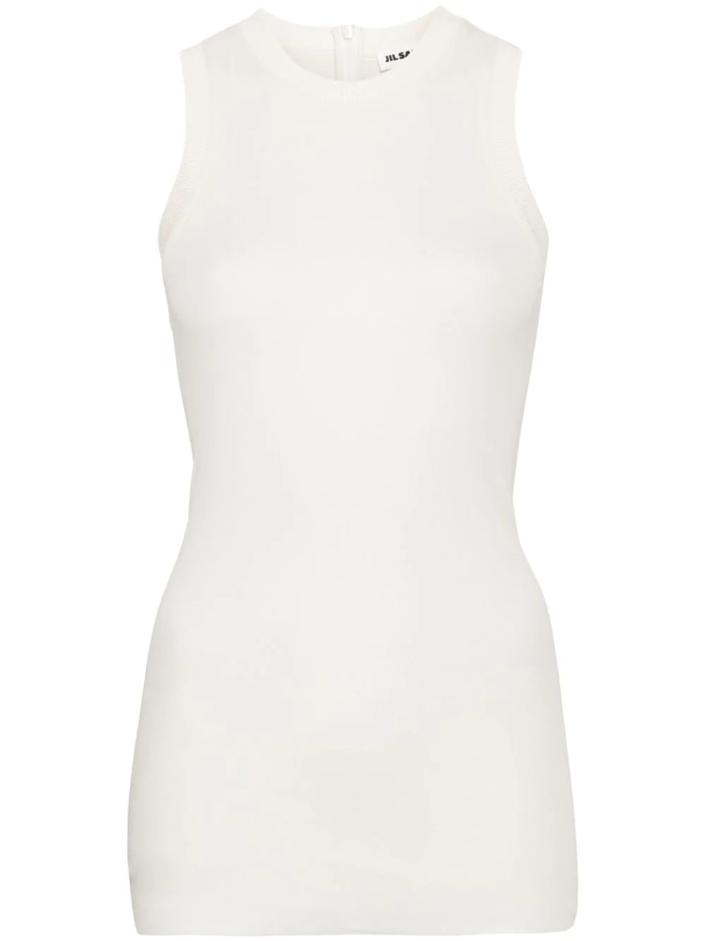 Top alb din matase, fara maneci, cu guler rotund, inchidere fermoar ascuns la spate, captuseala din matase si tiv drept. Potrivit pentru sezonul primavara/vara, 100% matase.
