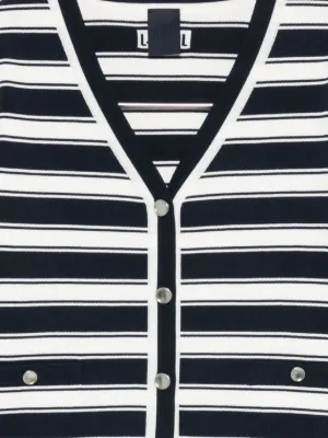 Top Juun.J Horizontal-Stripe Puff-Sleeve bleumarin, cu guler in V, inchidere cu nasturi, maneci scurte bufante, grafica in dungi, logo brodat la spate, buzunare laterale si terminatii ribbed. Potrivit pentru sezonul primavara/vara. 50% rayon; 30% poliester; 20% elastan.