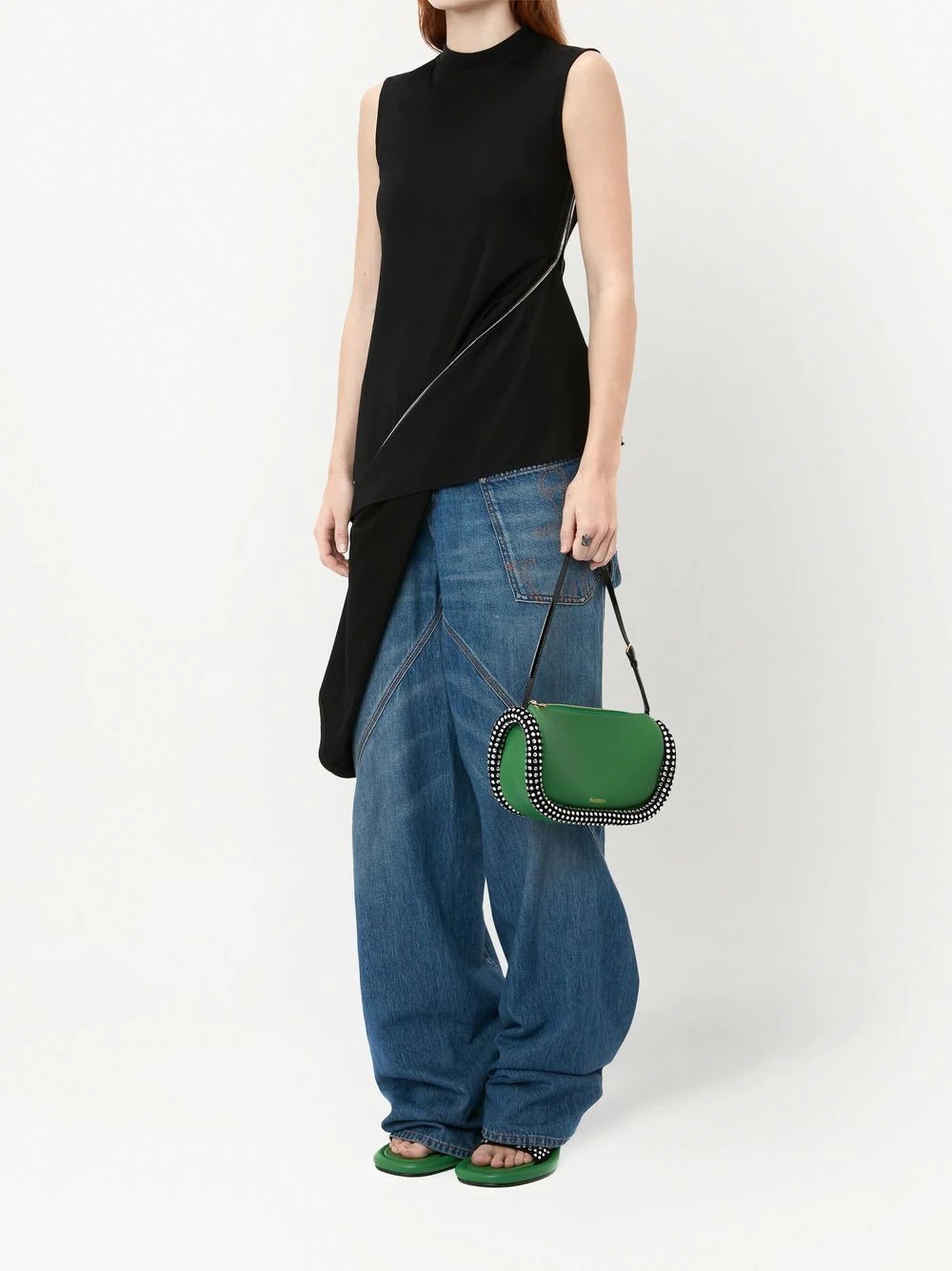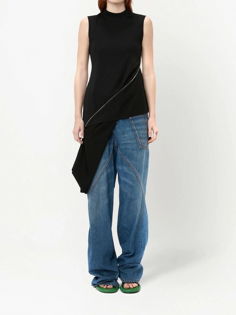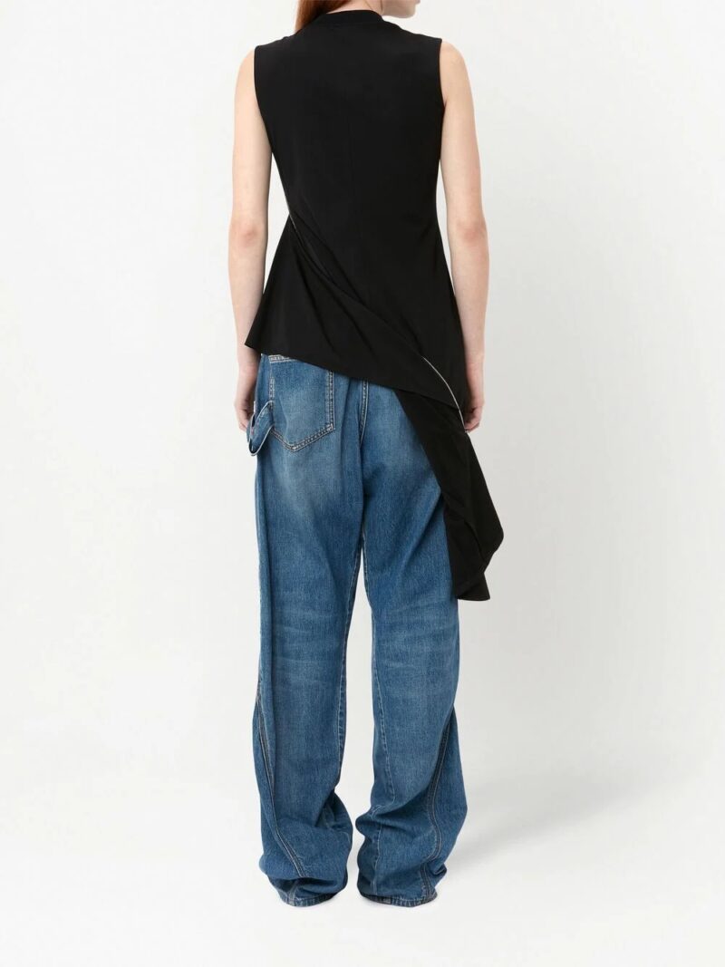 Top negru din viscoza, fara maneci, cu guler rotund, croiala hibrid cu fermoar decorativ, eticheta JW Anderson cusuta si tiv asimetric. Potrivit pentru sezonul primavara/vara. 50% viscoza; 35% nailon; 11% elastan.