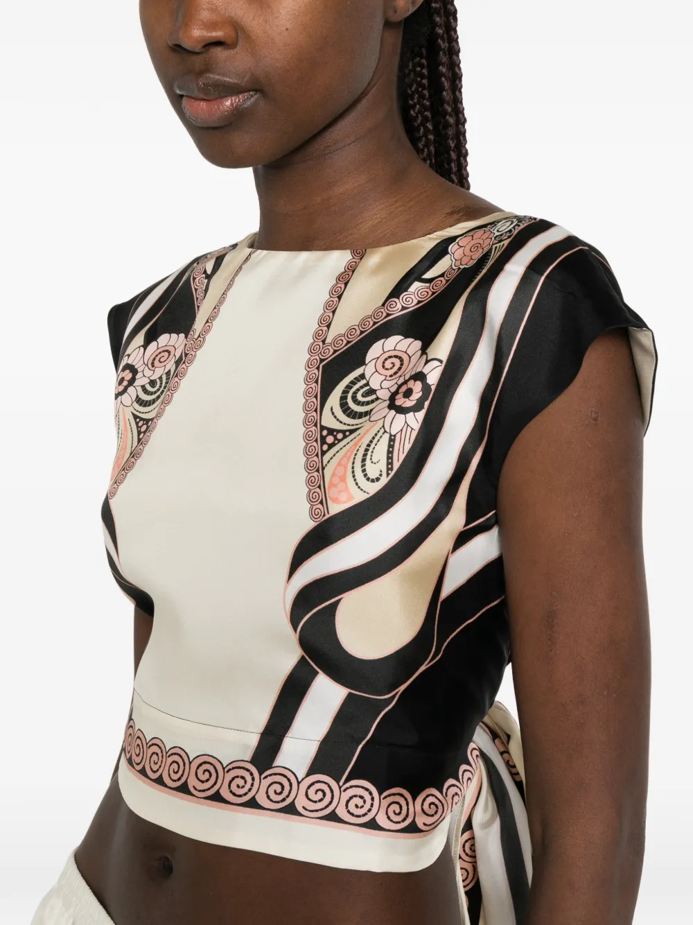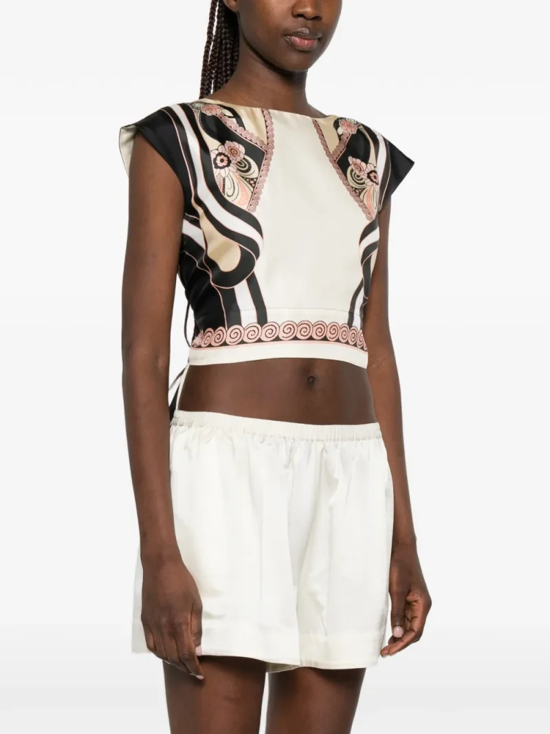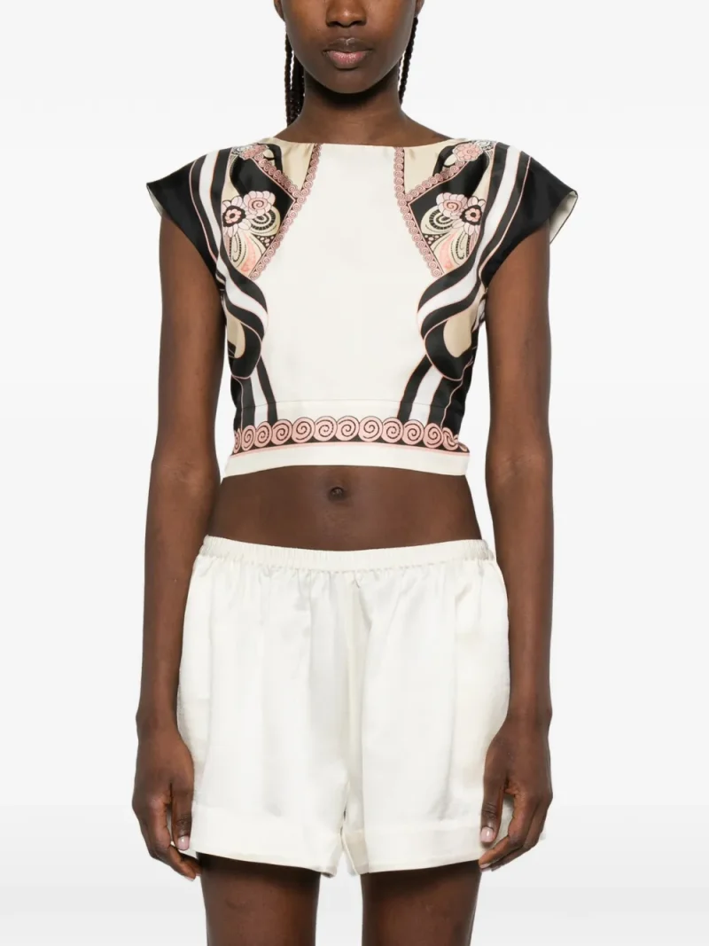 Top La DoubleJ Graphic-Print bej, cropped design, cu guler rotund, maneci scurte, grafica plasata manual, inchidere cu funda la spate si tiv drept. Potrivit pentru sezonul primavara/vara. 100% matase.