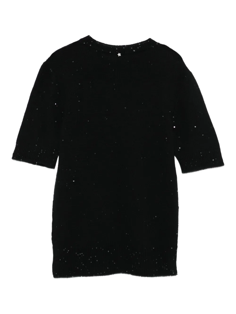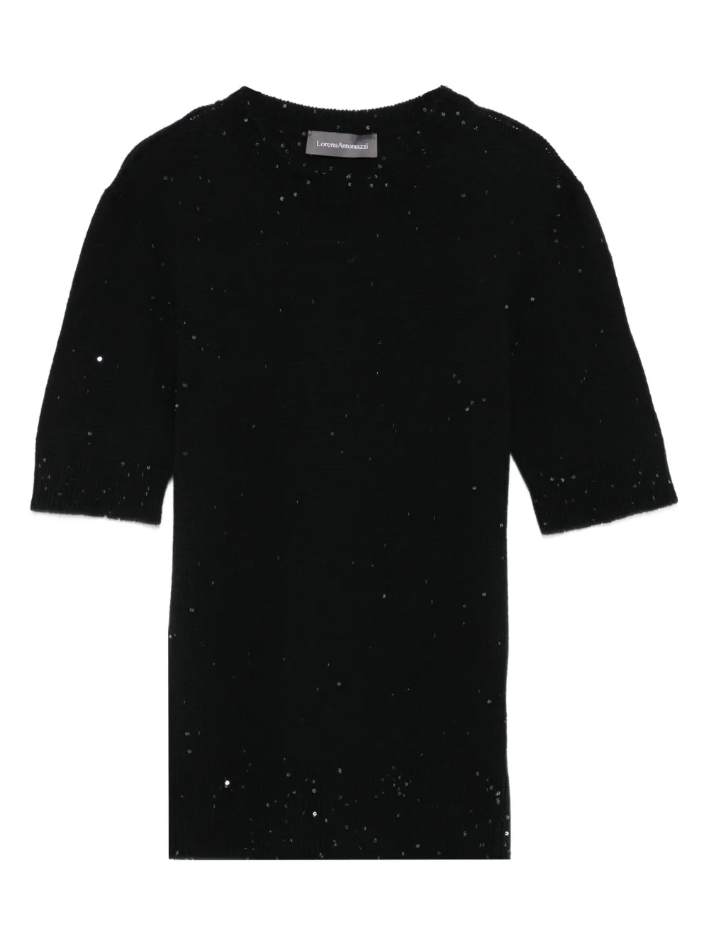 Top Lorena Antoniazzi Sequin-Embellished negru, tricotat din lana, cu guler crewneck, maneci scurte, paiete sclipioare in tesatura si terminatii ribbed. Potrivit pentru sezonul toamna/iarna. 83% lana; 8% casmir; 7% matase; 2% poliester.
