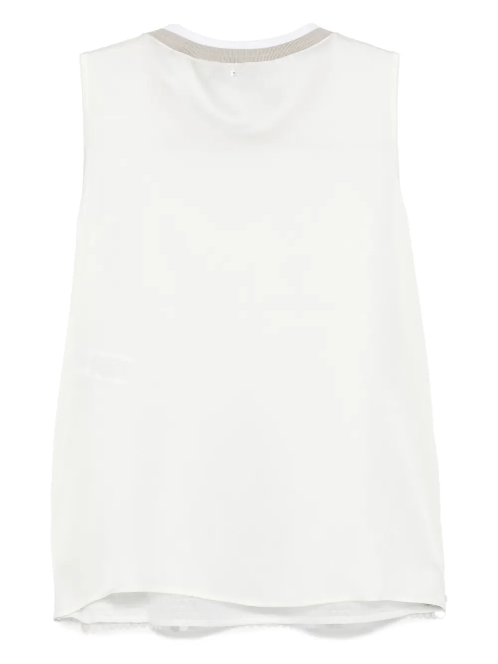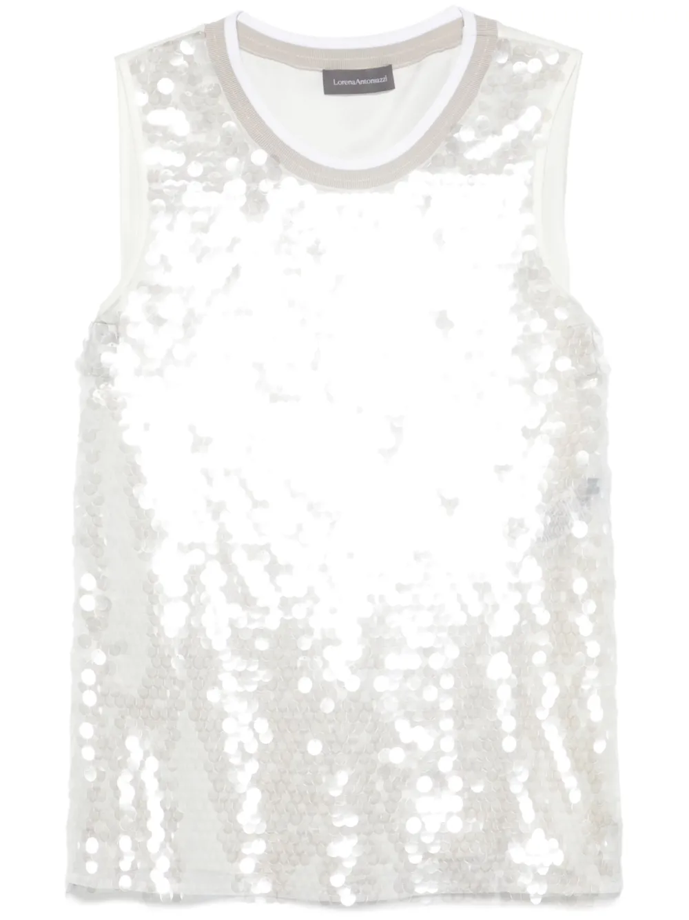 Top Lorena Antoniazzi Sequined alb, din mix de materiale, cu guler crewneck, fara maneci, decorat frontal cu paiete sclipitoare si tiv drept. Potrivit pentru sezonul primavara/vara. 100% poliester; 70% acetat; 30% matase.