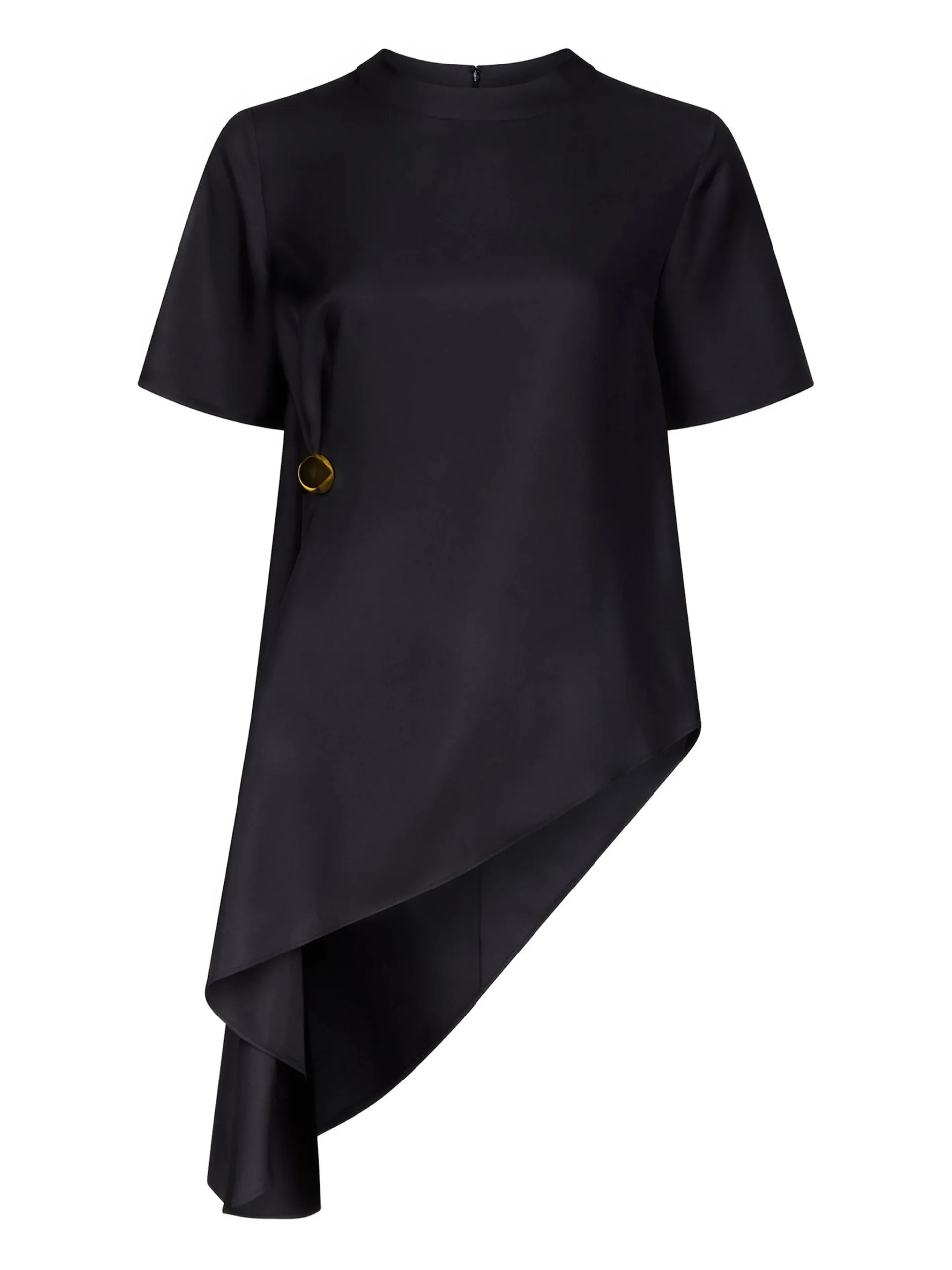 Top LouLou De Saison MADEA negru, din matase, cu design asimetric, detaliu aurit, maneci scurte si decolteu rotund. 100% matase