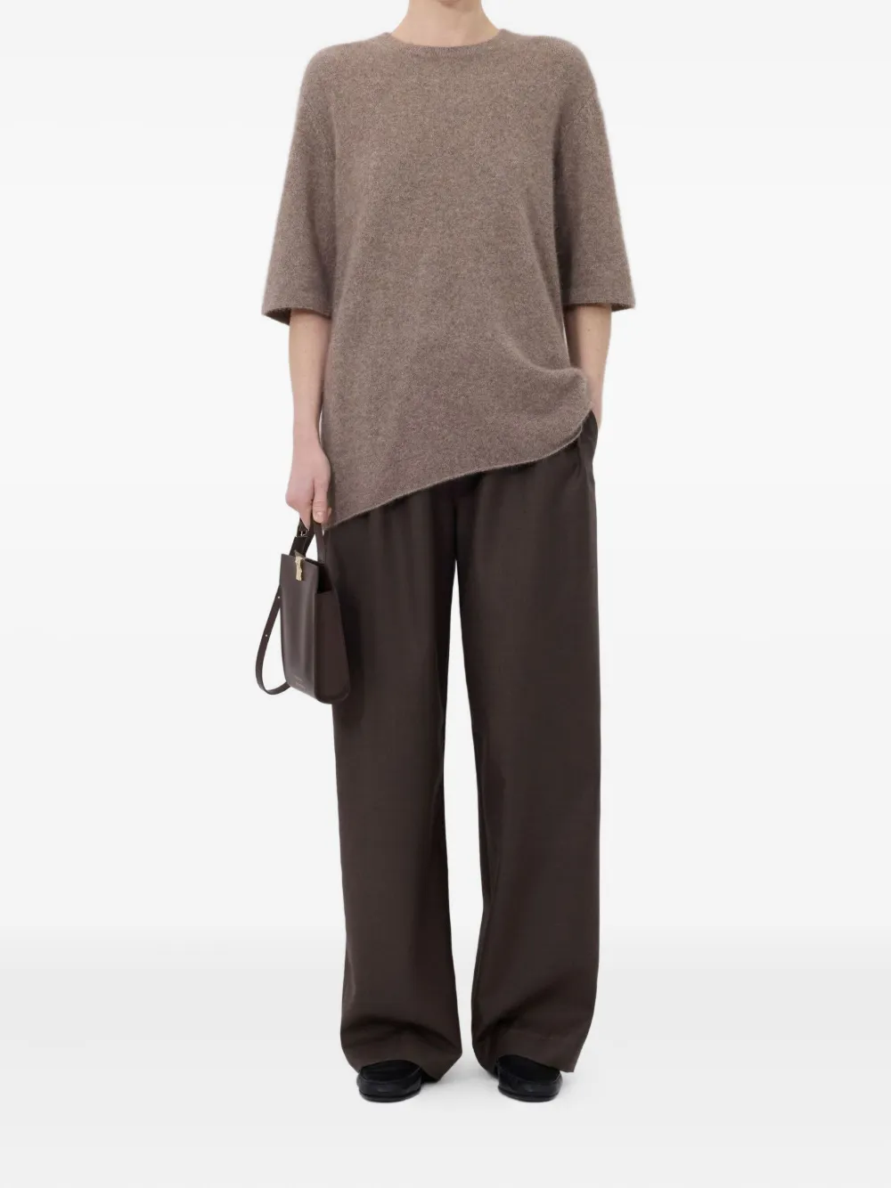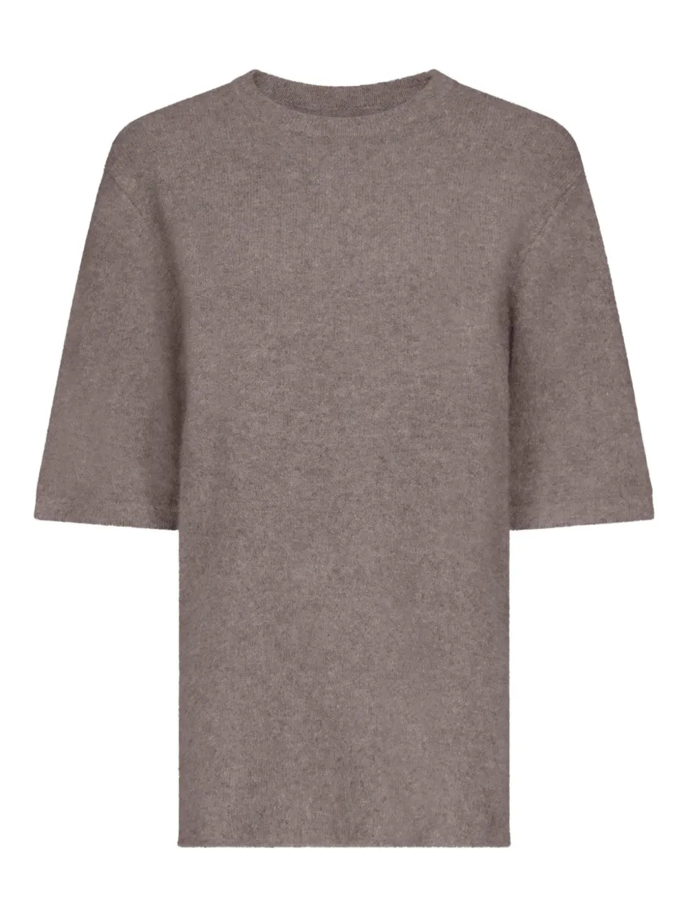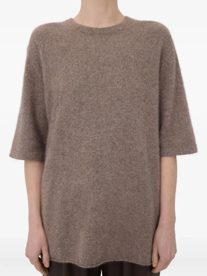 Top LouLou de Saison Short-Sleeve maro, design minimalist tricotat din lana, cu guler rotund, umeri cazuti, maneci medii si terminatii ribbed. Potrivit pentru sezonul toamna/iarna. 50% lana; 40% yac; 10% nylon.