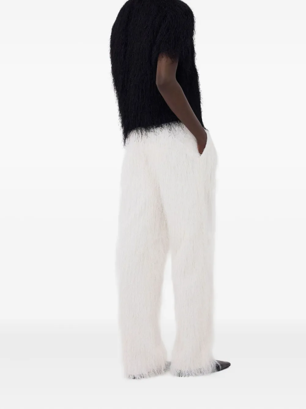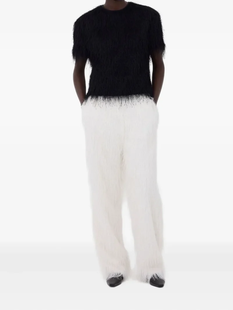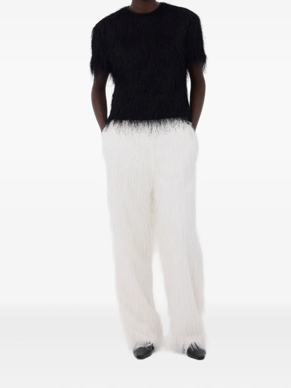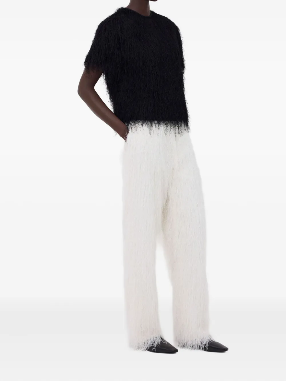 Top LouLou de Saison Zaro Fringed Short-Sleeve negru, cu guler crewneck, inchidere cu fermoar la spate, maneci scurte si tesatura eyelash yarn. Potrivit pentru sezonul toamna/iarna. 100% poliester.