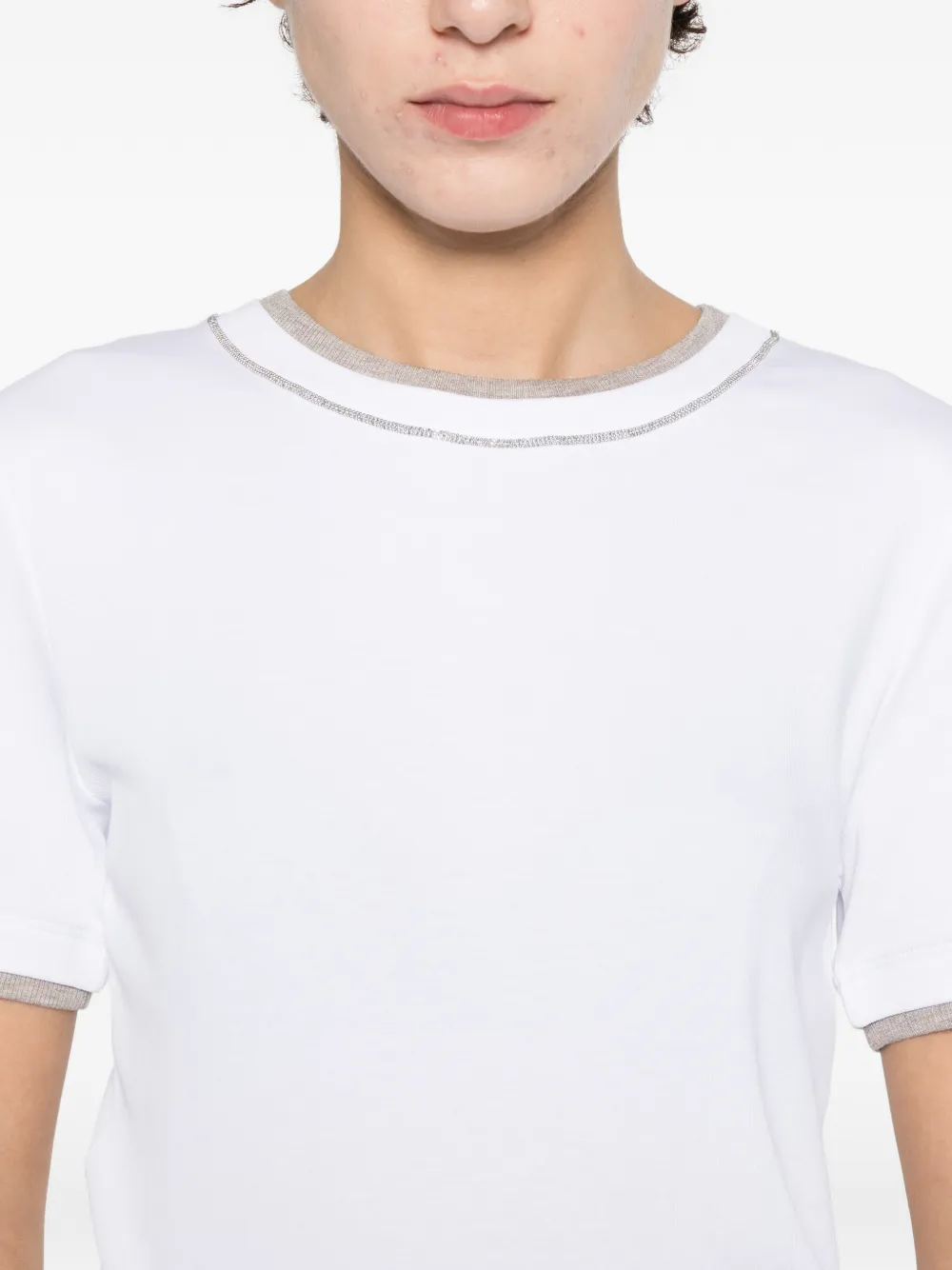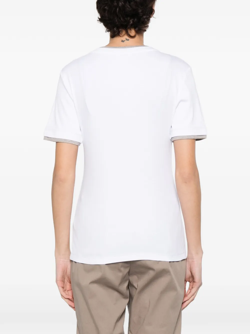 Top Peserico Crew-Neck alb, realizat din bumbac, cu guler crewneck, maneci scurte, si terminatii decorate cu fibre metalice specifice brandului. Potrivit pentru sezonul primavara/vara. 94% bumbac; 6% nylon.