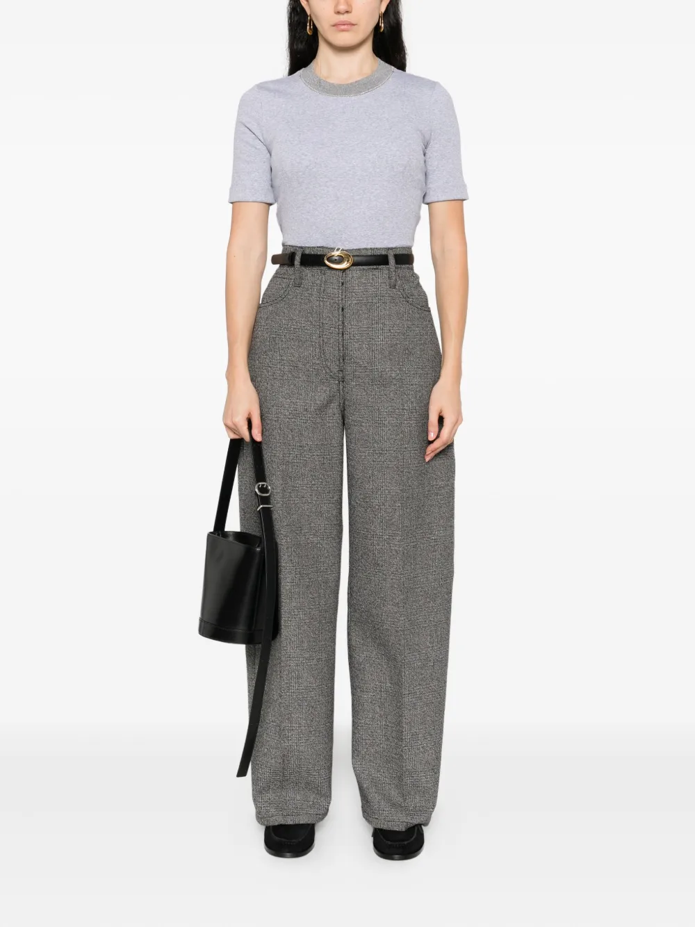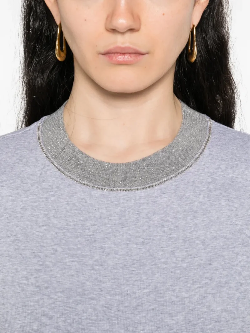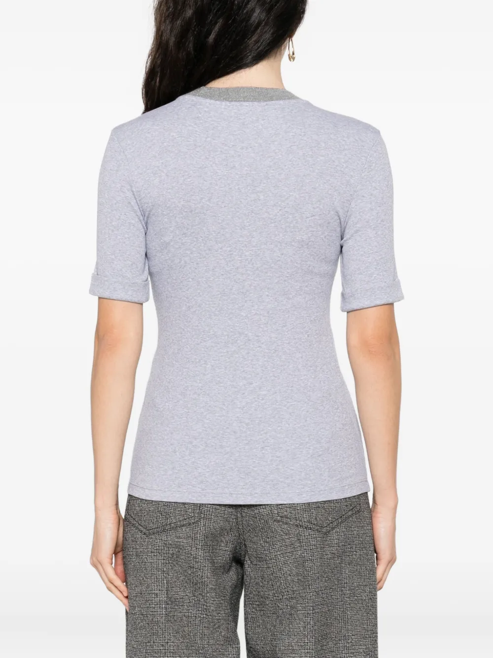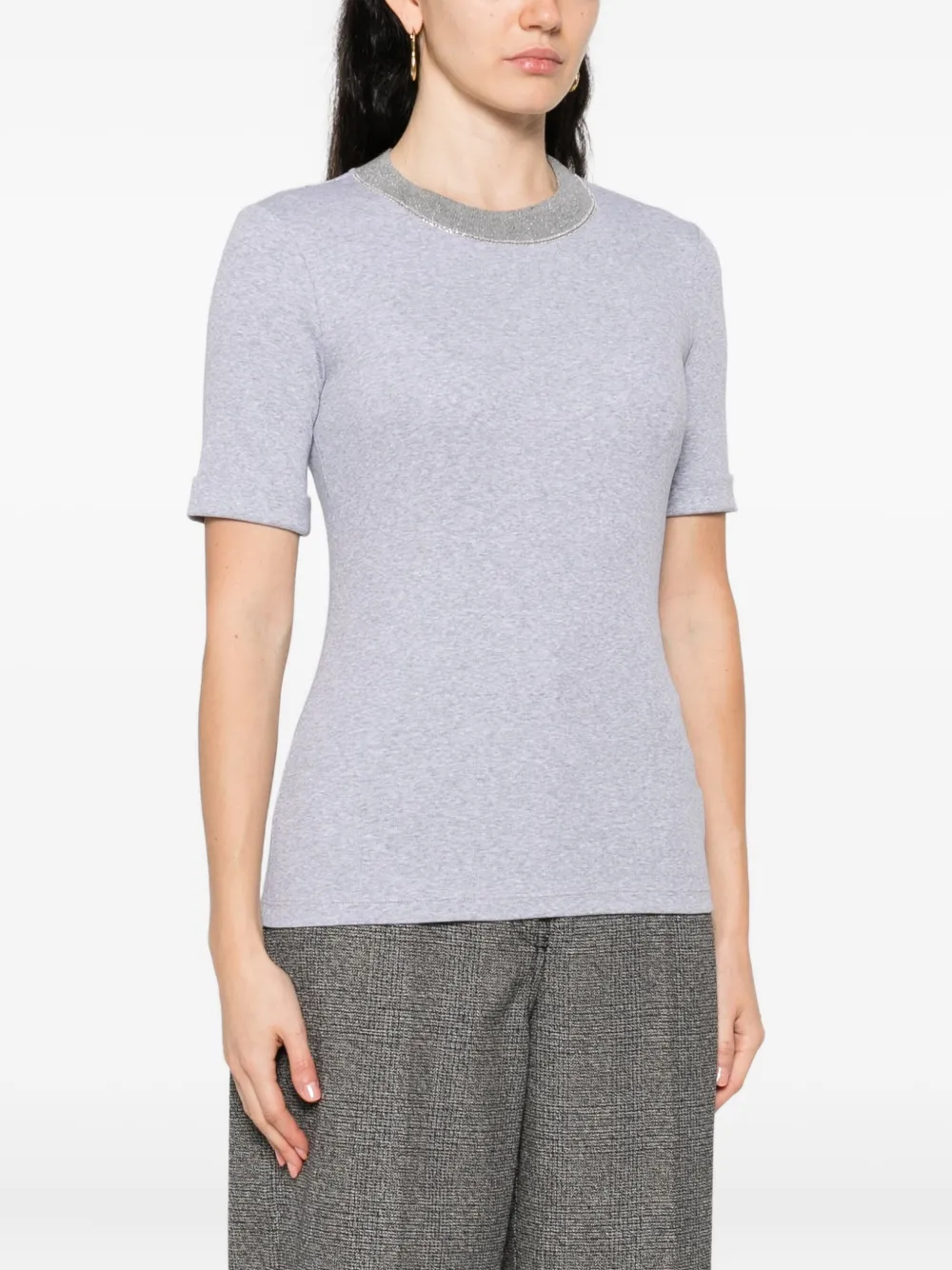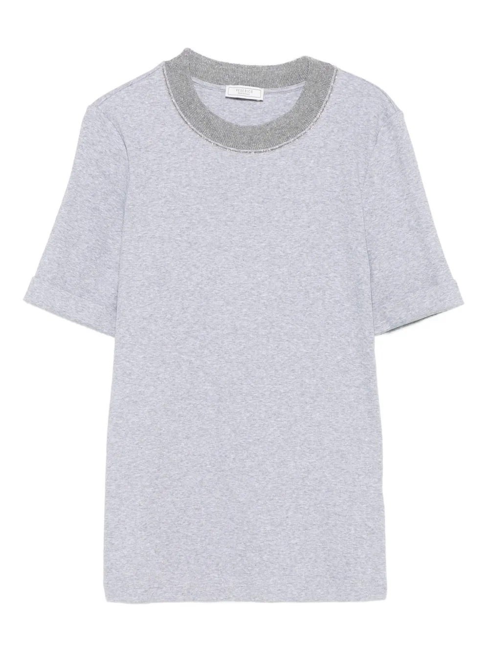 Top Peserico Embellished-Neck gri, din bumbac, cu guler crewneck in contrast si fibre metalice, maneci scurte si tiv drept. Potrivit pentru sezonul toamna/iarna. 94% bumbac; 83% lana; 9% casmir; 8% poliester; 6% elastan.