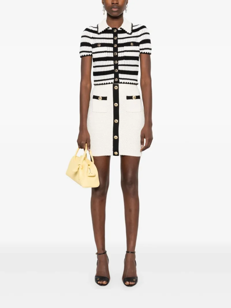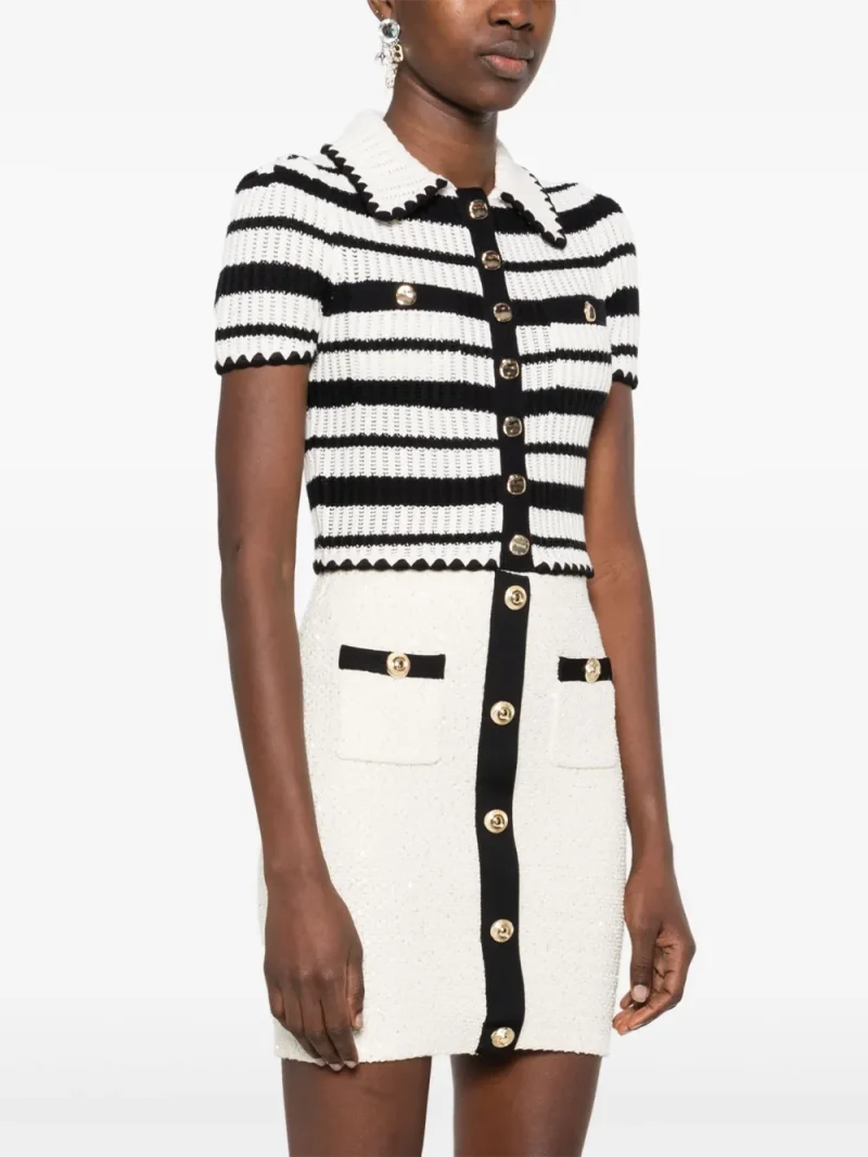 Top Self-Portrait Striped Crochet alb, crosetat integral din bumbac, cu guler clasic, inchidere cu nasturi,buzunare aplicate la piept, maneci scurte, dungi in tesatura si tiv drept. Potrivita pentru sezonul primavarav