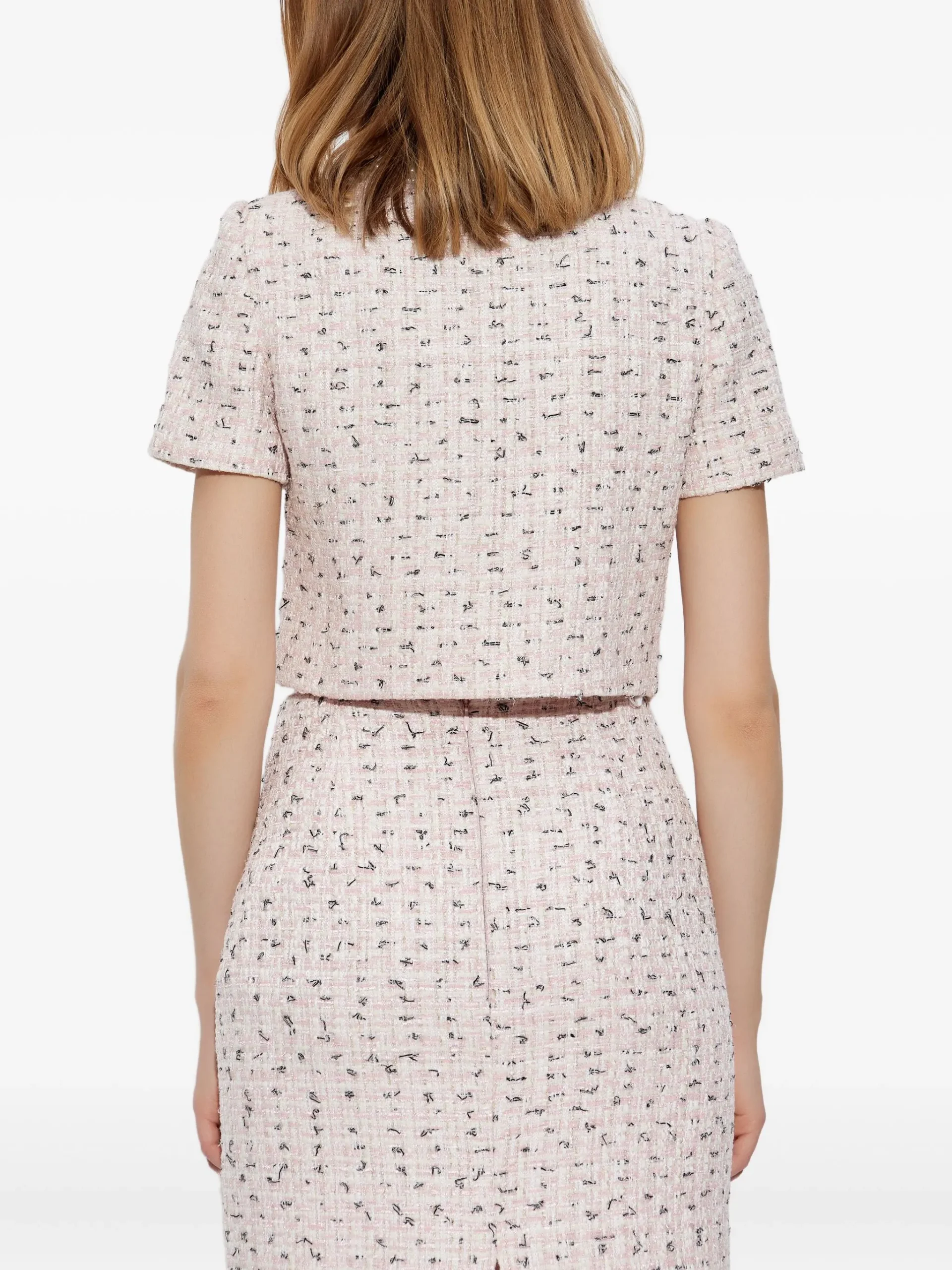 Top Self-Portrait Tweed roz, inchidere cu nasturi, doua buzunare pe partea din fata, maneci scurte si tiv drept. 98% poliester 2% metal