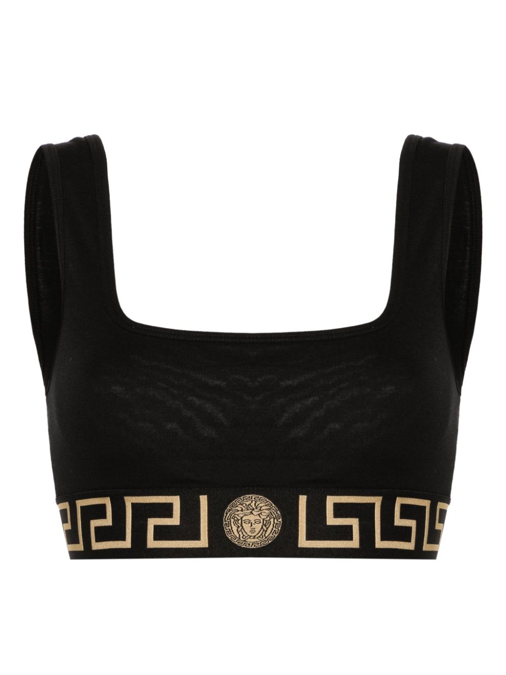 Top Versace Medusa Head Cropped negru, cropped, din bumbac, cu decolteu patrat si banda elastica in talie cu model Versace Greca in tesatura. 94% bumbac; 6% elastan; 94% bumbac; 6% elastan.