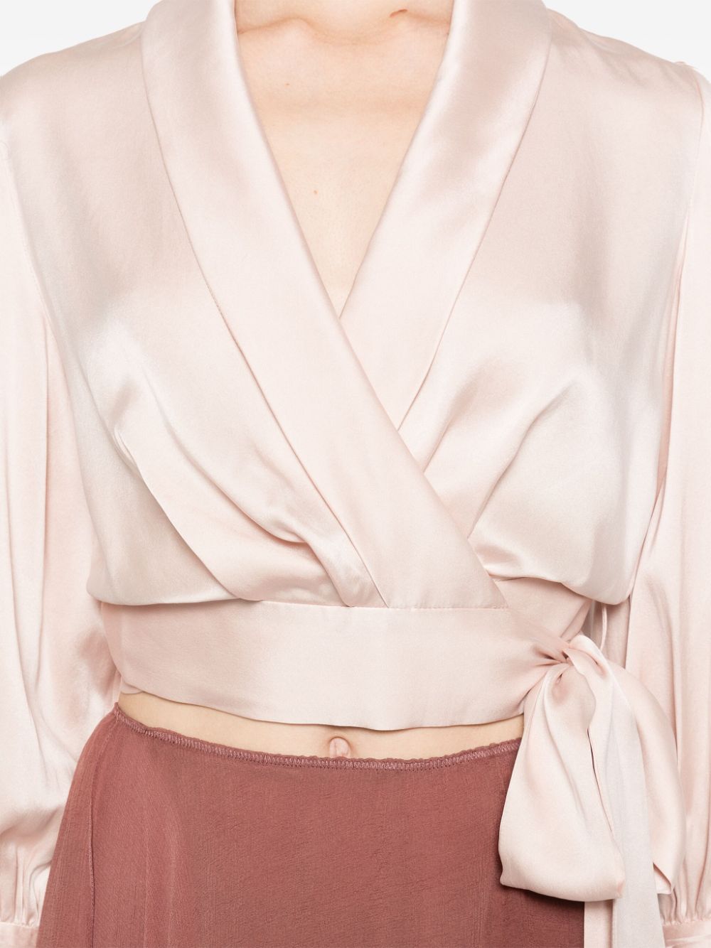 Top Zimmermann Silk Wrap roz, din matase satinata, cropped, cu decolteu in V si guler drapat, design petrecut, maneci bufante lungi, mansete late cu fermoar si cordon tip funda. Potrivit pentru sezonul primavara/vara. 100% matase