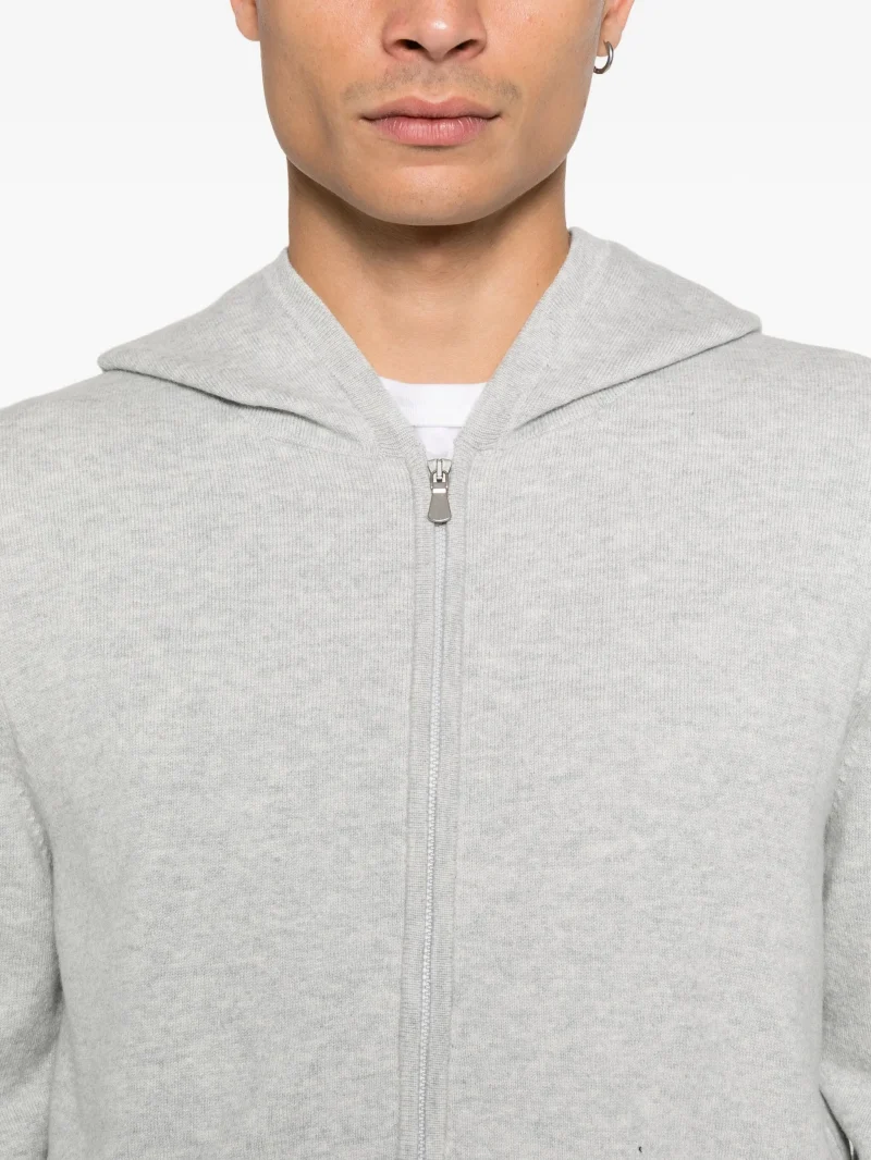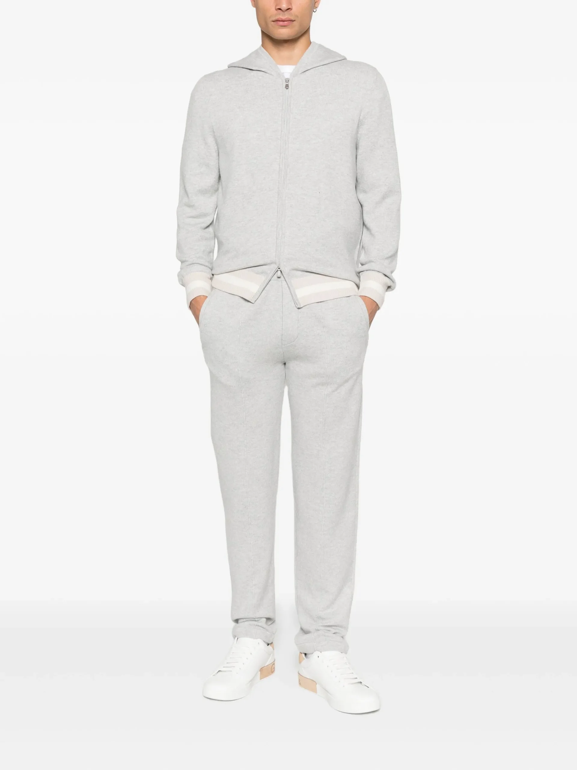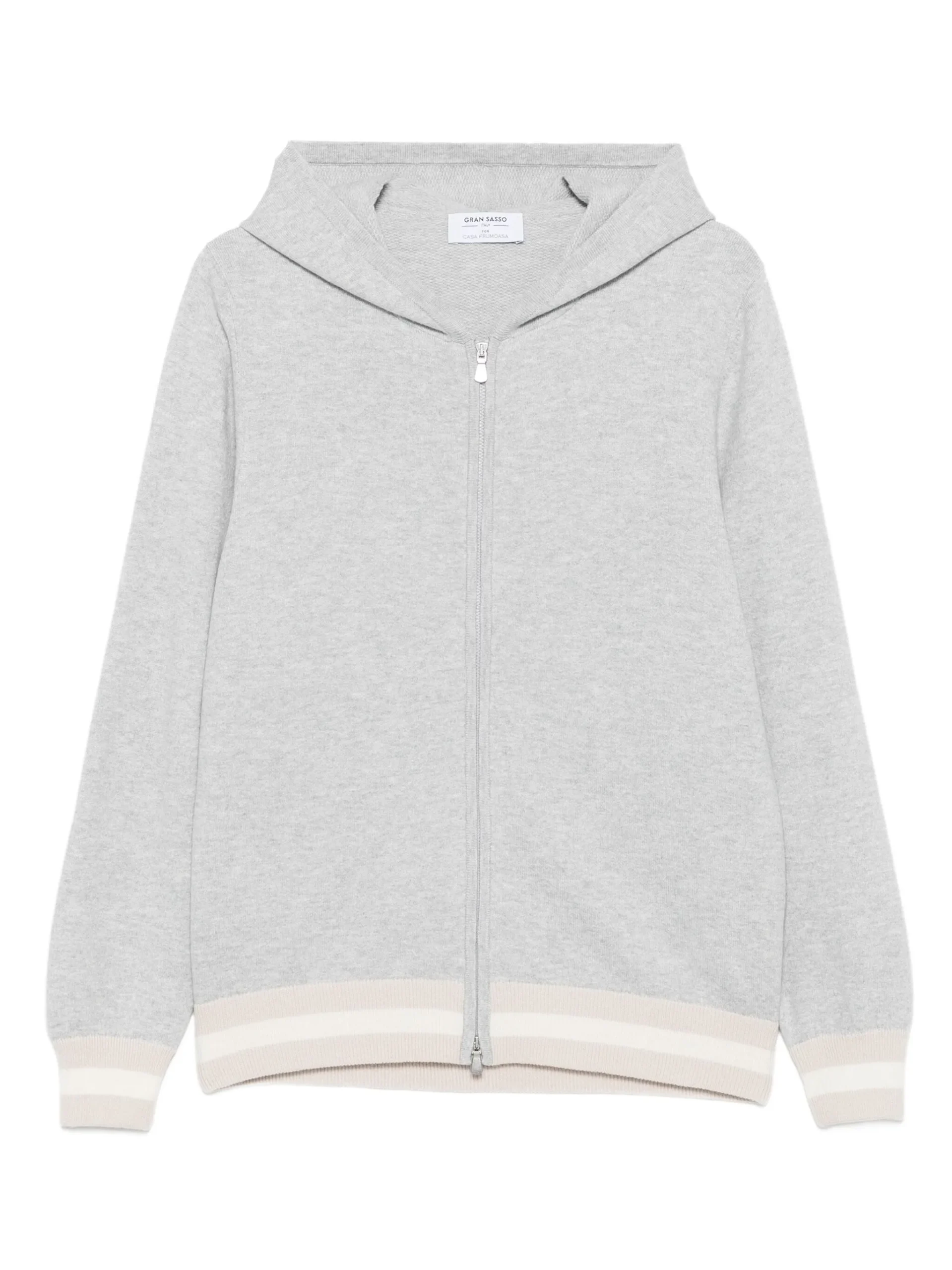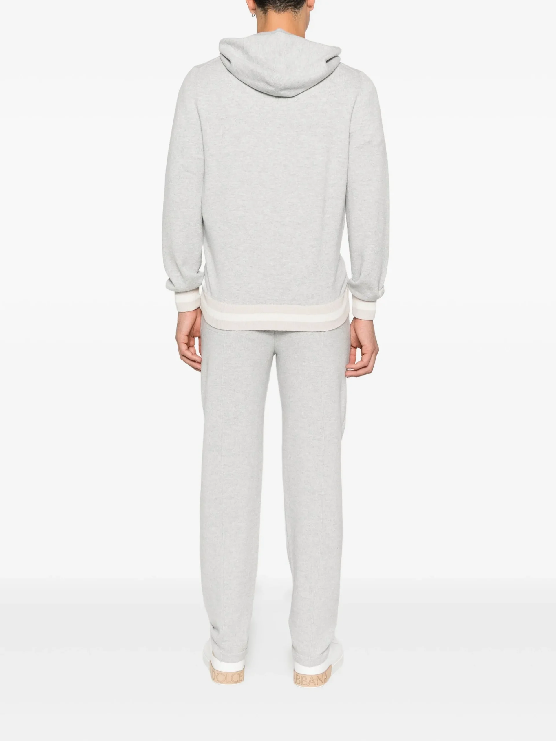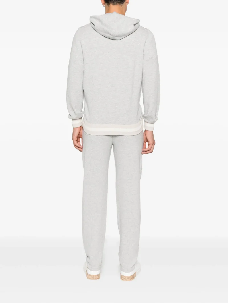 Trening Gran Sasso x Casa Frumoasa gri deschis, cu dungi decorative contrastante, inchidere cu fermoar si gluga ajustabila. Un set confortabil si elegant, ideal pentru o tinuta casual sau de calatorie.80% lana 10% vascoza 10% casmir